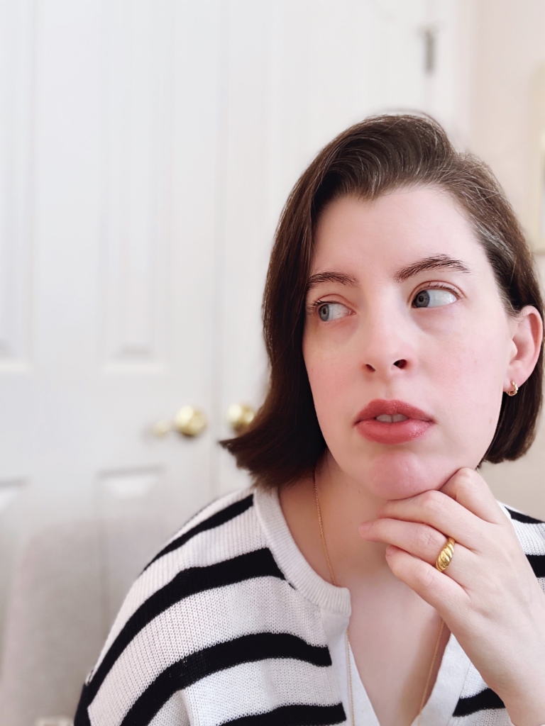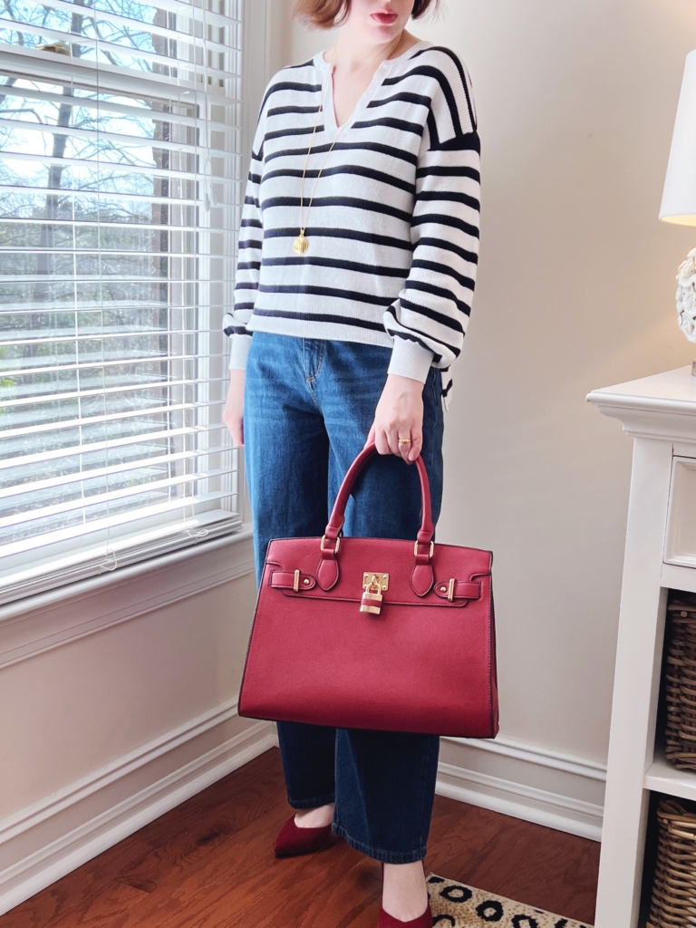 Since I was going with an elevated yet relaxed look with this outfit. I paired my denim with a pullover navy and white sweater I picked up last spring (although I dream of the one from Sezane! I love it when looks can be worn from season to season.