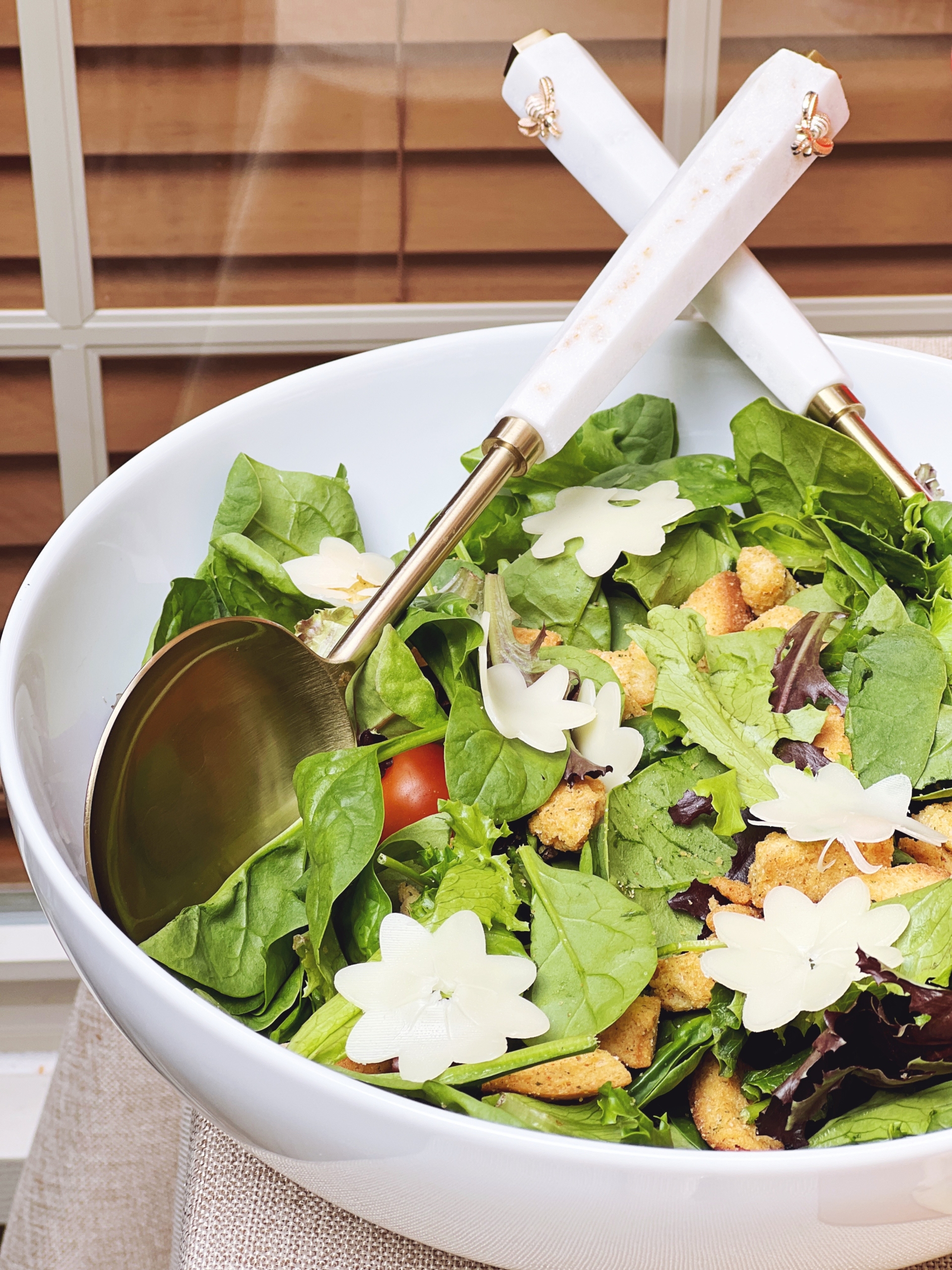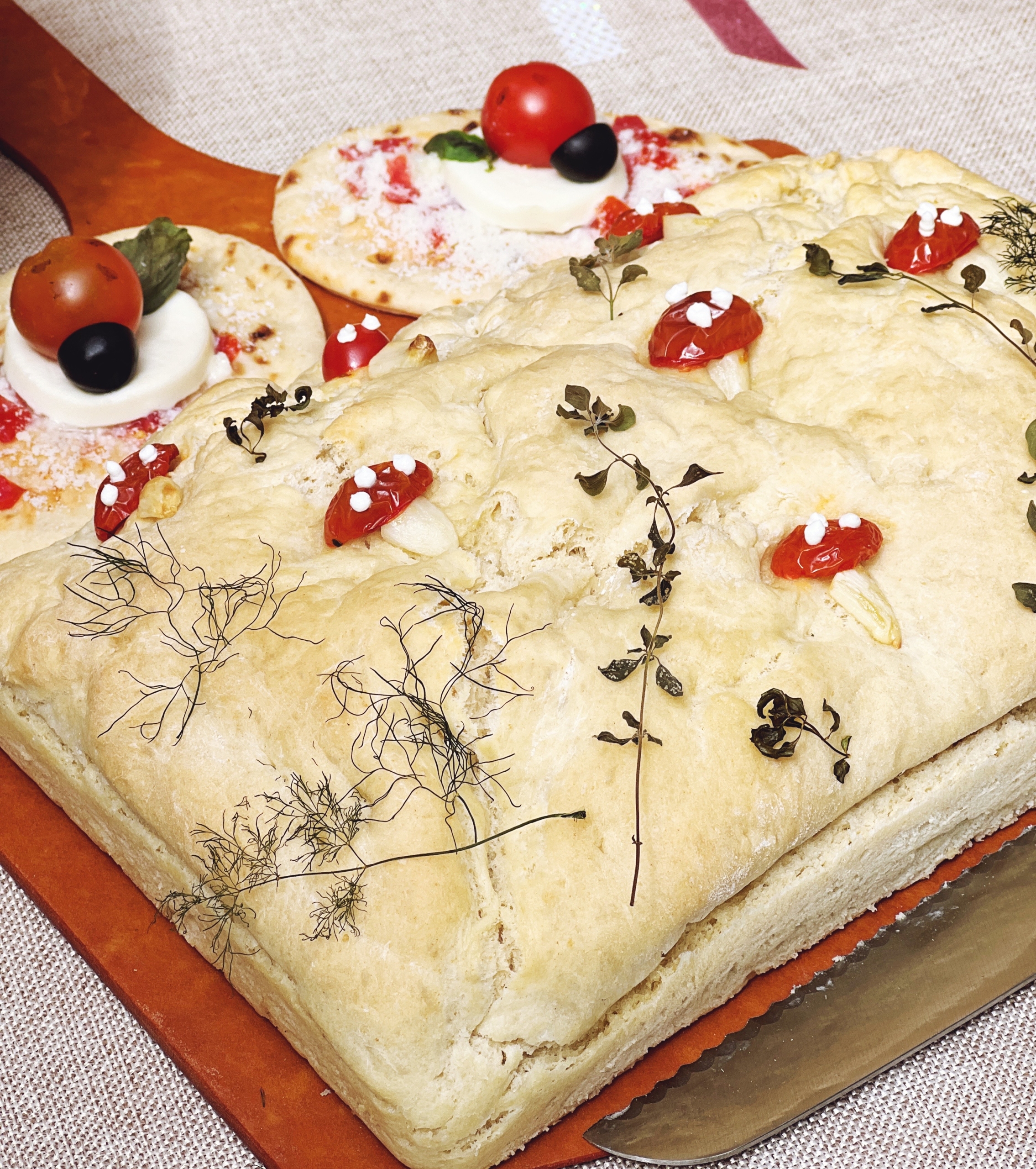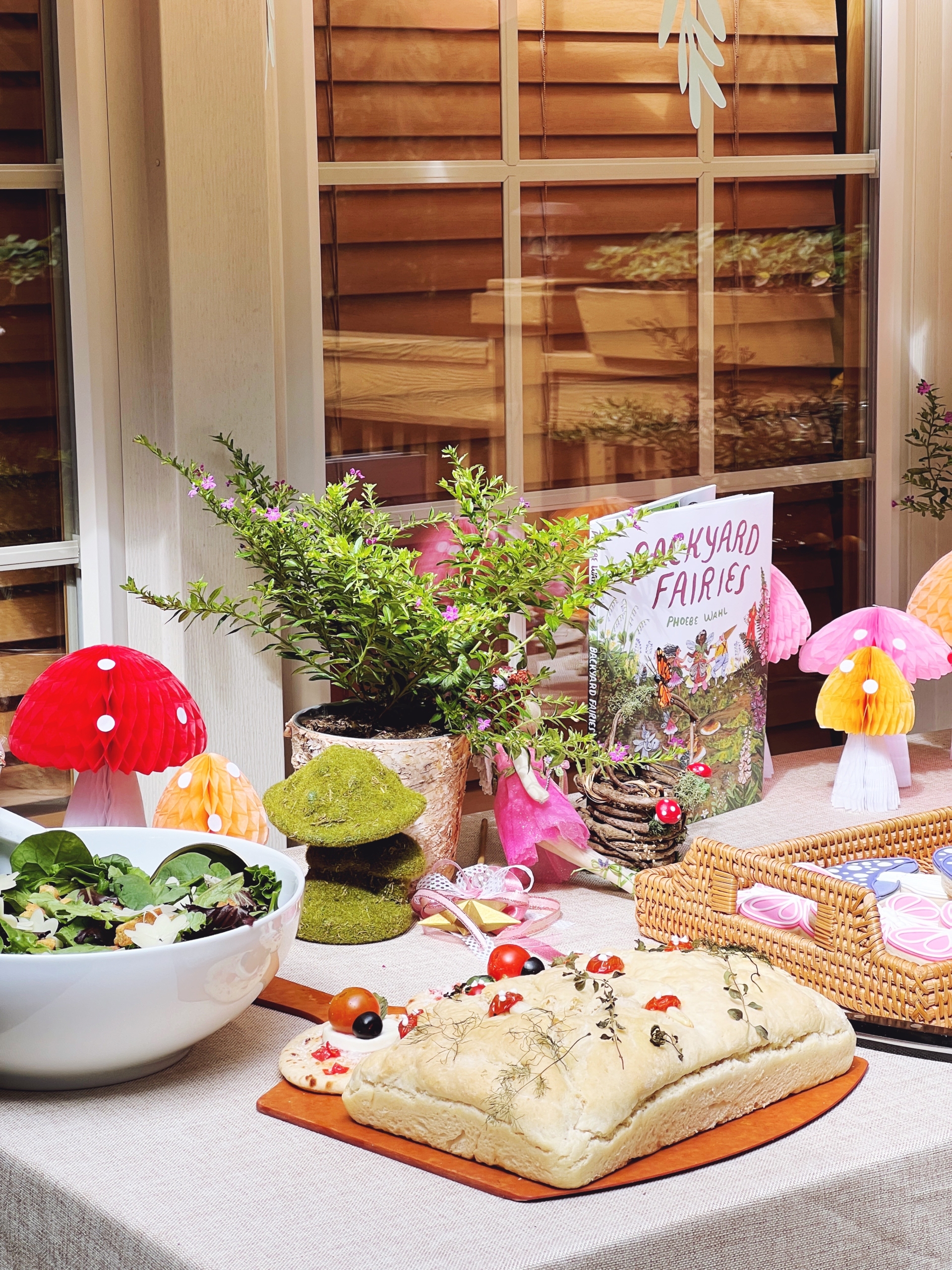 A simple salad with hand-cut cheese flowers, and a loaf of the most delicious focaccia bread with cherry tomato and garlic mushrooms and herbs from our garden. The focaccia recipe is by Gordon Ramsey and then we ‘decorated’ it to make it fit with the fairy theme.