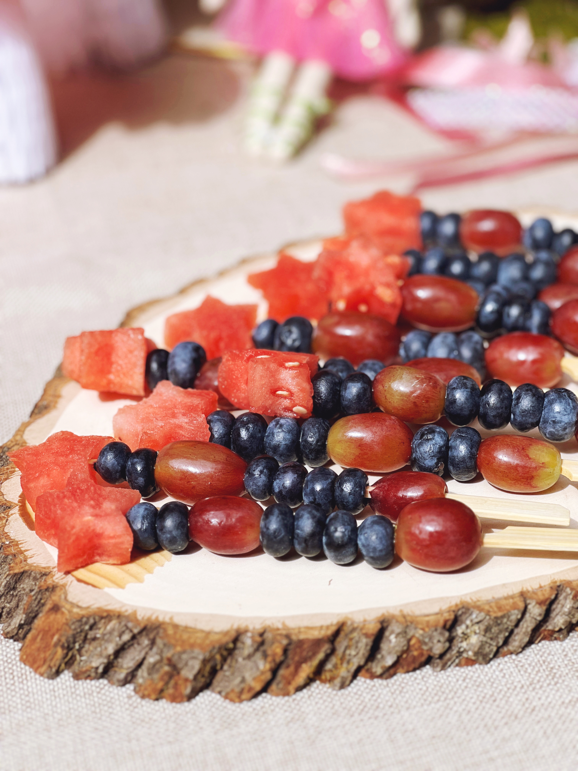 These fruit skewers take no time at all to make, you just need a star cookie cutter to make the watermelon stars and then add freshly washed blueberries and grapes.