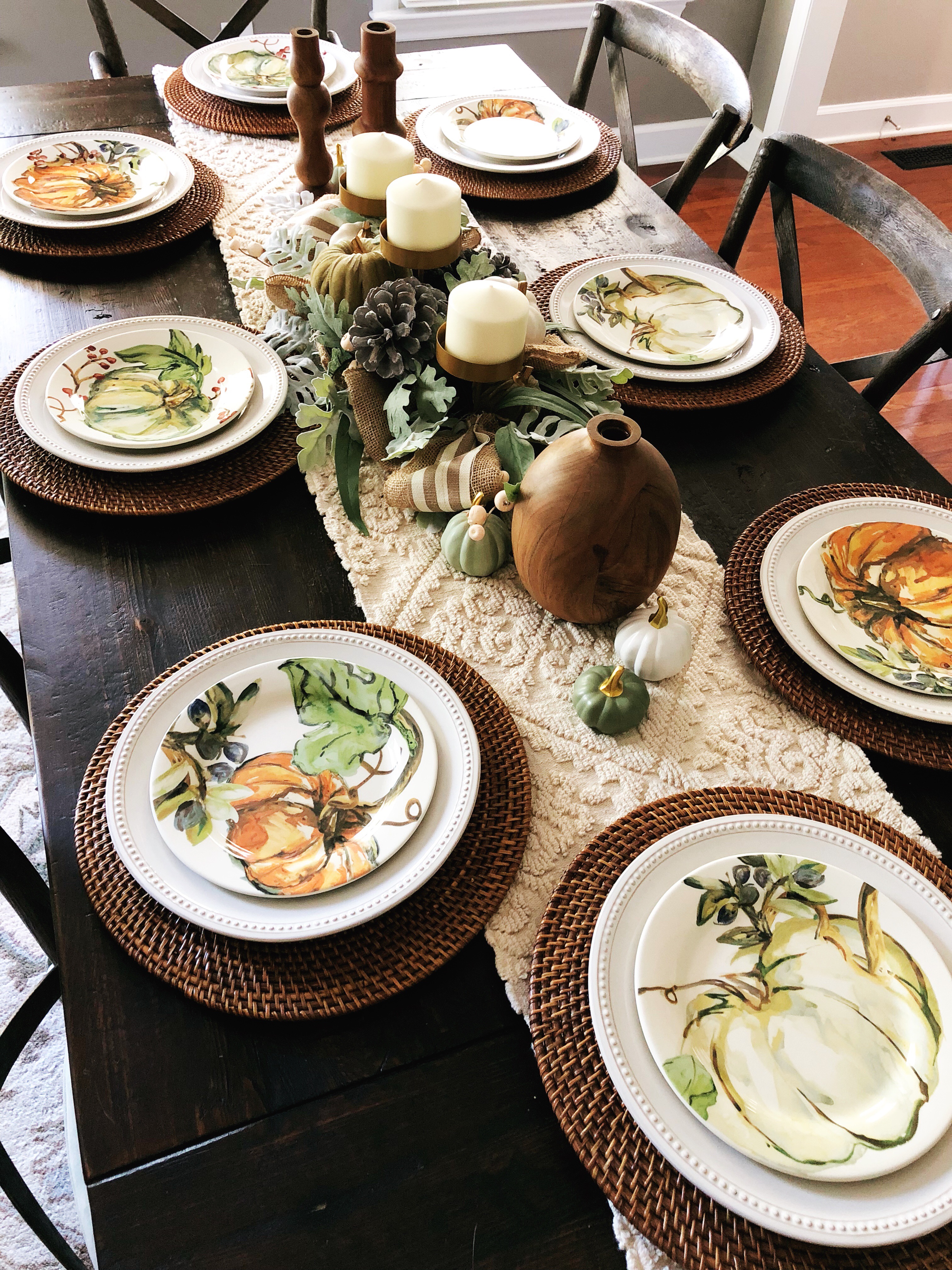Last year, I shared the beautiful tablescape that my sister put together along with some of the fall decor from around her home. This year she not only gave a little update to her dining room decor, but she also laid out a beautiful tablescape on her kitchen table as well.