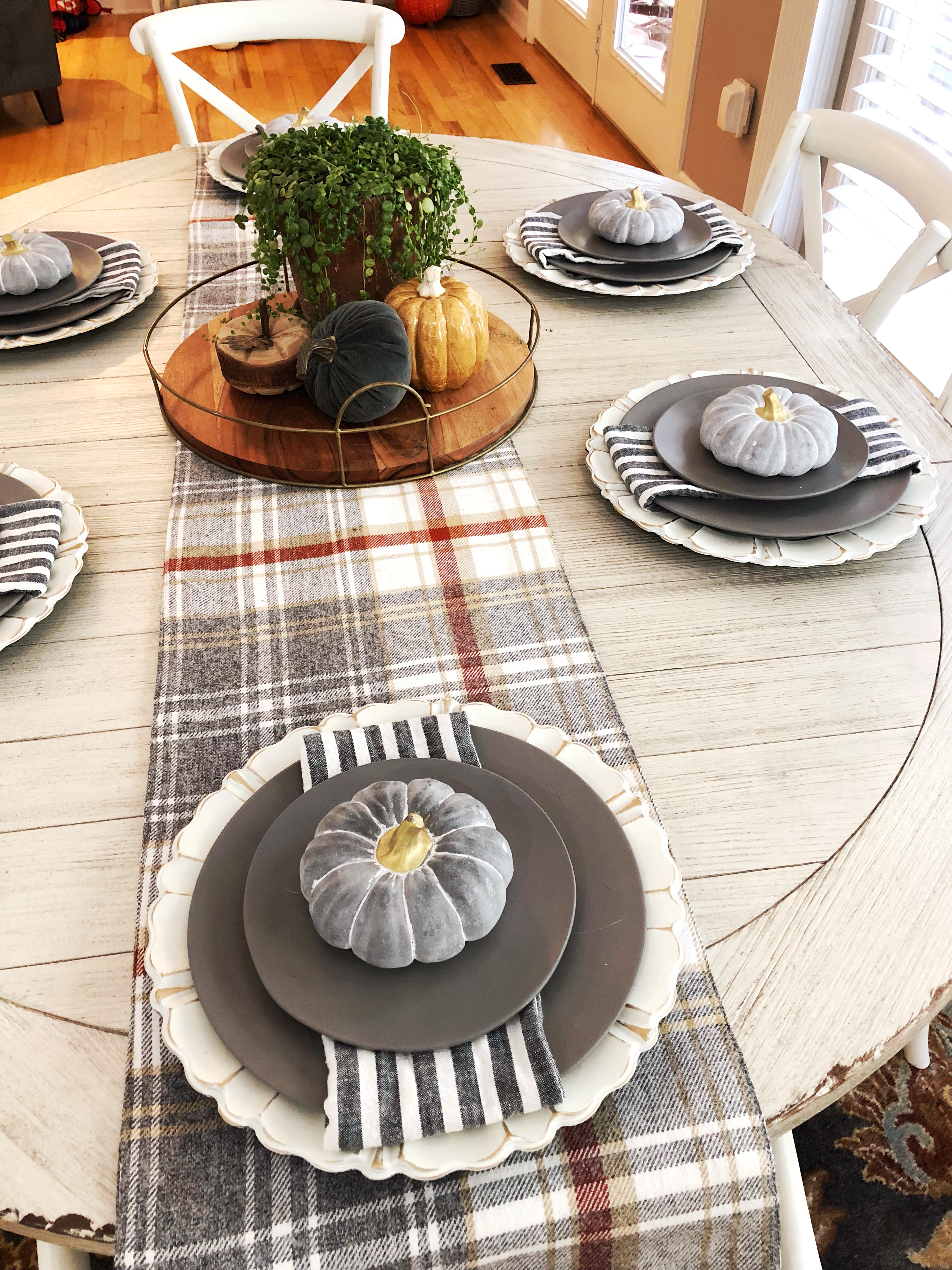 For the kitchen my sister used the plaid table runner from last year (you may have seen pictures of it in the Succulent Pumpkins post I posted last October.) She also added grey plates and beautiful concrete (yes, concrete) pumpkins.