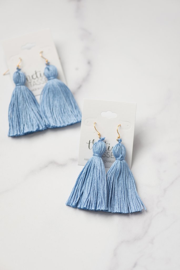 “When Mimi received a pair of earrings as a birthday gift from her sister, she was inspired to put her own twist on her earring collection and took to making tassels. Following her undergraduate education at College of Charleston, The Tiny Tassel was born. What started as a creative outlet in the summer of 2015, evolved into a jewelry, clothing and accessories brand based in Charleston, SC. Mimi creates each tassel by-hand and also designs handmade garments with her mom, while her sister helps to design various styles included in the Curated Collection. Inspired by her favorite city, Mimi names each piece after a street name or special place in Charleston. Our collection is made up of bright colors and classic prints, which Mimi hopes will bring joy to others with her statement pieces.”