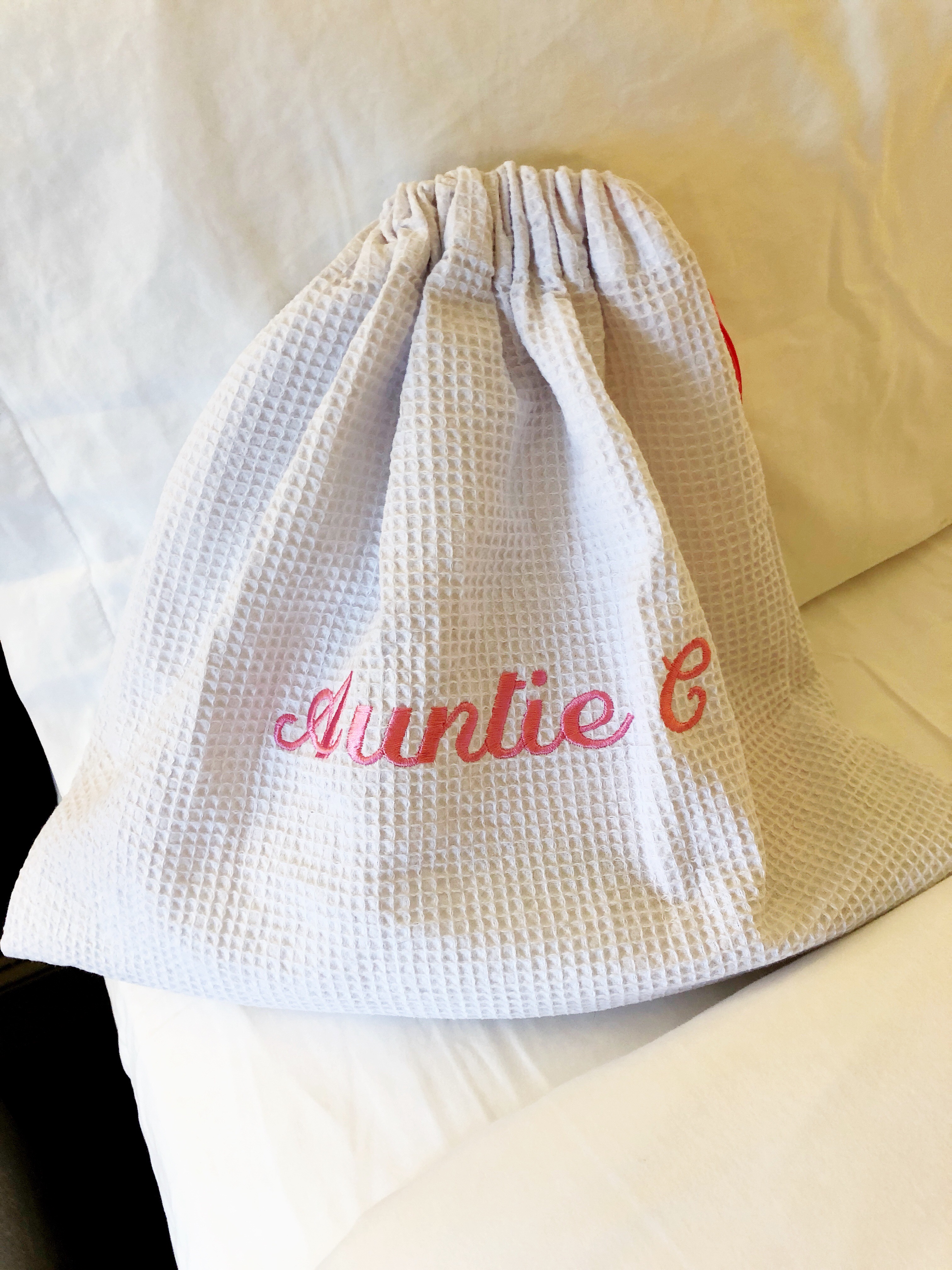 To celebrate our stay, and to continue my sisters baby shower festivities, we brought along a special ‘swag’ bags that we’d put together. After all, having a one of kind monogramed bag complete with slippers and a few spa essentials is always a good way to celebrate a girls night.