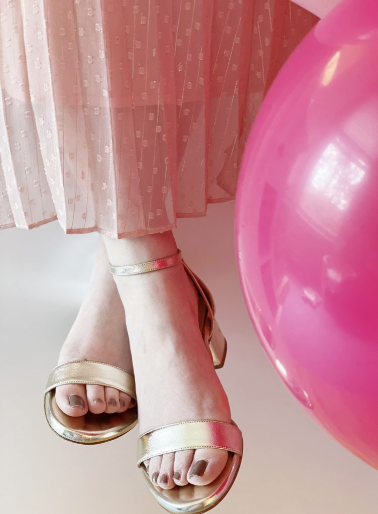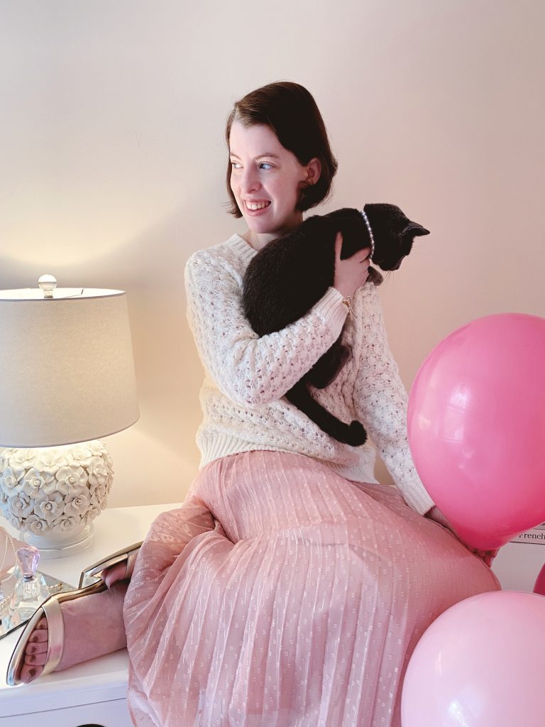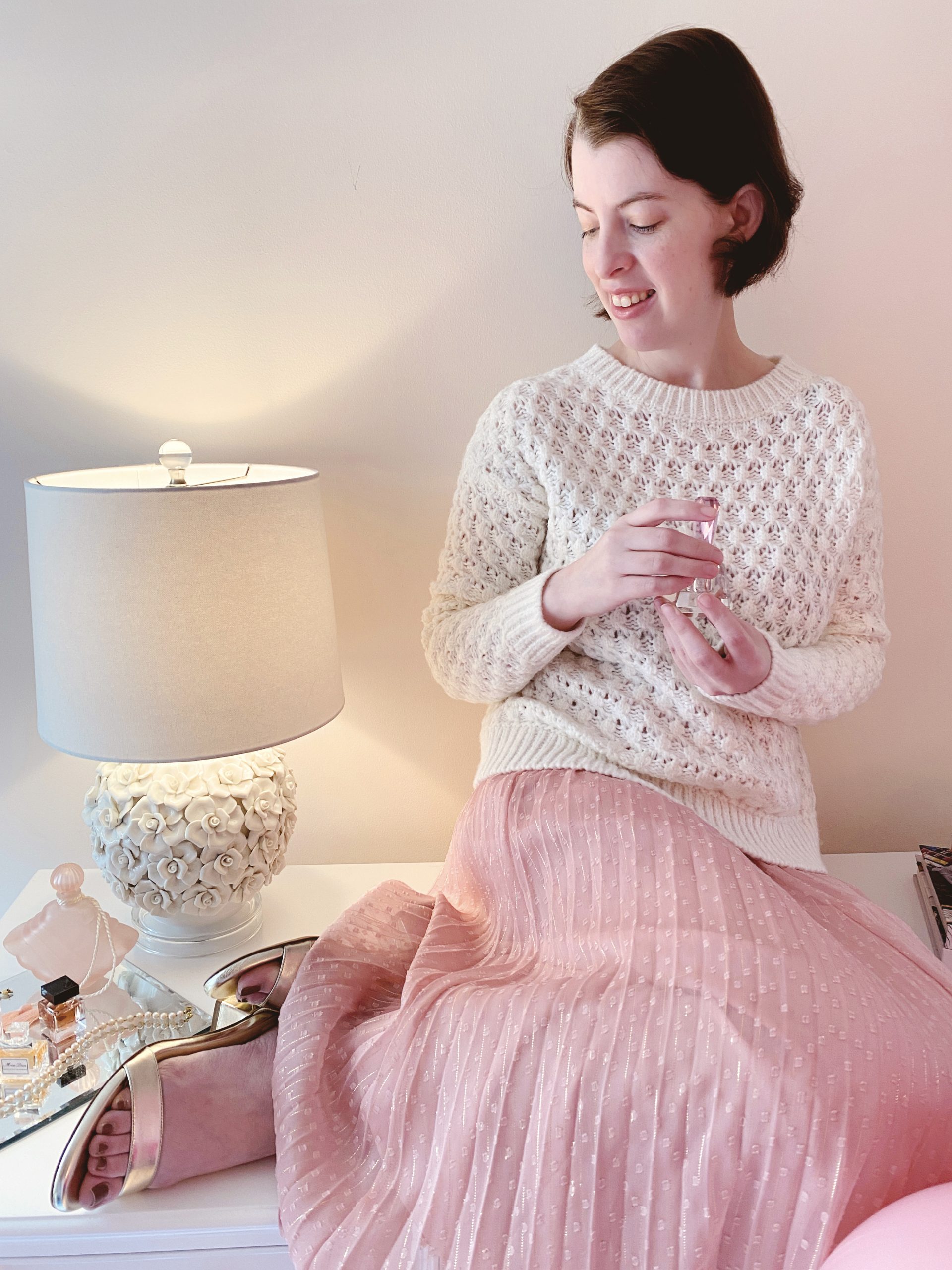 Whether you’re planning on celebrating with your immediate household (or social pod/bubble) wearing an outfit that is the perfect mixture of cozy and glam is an absolute must. For my first party look of the holiday season, I decided to pair one of my favorite outfits from last season with my Sarah Flint Perfect Block Sandals. The look is a mixture of coziness with a luxuriously soft oversized (and still on trend one year later) sweater in winter white, and a pleated skirt in the perfect shade of pink and classic/feminine accessories.