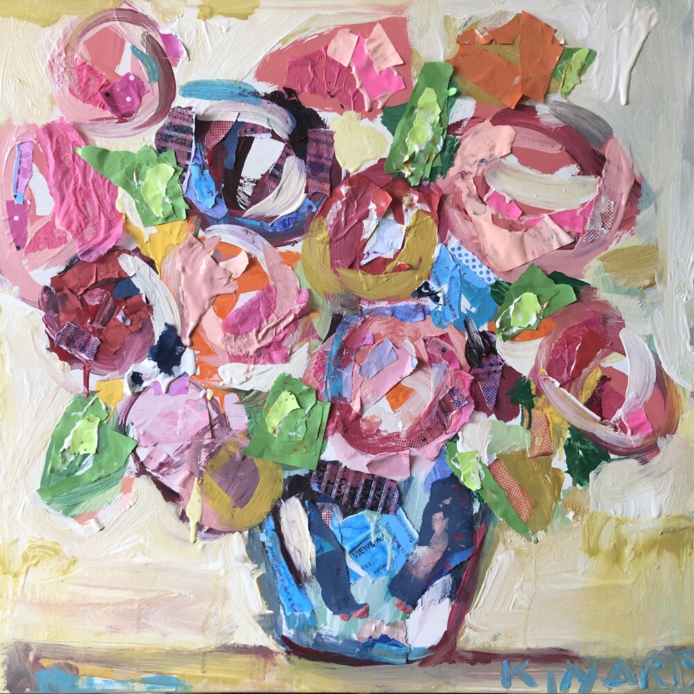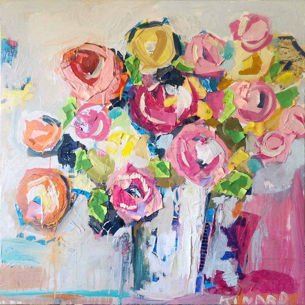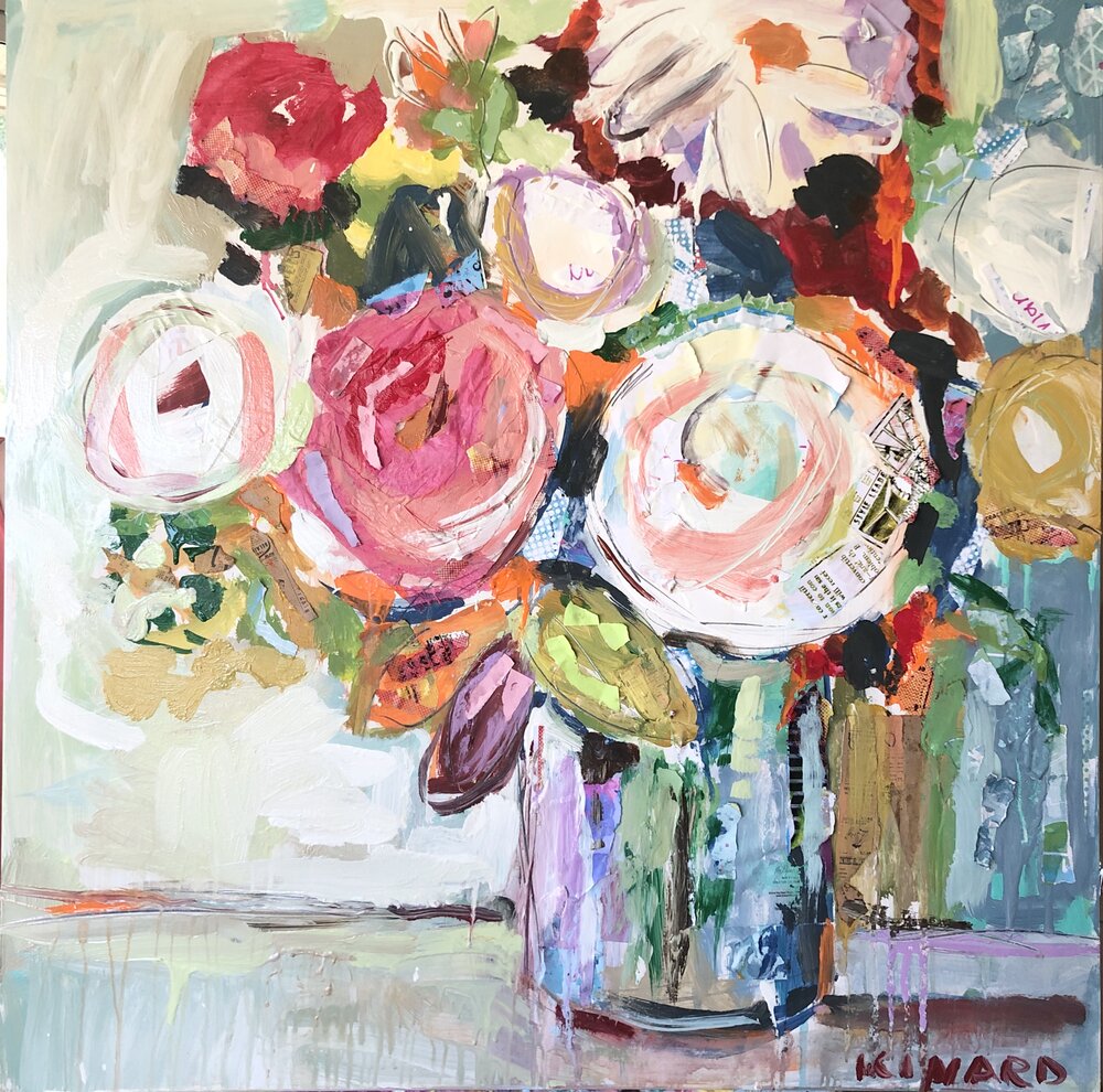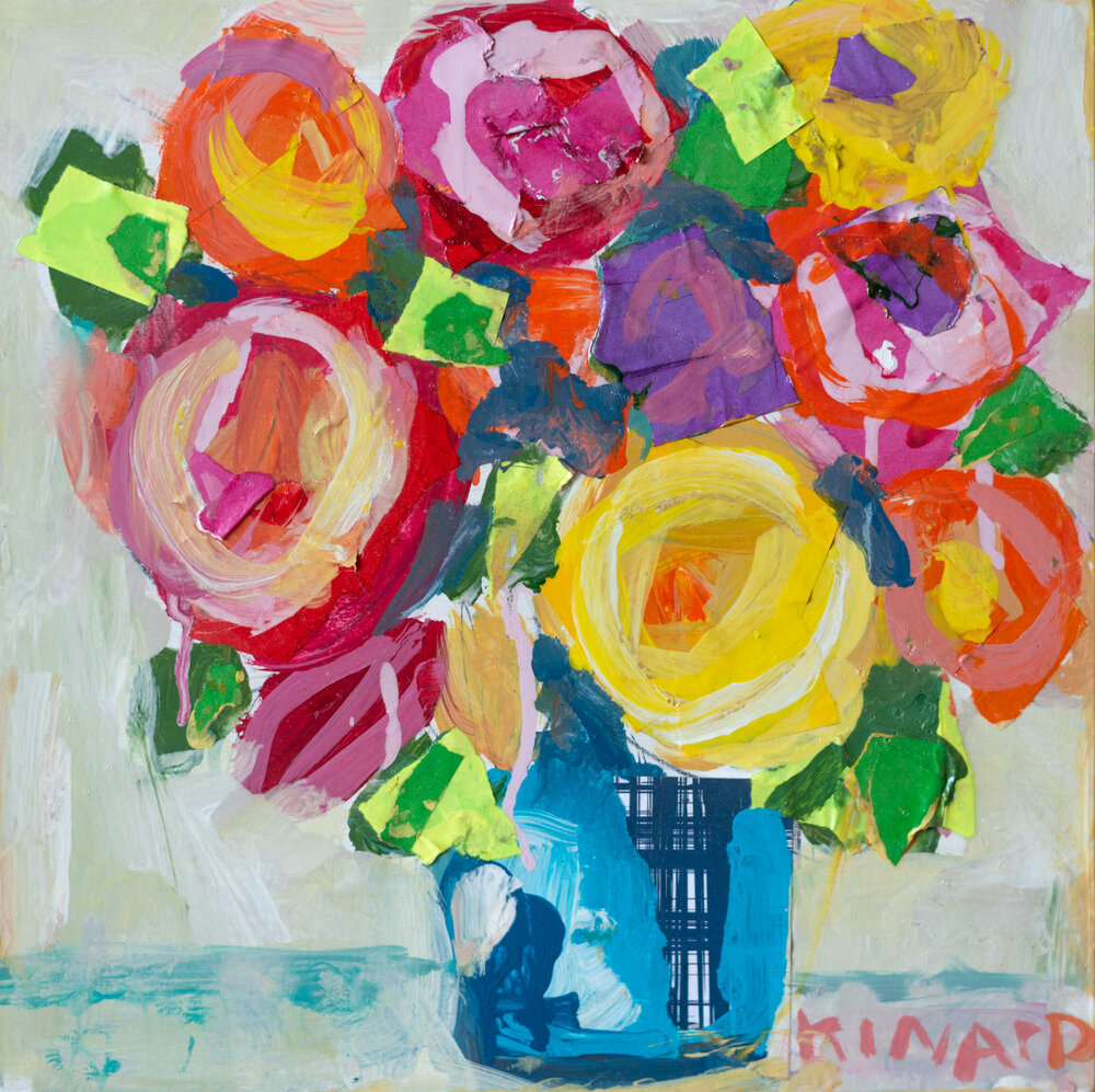 If a Southerner talks music, weaving symphonies of vibrant wordplay, I would like to think that I paint similar, creating rich compositions with impressions of Southern life. The abundant flowers and unique cultural traditions of the South sing through me, into my hands and onto the materials that shape my visual song. I attempt to capture the joyful, layered character of the South, working from both childhood memories and life.Flowers are the main subjects of my work, which reflects the bounty of colorful plant life both outside and in the homes of the South. In keeping with Southern tradition, there was almost always a fresh bouquet of flowers on the table of my childhood home. The frequent presence of flowers made a lasting impression—so much so that the floral still life would become the central focus of my work. – Christy Kinard