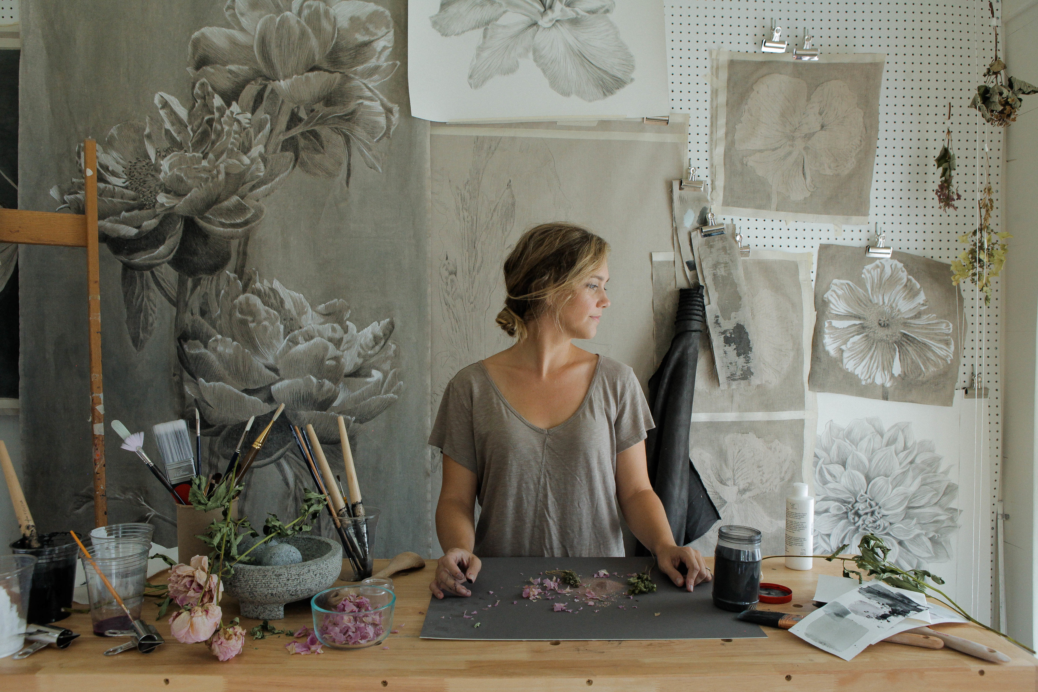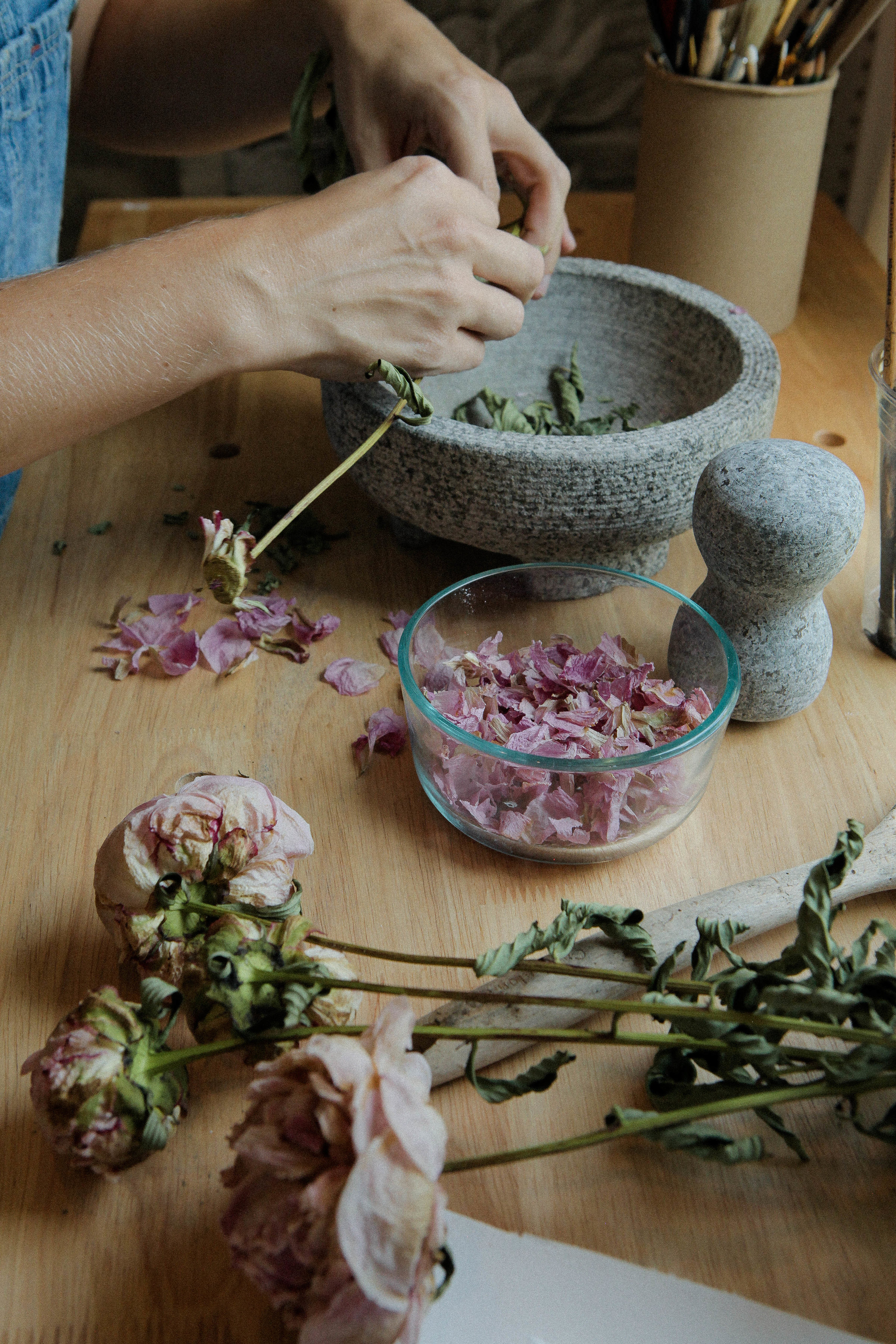 Every paint is a pigment (color) + a binder (glue) + a solvent (to make it fluid). With this equation in mind, you can make paint! In an effort to simplify my practice, I decided to make my own paint. I use charcoal and ground botanicals as the pigment, egg yolk as the binder, and distilled water as the solvent. I have a strong connection to the flowers I photograph for my linen pieces. Being able to grind them into paint and then paint them back into their portrait pulls it all together and makes my work make sense.
