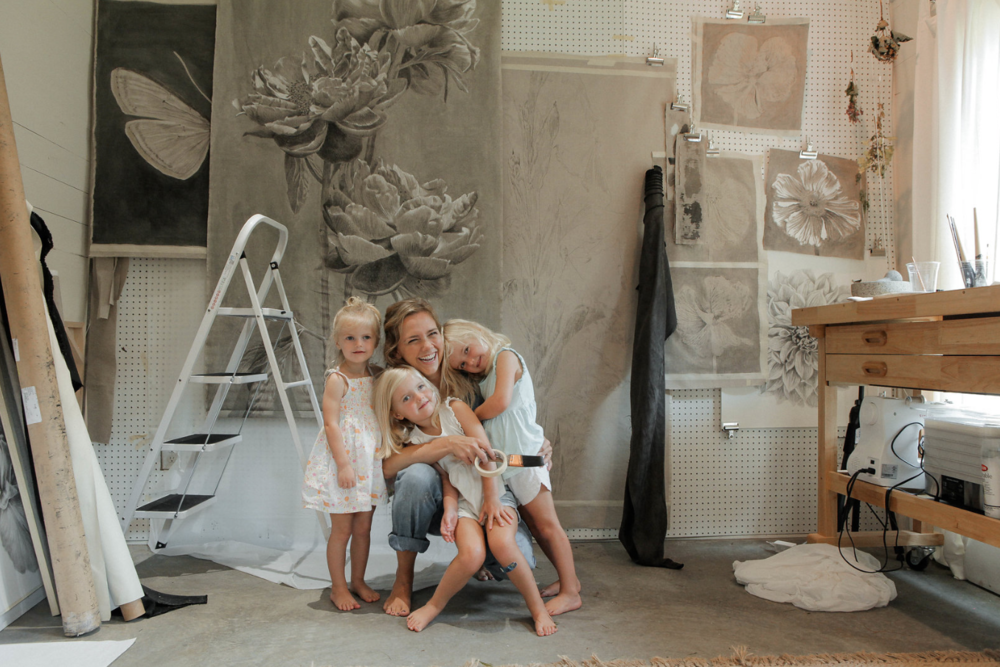 I’ve been following along with Birmingham, Alabama-based artist Emily Morgan Brown’s work for years via Instagram. Her floral tapestries are so detailed that you can almost smell the flowers just by looking at them. Emily who was recently featured in the June/July edition of Garden & Gun is also mom to three adorable little girls (identical twins and their little sister).