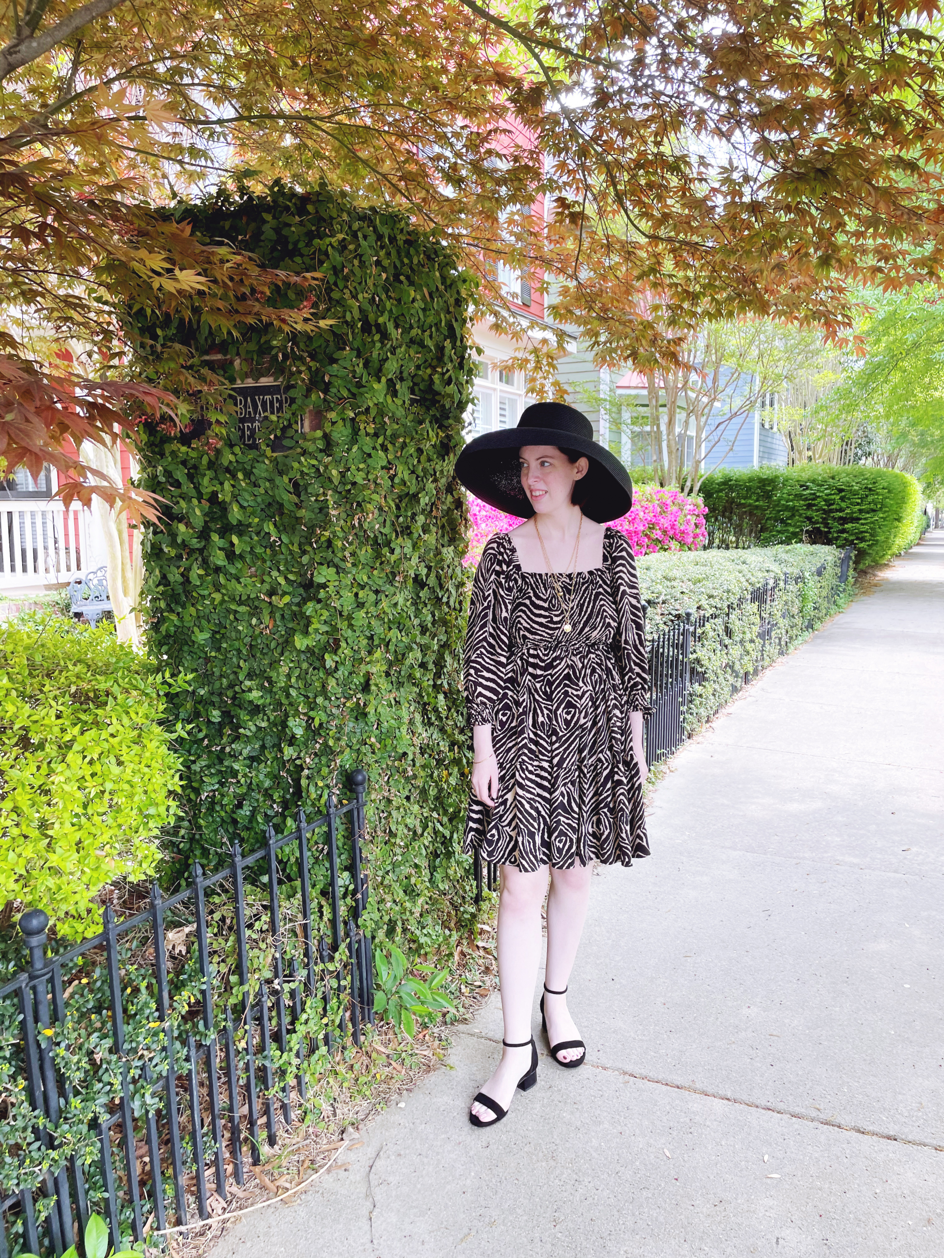 Savannah Zebra Mini Dress (Cresent, similar from Mango) // Perfect Block Sandal 30mm in Black Suede (Sarah Flint) // San Diego Hat Company (old, similar here) // Double Chain Necklace (Loft, old, similar here)