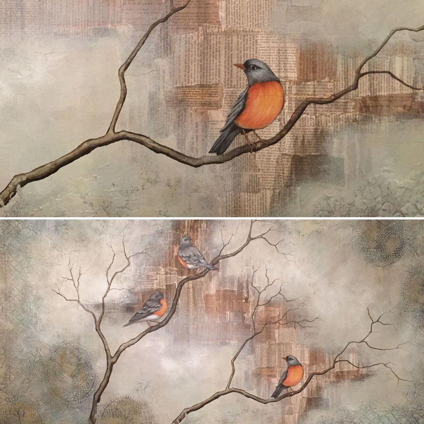 The best inspiration for me comes from when I am praying, reading the Bible, or just simply thinking about what I am going through in my everyday life. If I’m having a hard time or feeling sad, I generally see it as a narrative on the panel. I visually see my emotions, struggles, and stories played out on my painting surface. I’m also inspired by my original training in graphic design and sometimes paint things that make a beautiful design, using nature as inspiration as well. I do many paintings of birds and trees as well.