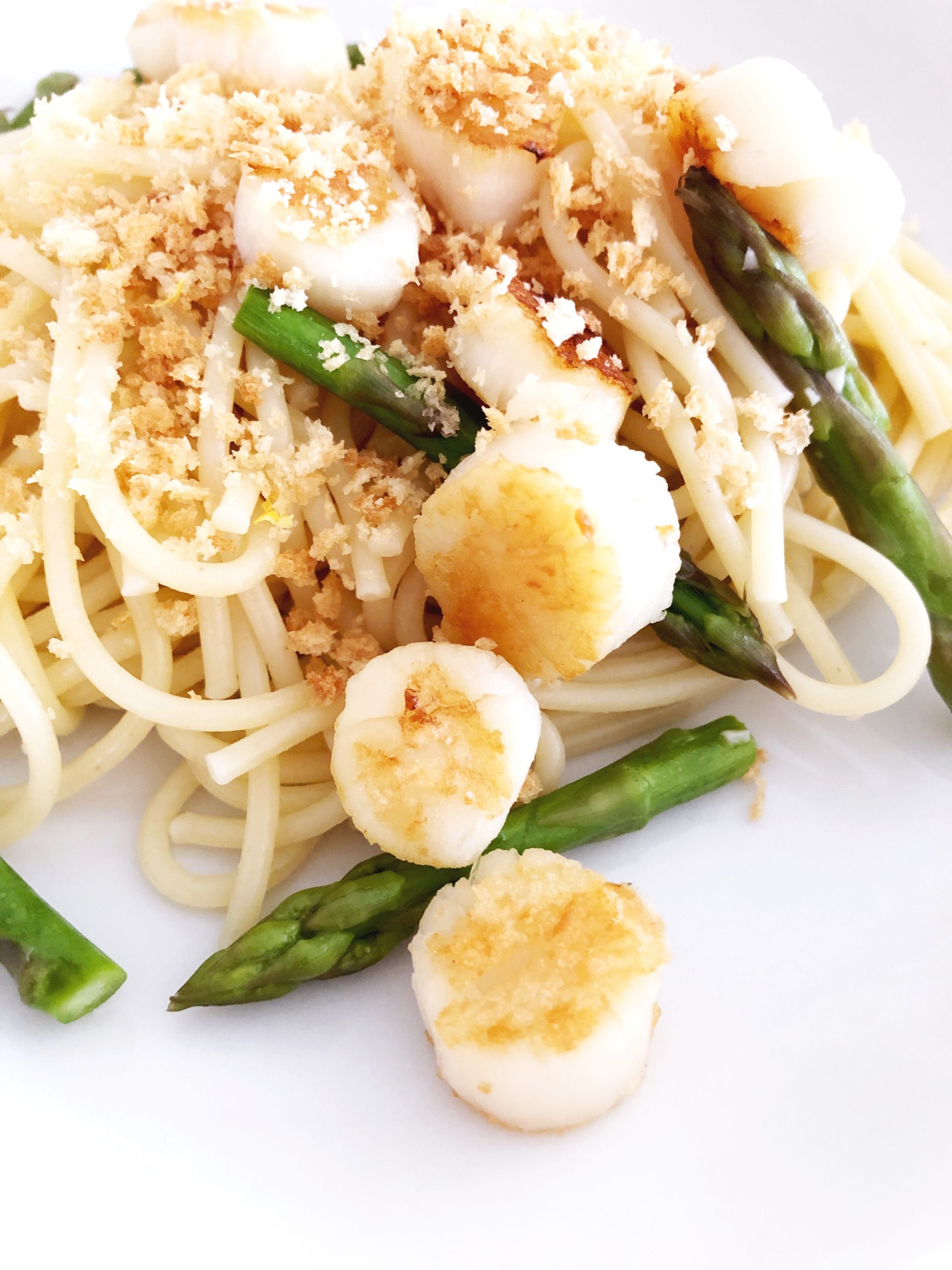 Bay Scallops, Pasta & Steamed Asparagus with Toasted Breadcrumbs