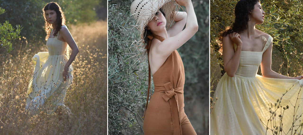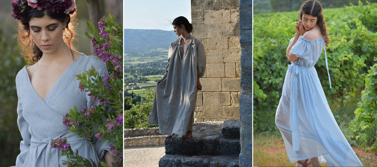 From the raw sketches, I work with three amazing couturiere here in Provence to bring the designs to life. All of my collections are proudly produced here in Provence and I work very hard to source sustainable and natural materials. My collections are known for their very high quality linens. To keep to my sustainable values, most dresses are sold on a pre-sale basis so that we can plan stock accordingly and never have waste. I also photograph all of my collections myself so I can bring the vision to life in the beautiful landscapes of Provence, which is a dream job come true for me.