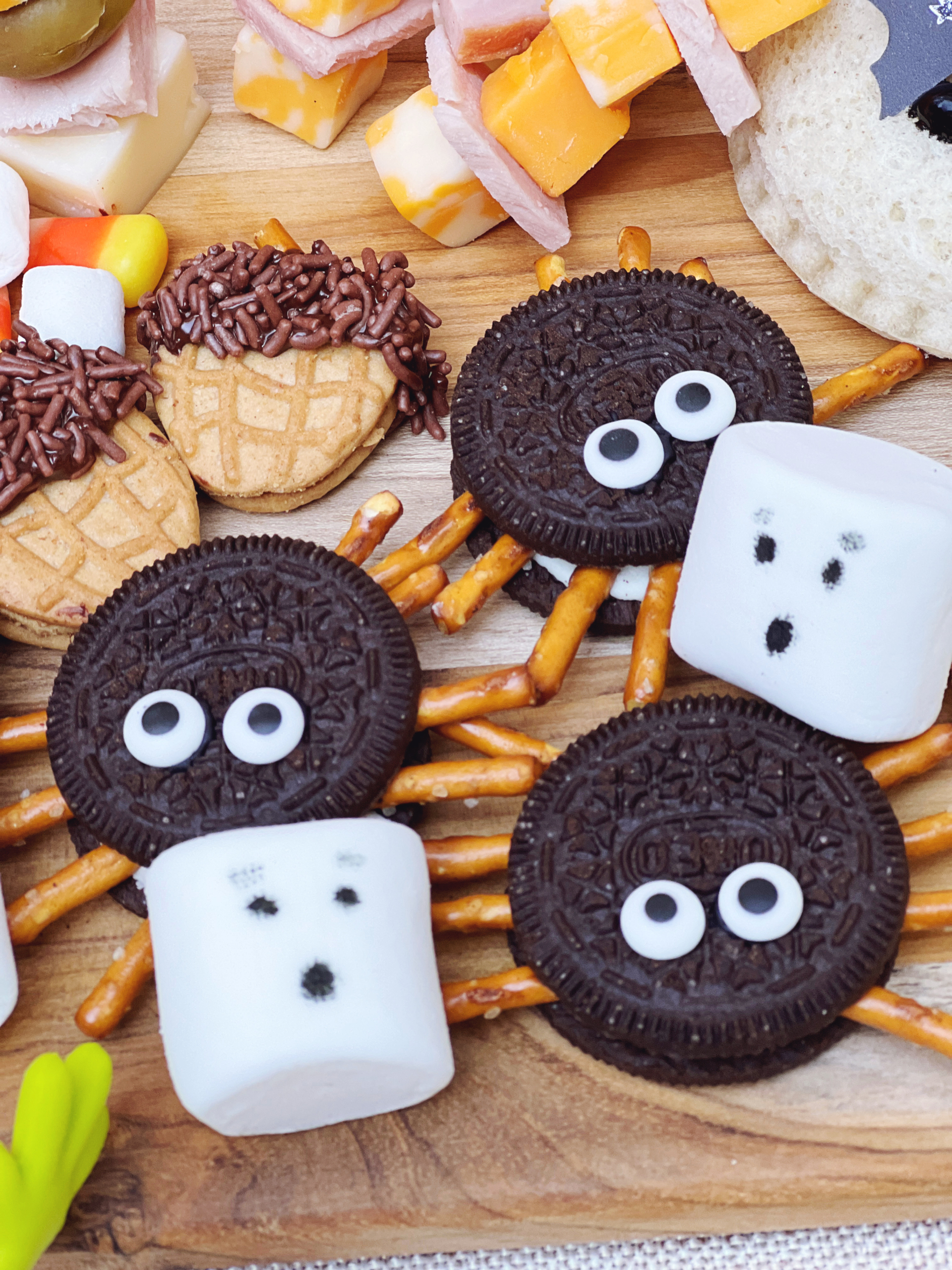 The acorns were created with halved Nutter Butters with chocolate sprinkle tops and pretzel stems. For more spooktacular fun, we made Oreo spiders and ghostly marshmallows.
