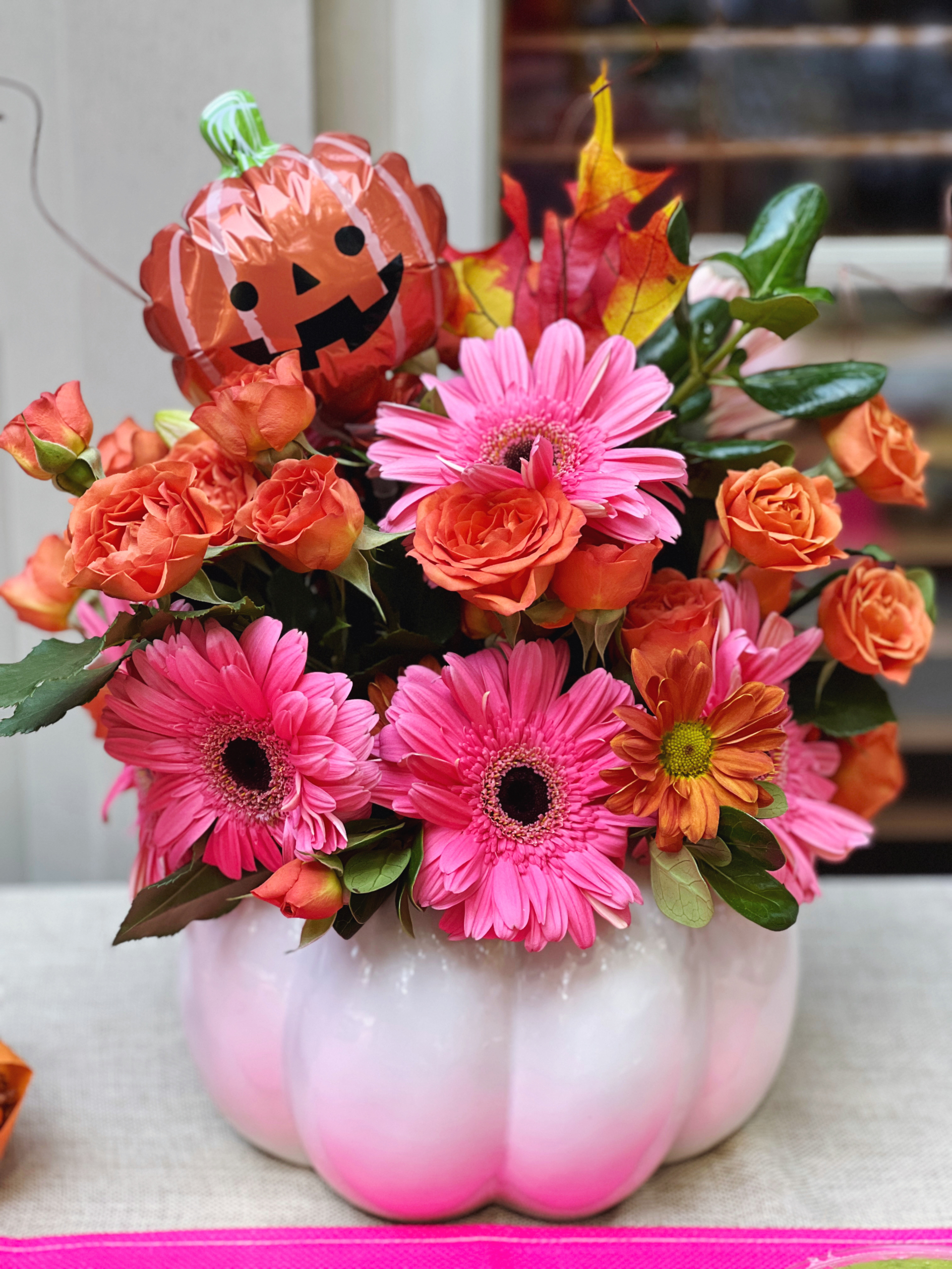 Our color theme was pink and orange, but we decided to make a fun little ‘spooky’ bouquet for the food table as well.