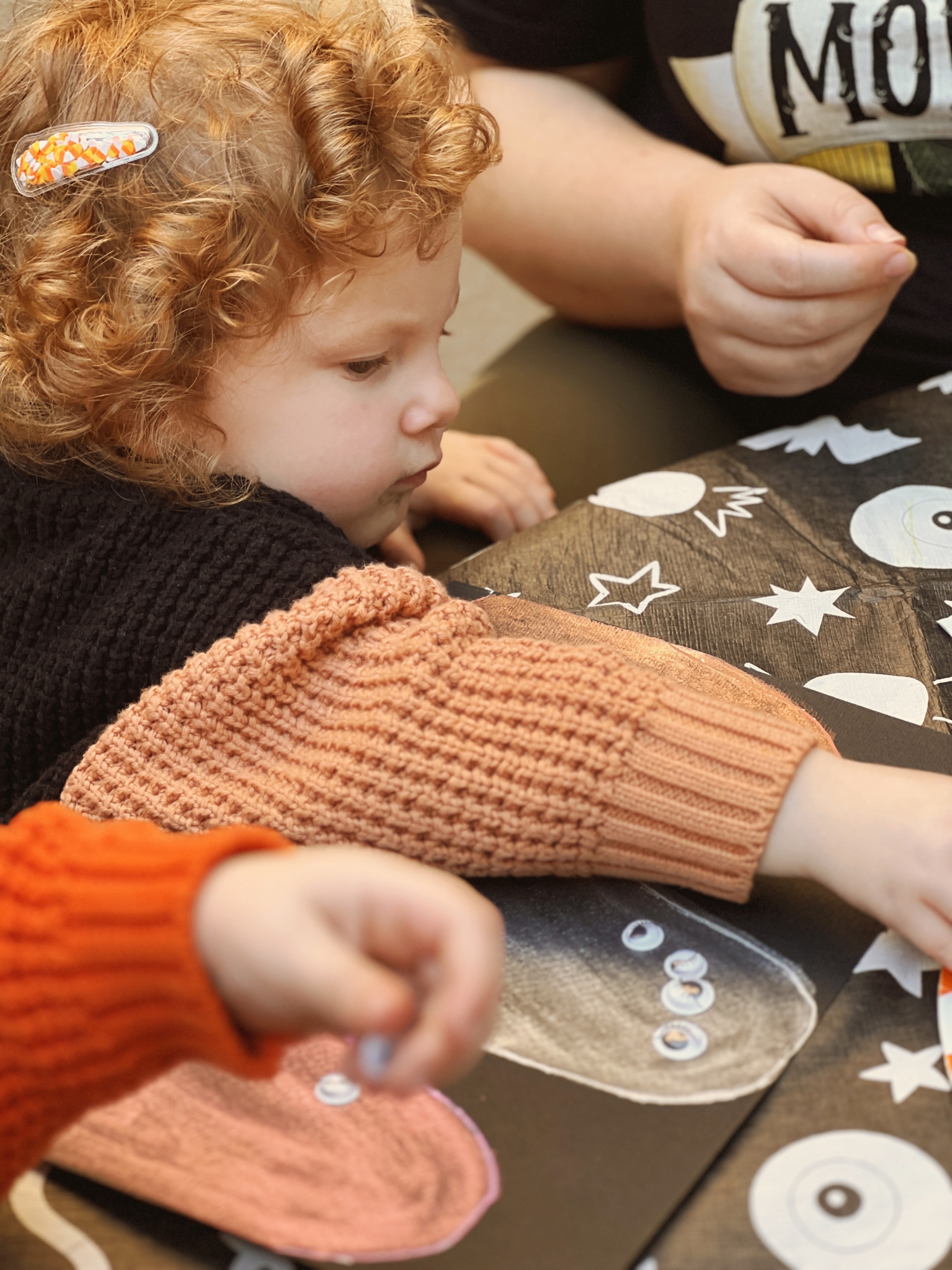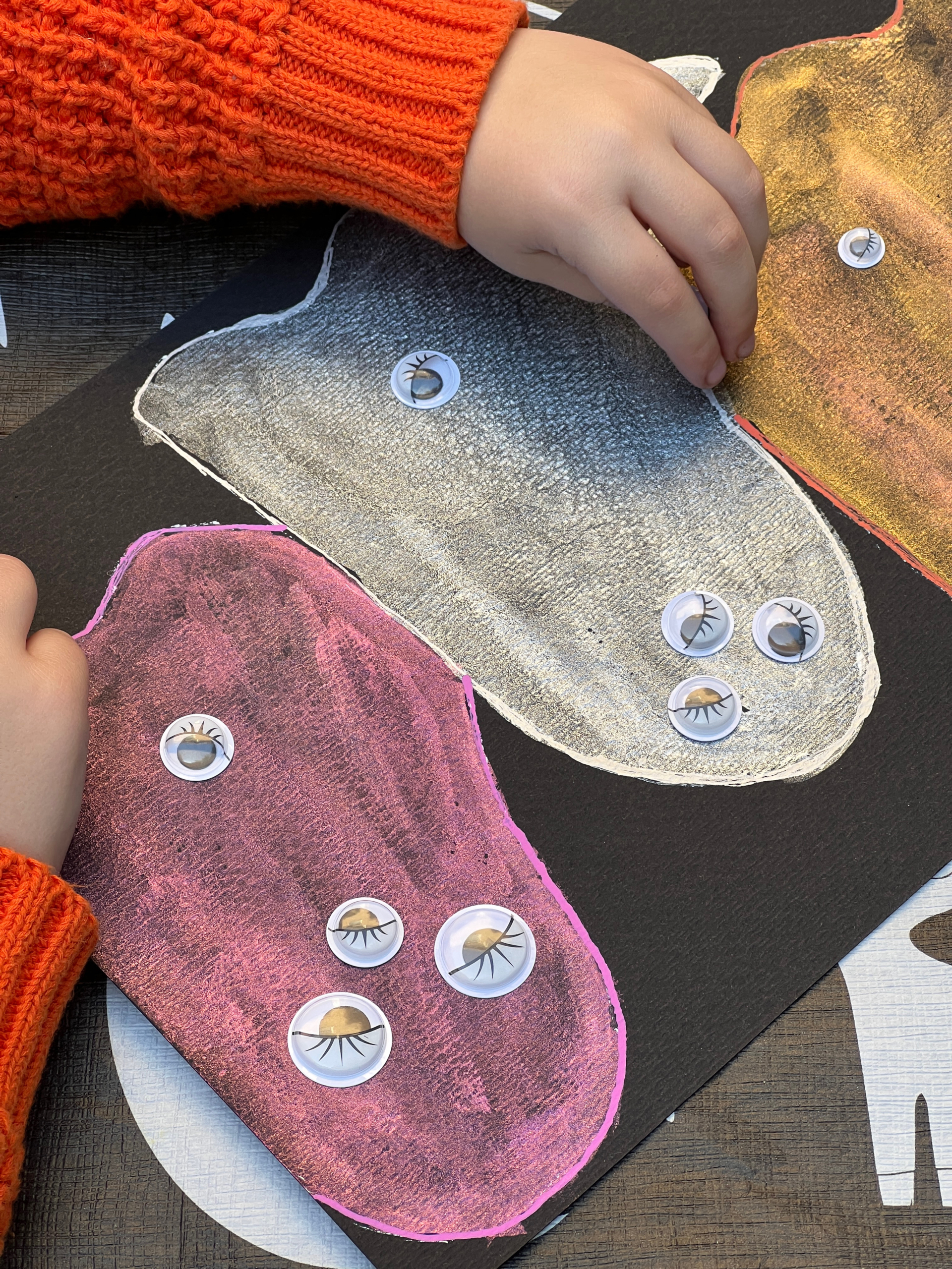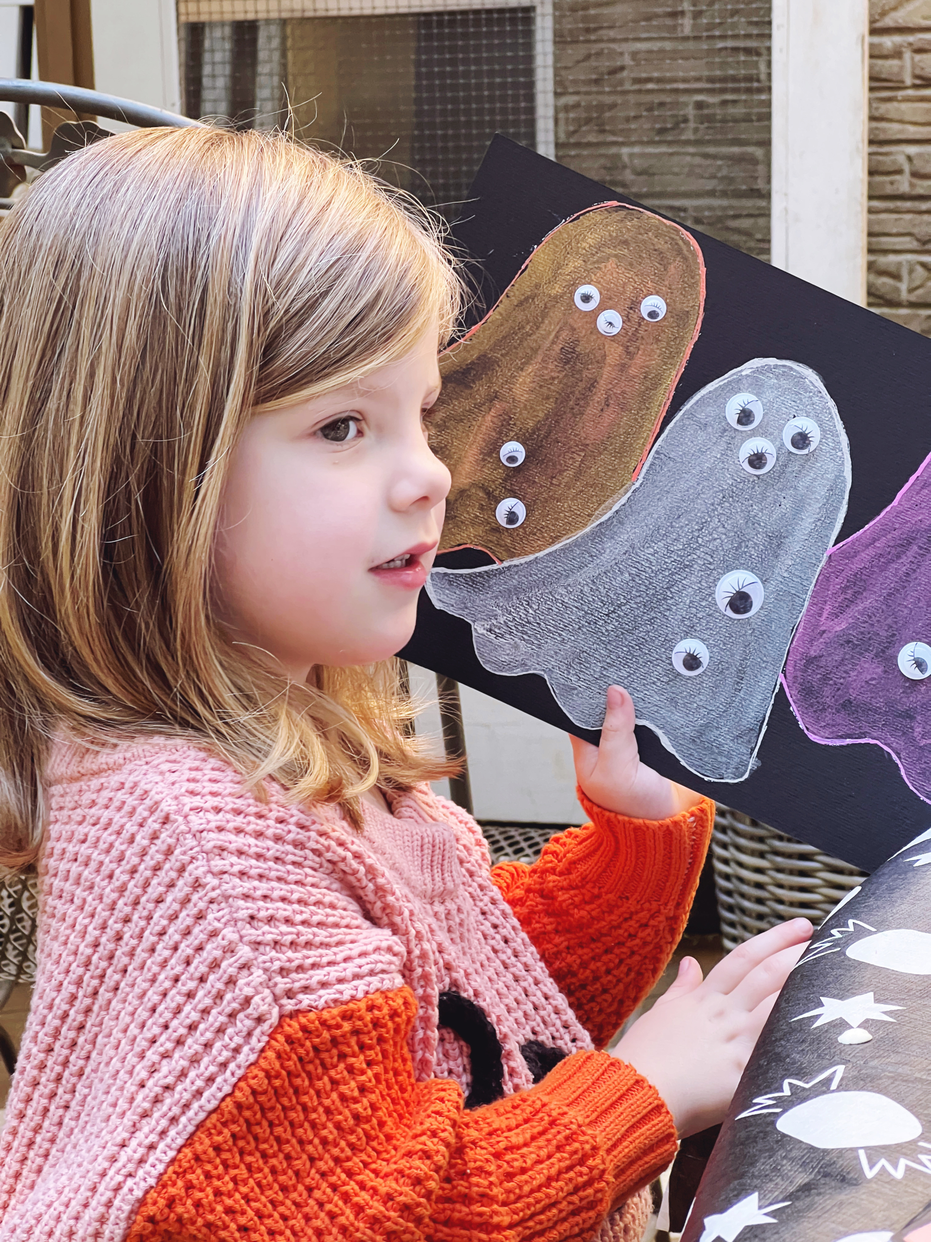 Our Halloween art project for the girls was such a fun one. My mom painted ghosts in metallic paint for both of the girls to add googly eyes to!