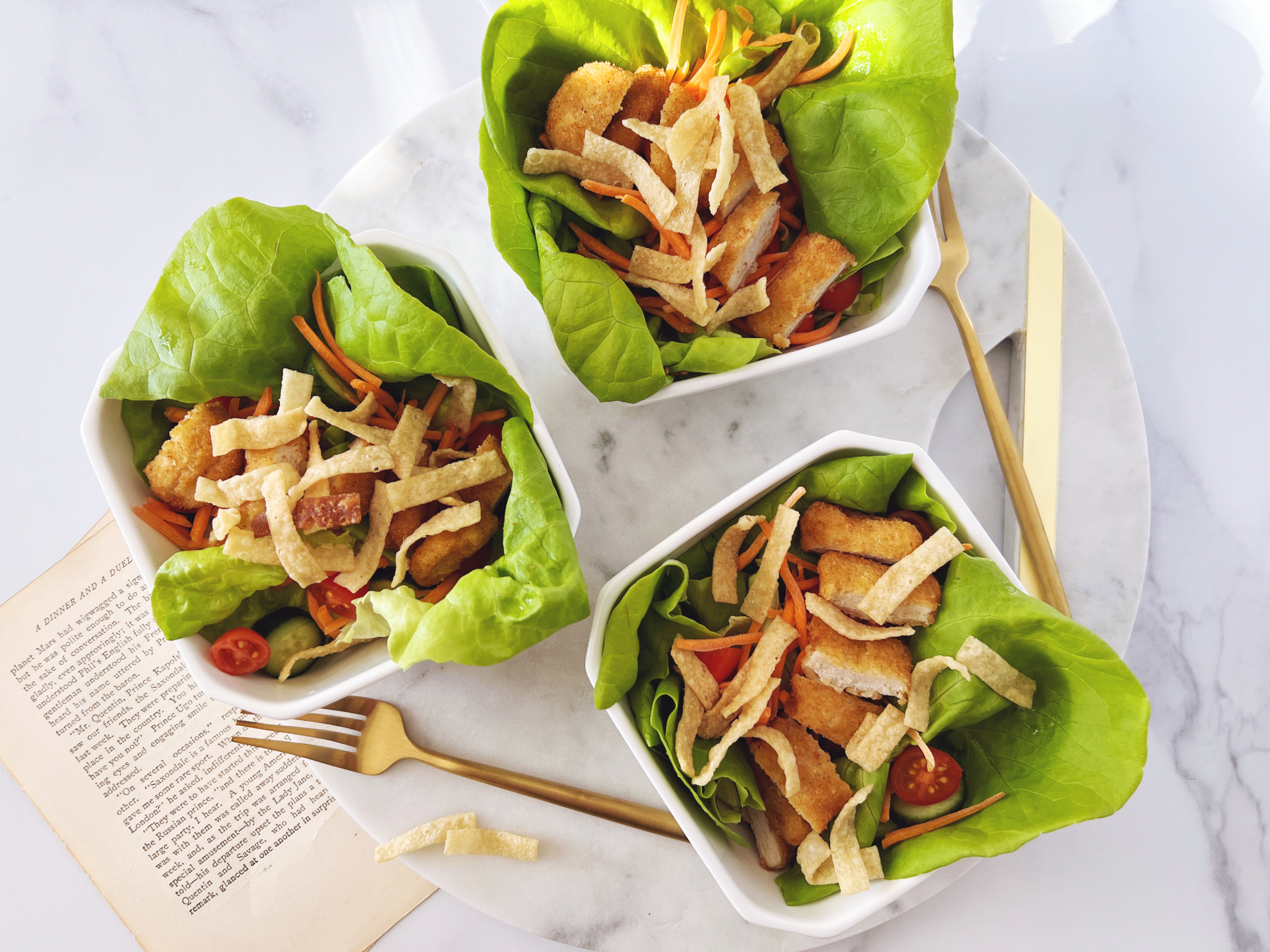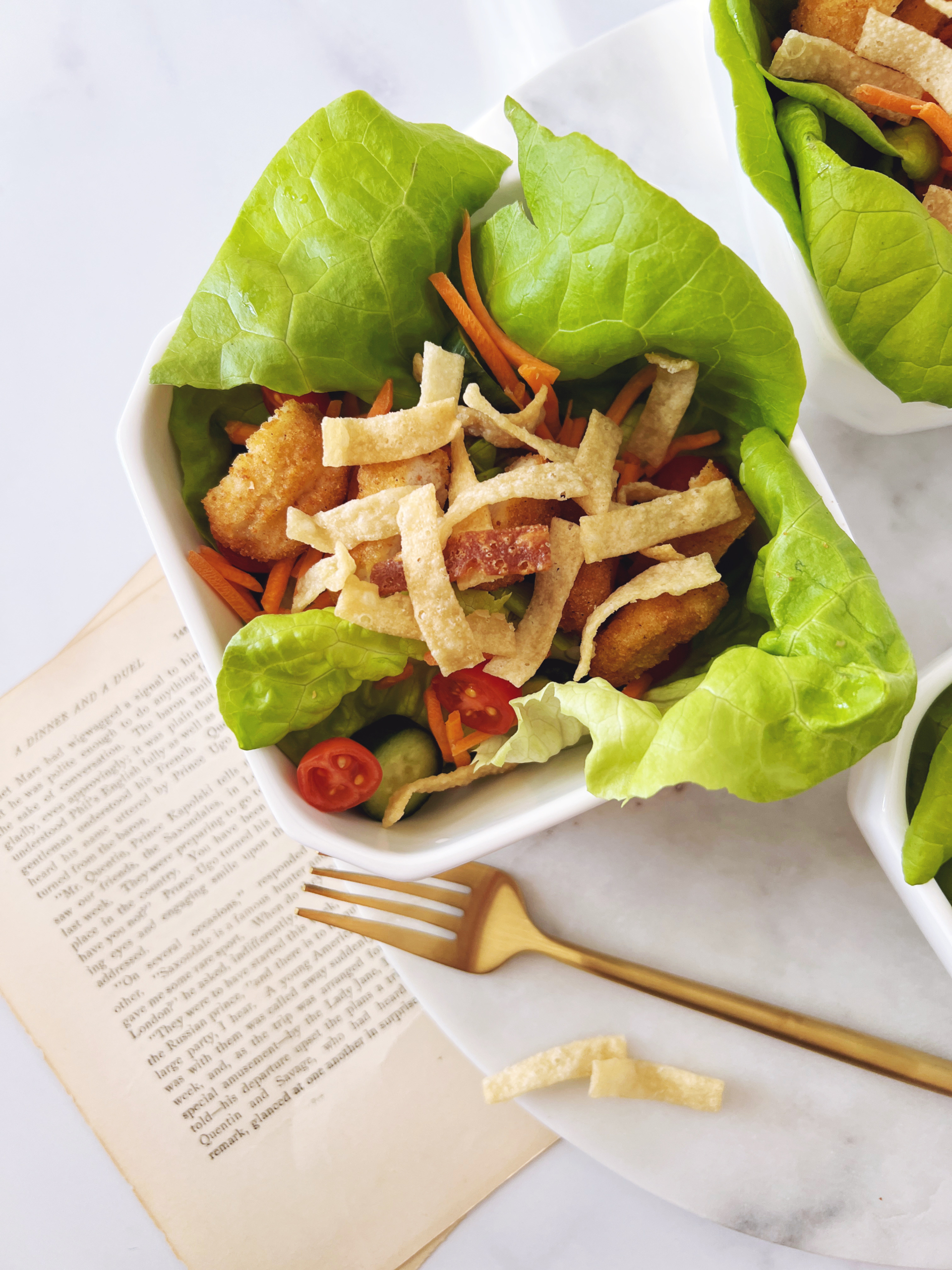 For this salad, you can go with a variety of different lettuces depending on your personal taste, but I’m obsessed with Butter Lettuce (the flavor and the texture) so it’s one of my go-to’s for creating a nice leafy salad bowl. This salad is predominantly veggies (and if you sub tofu for the sliced chicken nuggets it’s completely vegetarian), but I really like the mix of flavors of this salad as a whole. The wonton strips add a nice bit of crunch and the Sesame Tahini Dressing adds the perfect bit of flavor and ‘bite’ to this salad.