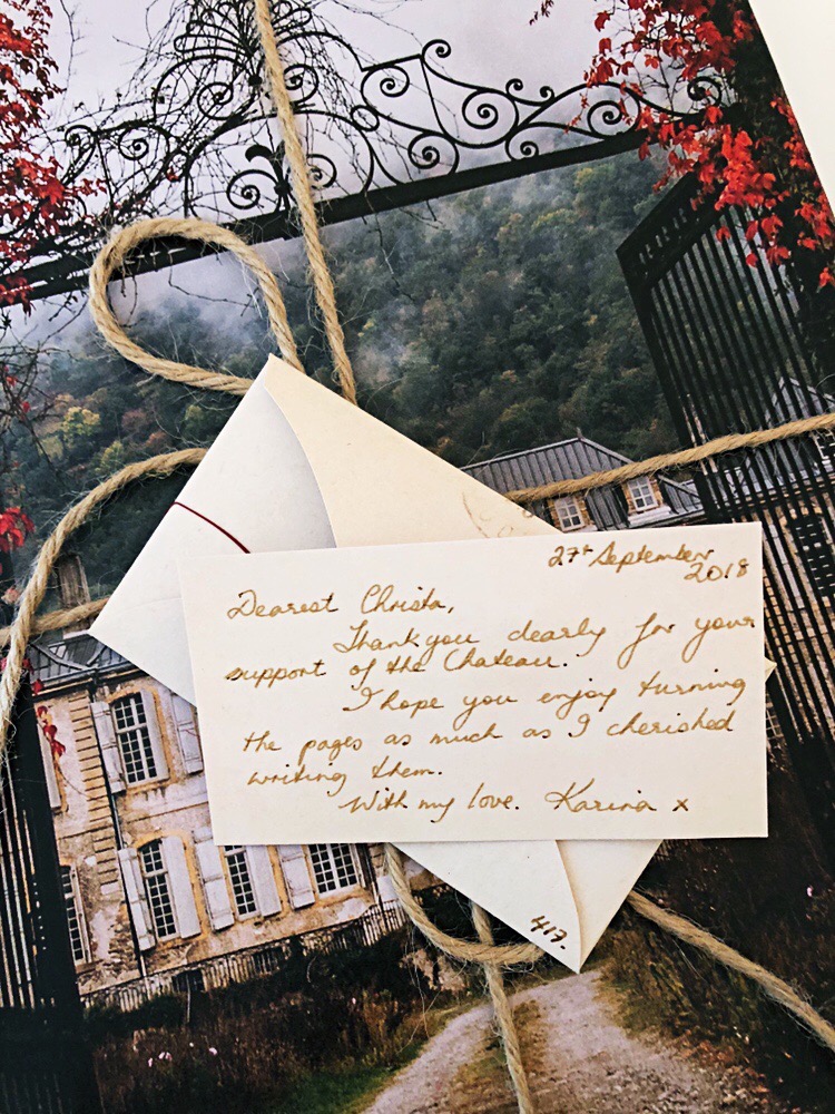 Our book arrived gift wrapped in beautiful Château de Gudanes wrapping paper with a hand written note from Karina along with a bookmarking with the layout of the château first and second floors (or ground floor and first floor depending on where you’re from!)