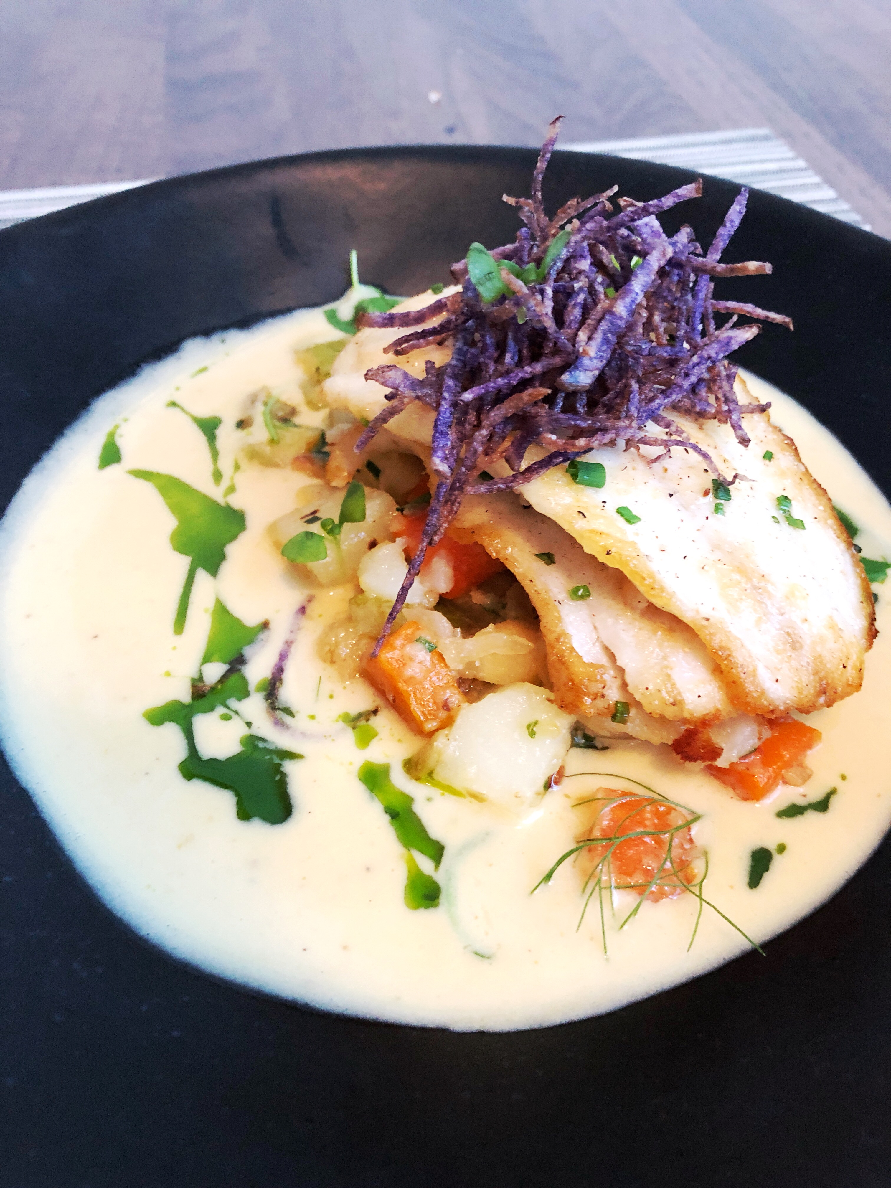 Flounder with Root Vegetable ‘Chowder’ Potato and Arugamato
