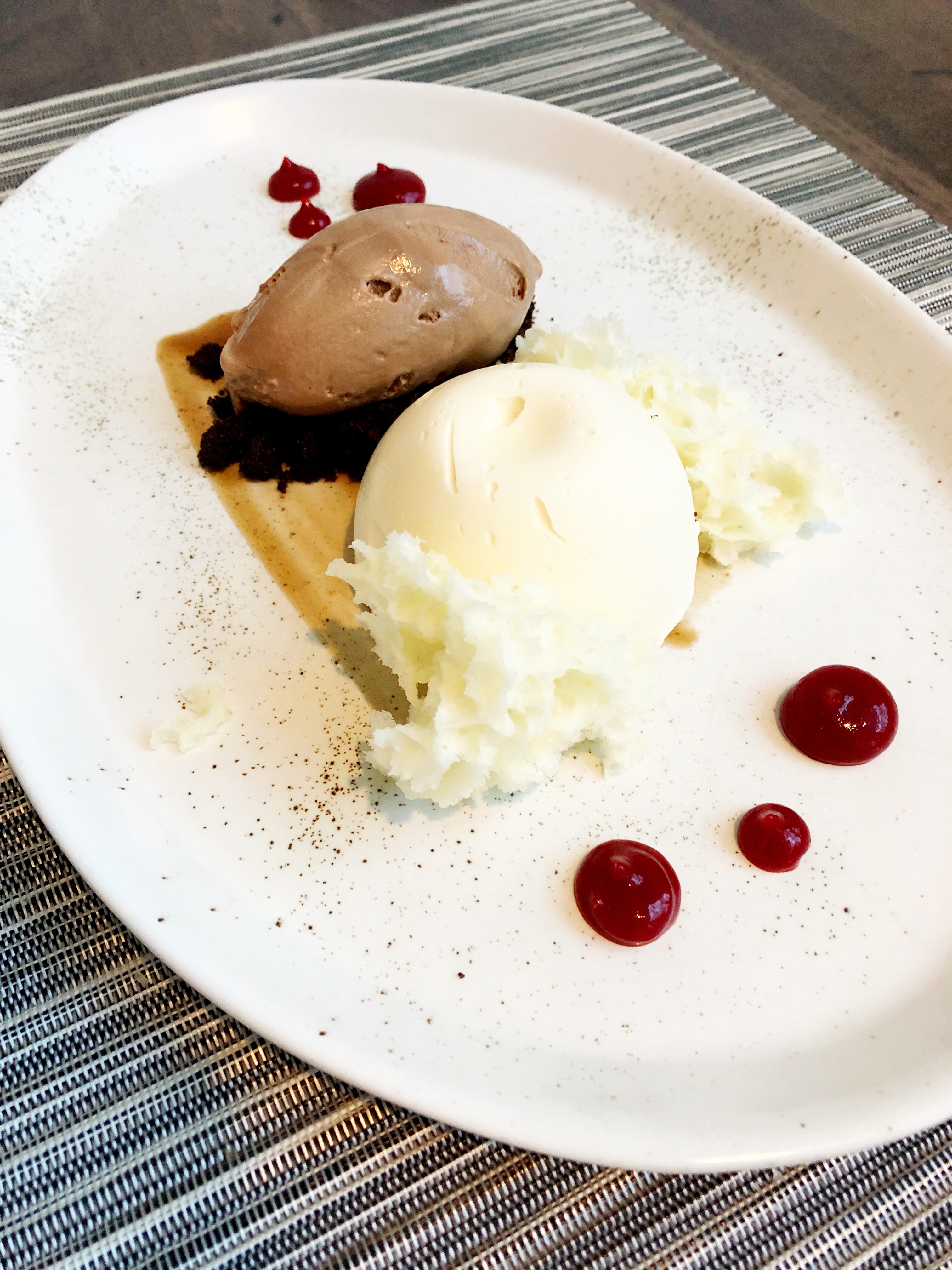 “Tiramisu” with White Cake, Chocolate Ice Cream, Espresso and Raspberry Puree