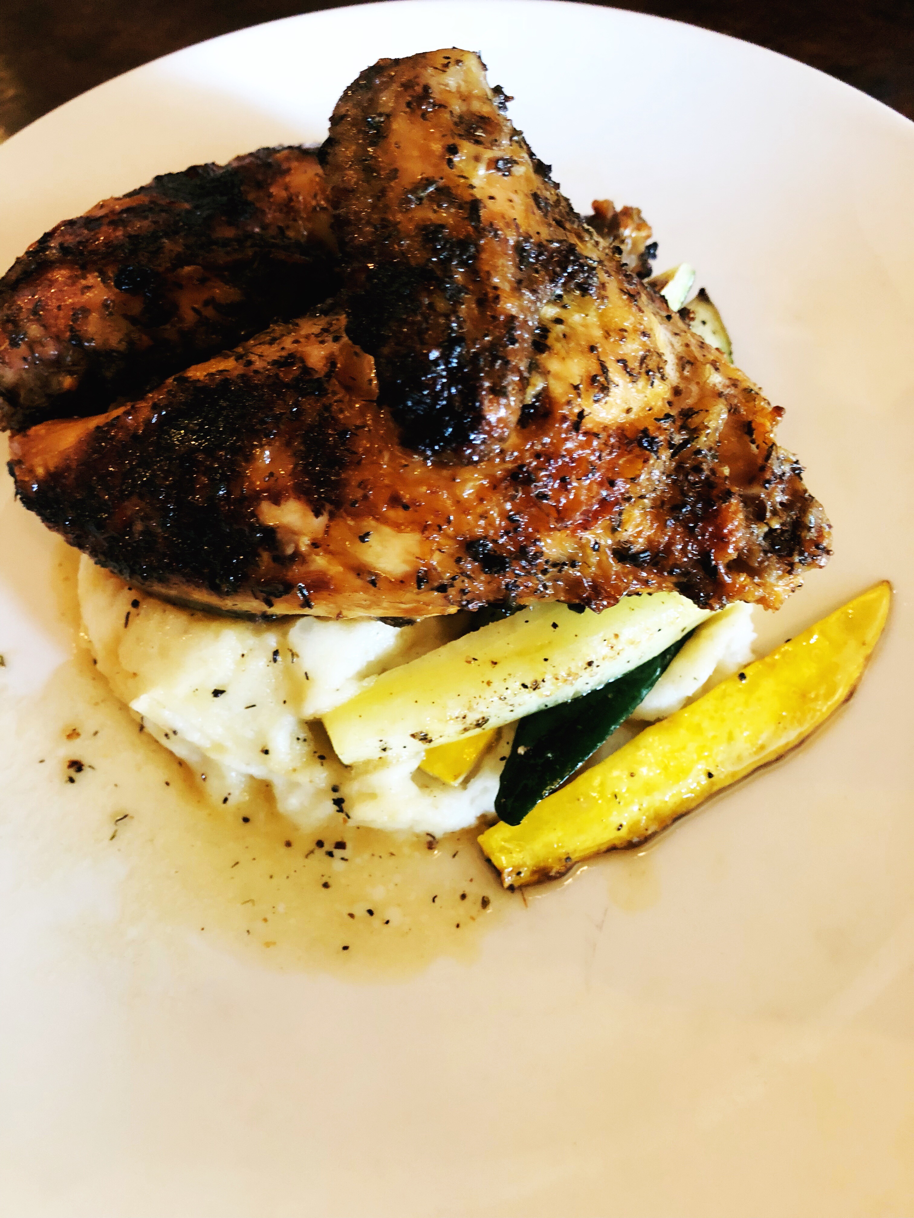 Mom went with the Herb Roasted Chicken with Summer Market Vegetables, Buttermilk Whipped Potatoes and Chicken Demi Glaze. The waitress warned us that the portions were large for this dish in particular, but my sister helped her out a bit.