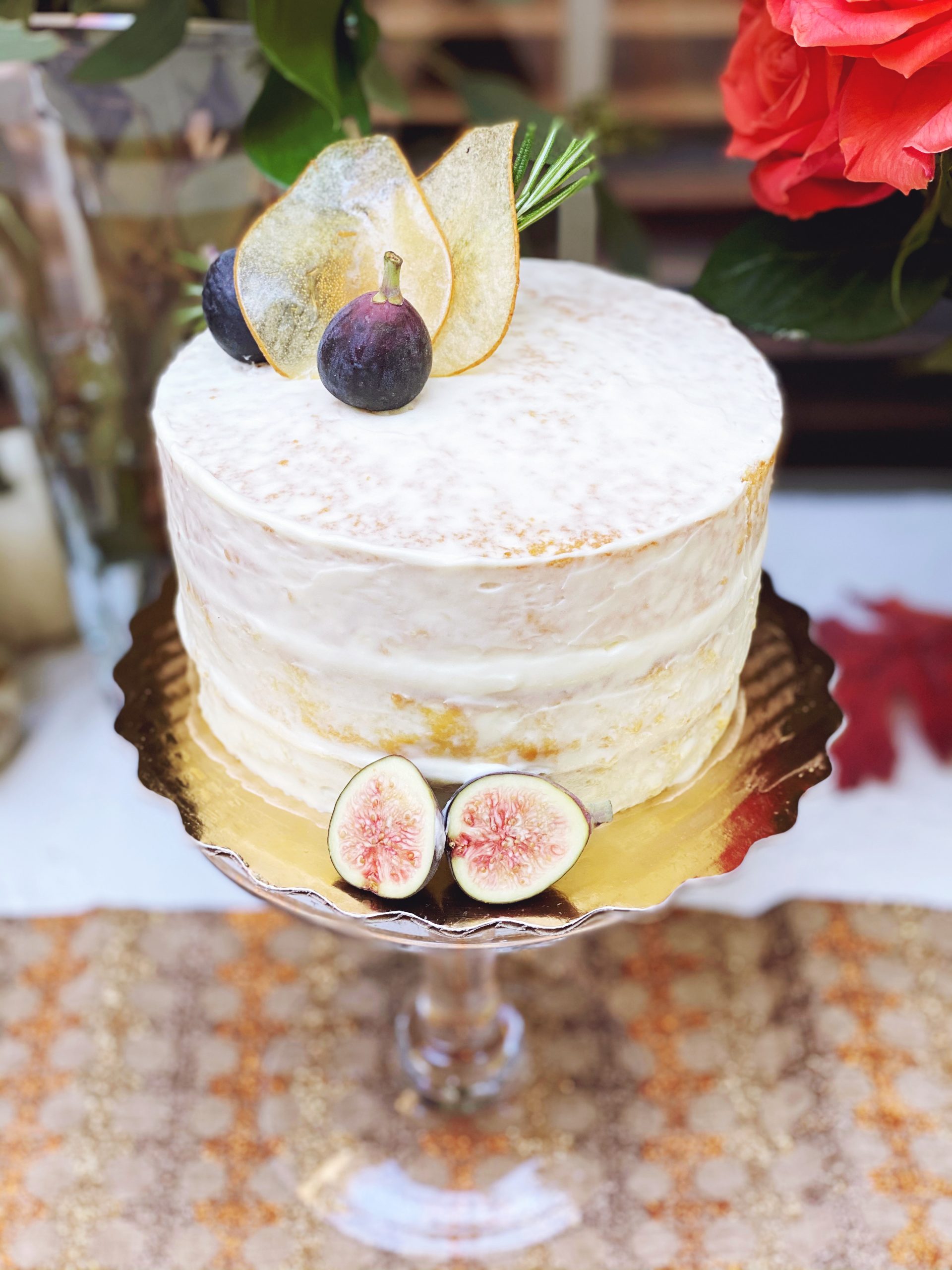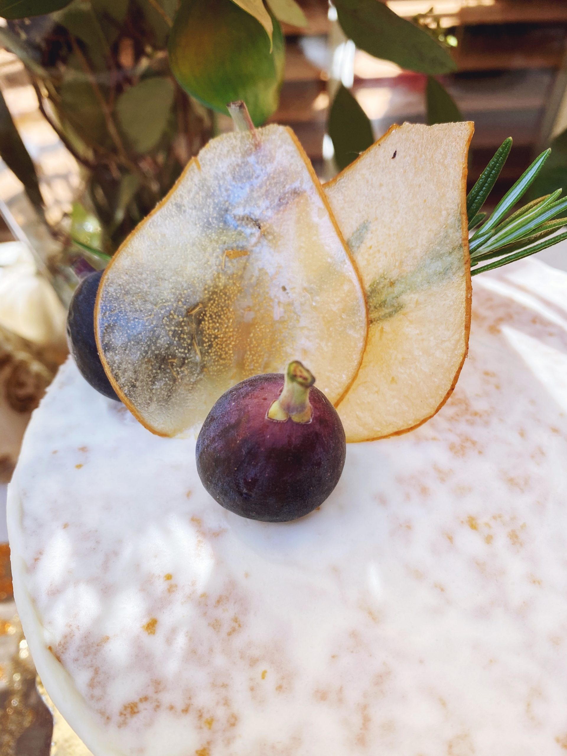 To create our perfect cake for fall, we ordered an undecorated naked cake from Whole Foods with Chantilly Cream Icing and Custard Filling. Next we added some delicious mission figs (I adore figs) and stained glass pears that my mom had created a few nights previously and left in the oven until it was time to decorate the cake and a sprig of rosemary.