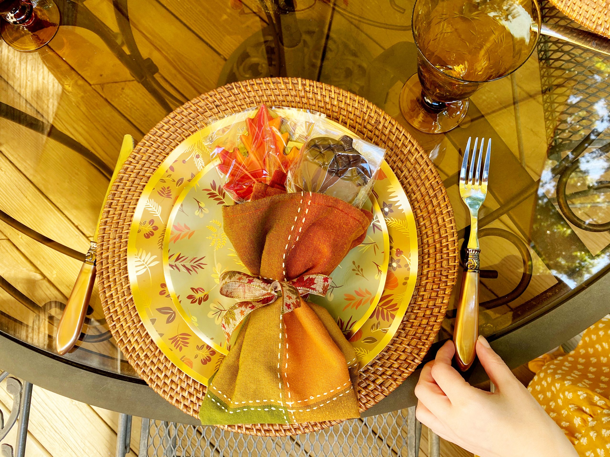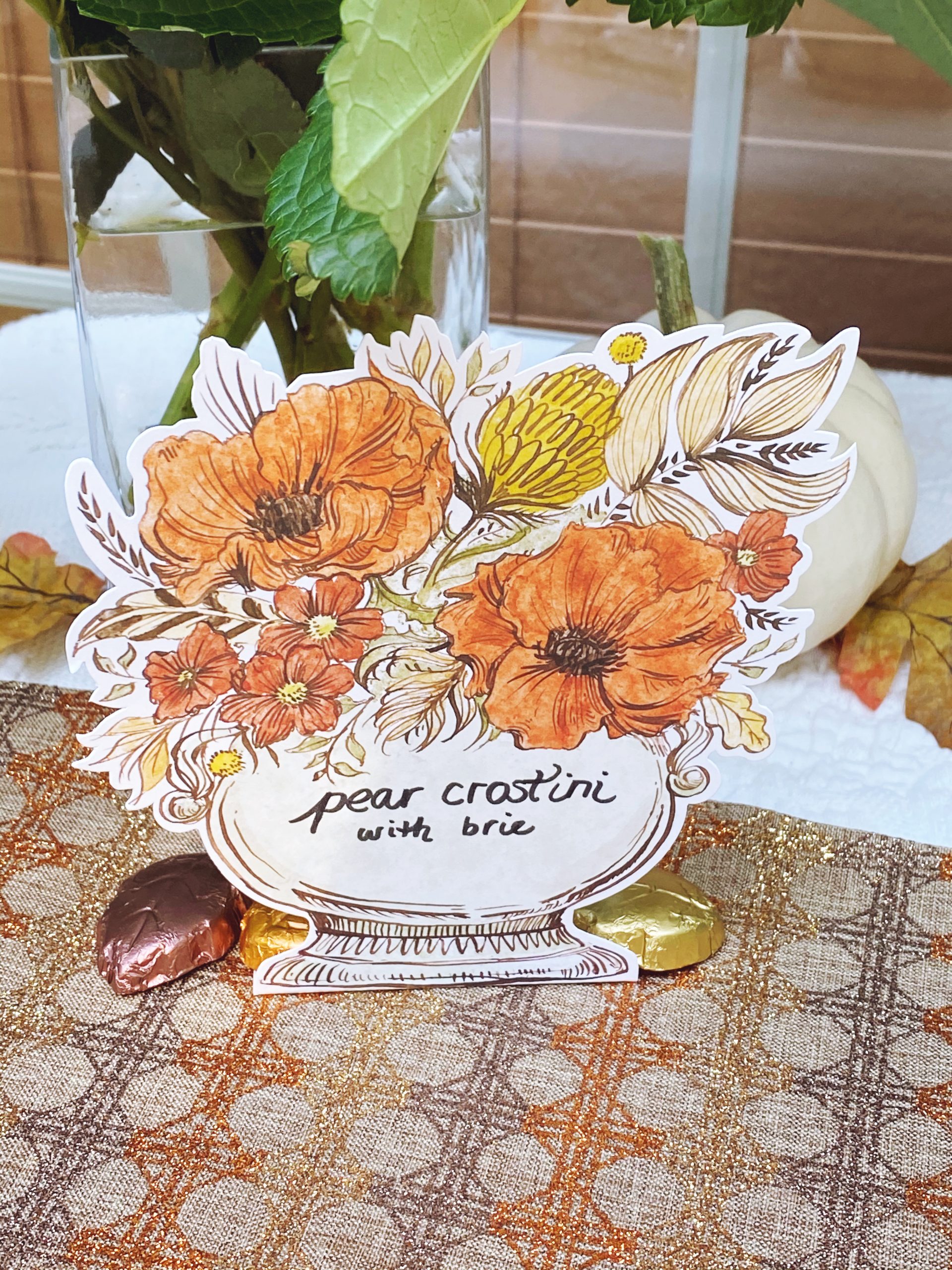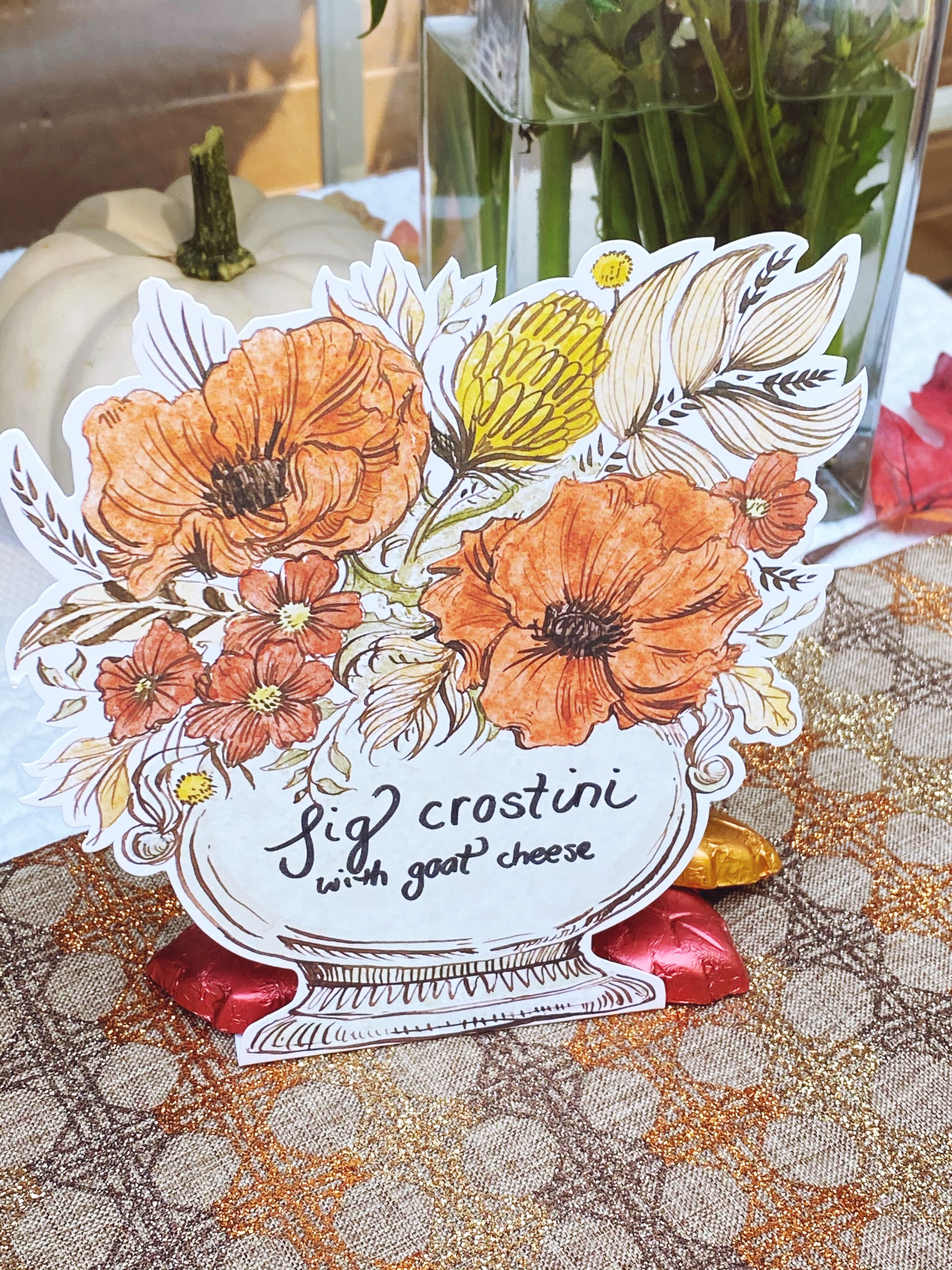 For our table setting we borrowed my sisters chargers, went with two unique paper plates (main course and dessert). Our party favors were a chocolate acorn (Chocolat Boutique) and chocolate leaves (Fresh Market).