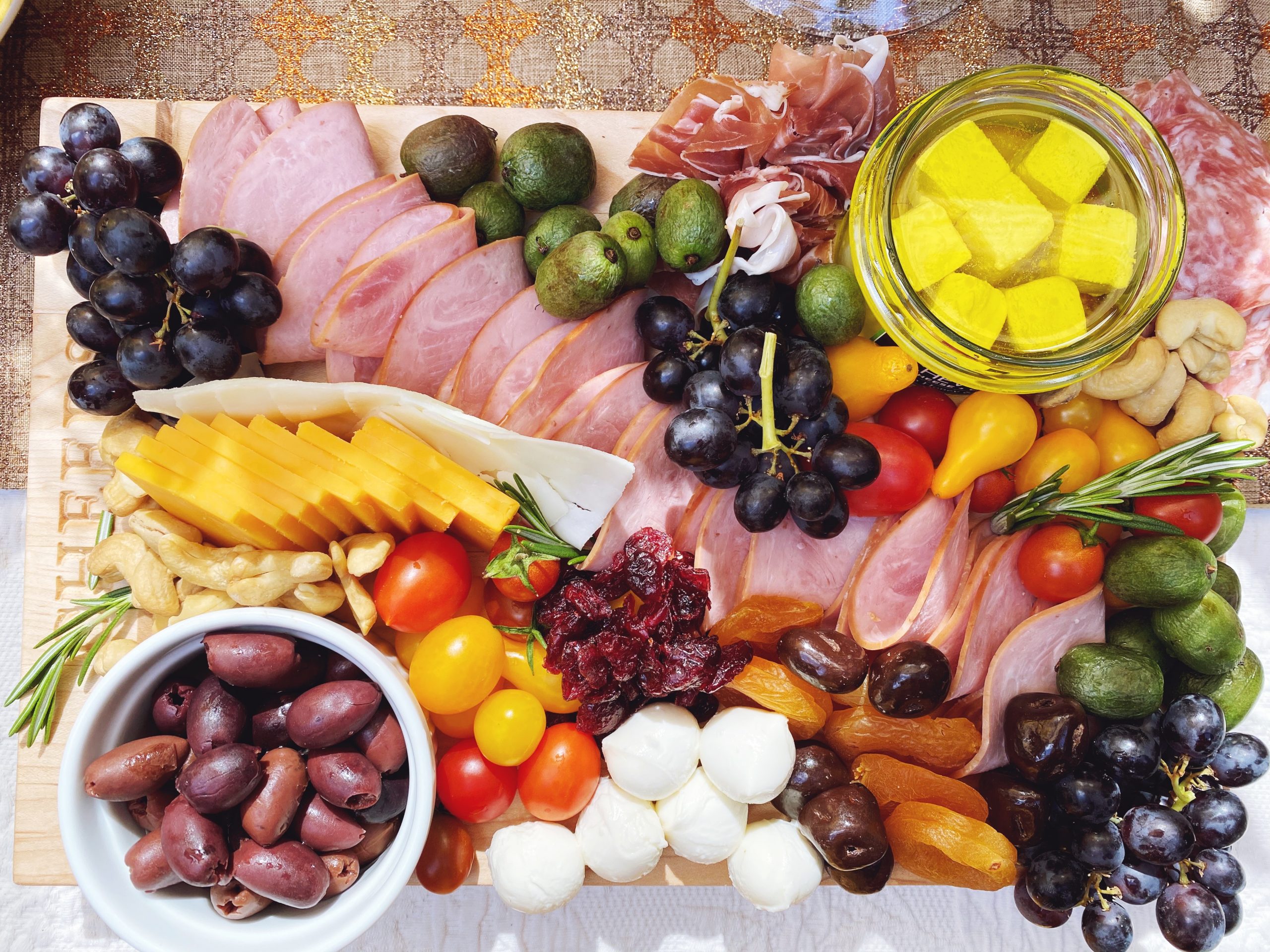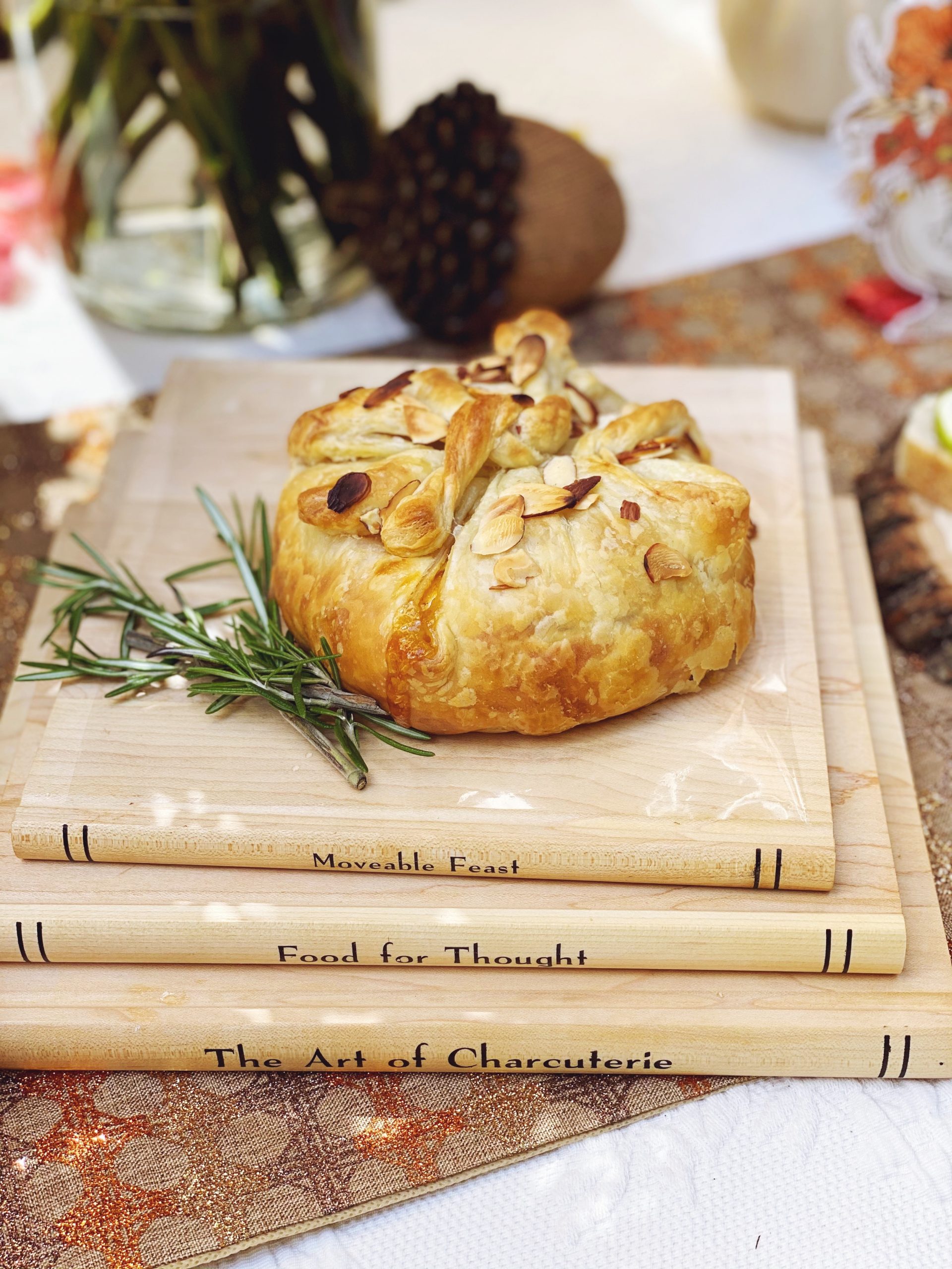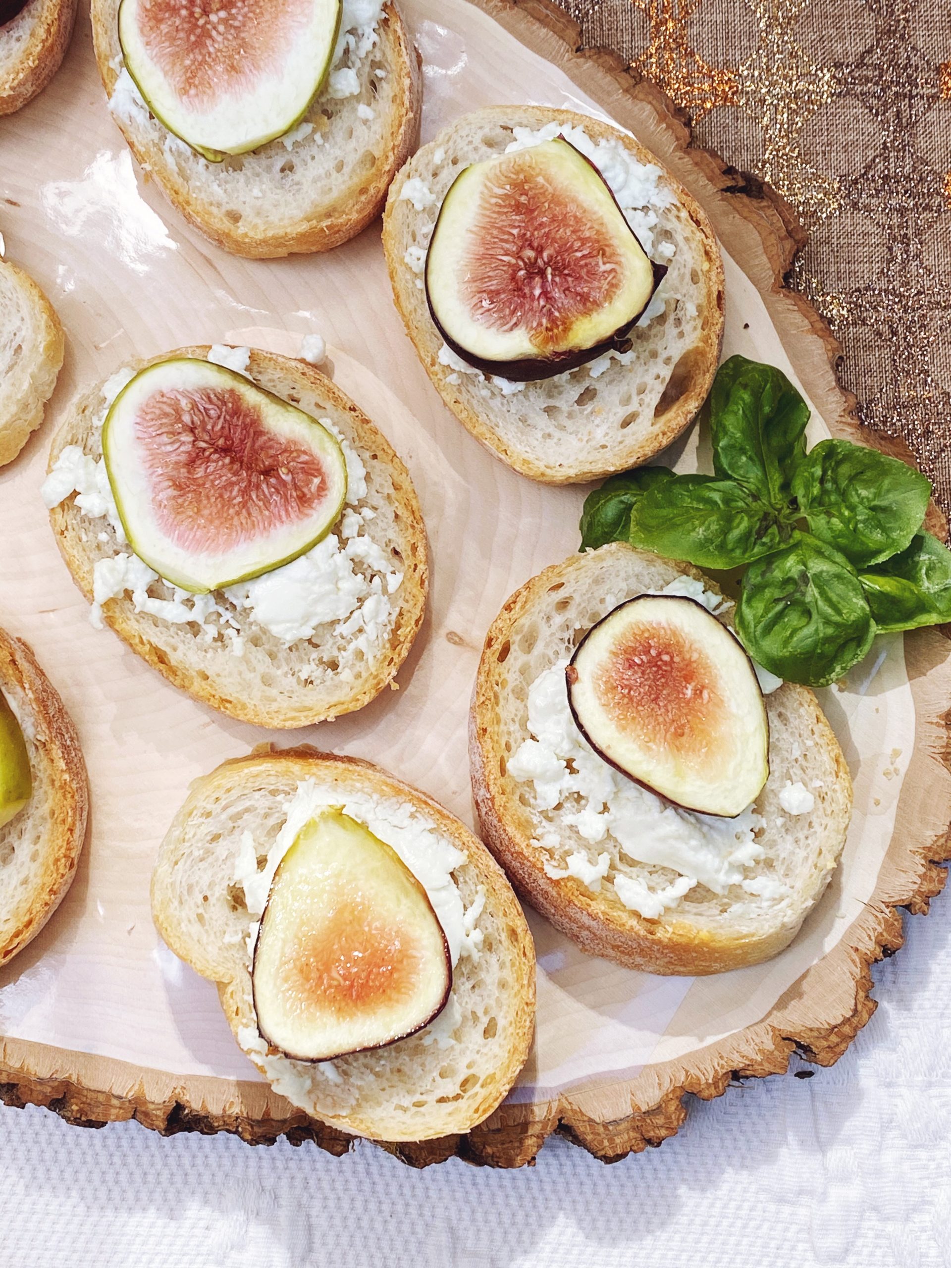 We baked our crostini in the oven at 425 for 5-8 minutes. (Depending on how easily the cheese you’ve selected melts). I also came up with a delicious sweet/savory idea for the next time we made crostini. Once you’ve removed the crostini from the oven drizzle it with your favorite balsamic and then place on your serving dish/board. We covered our wooden serving boards with a layer of clear vinyl plastic (think sleeves via Office Max) so that the oils and balsamic didn’t ruin the surface of our wood. We found our wood serving boards at our local Michaels a few years ago.