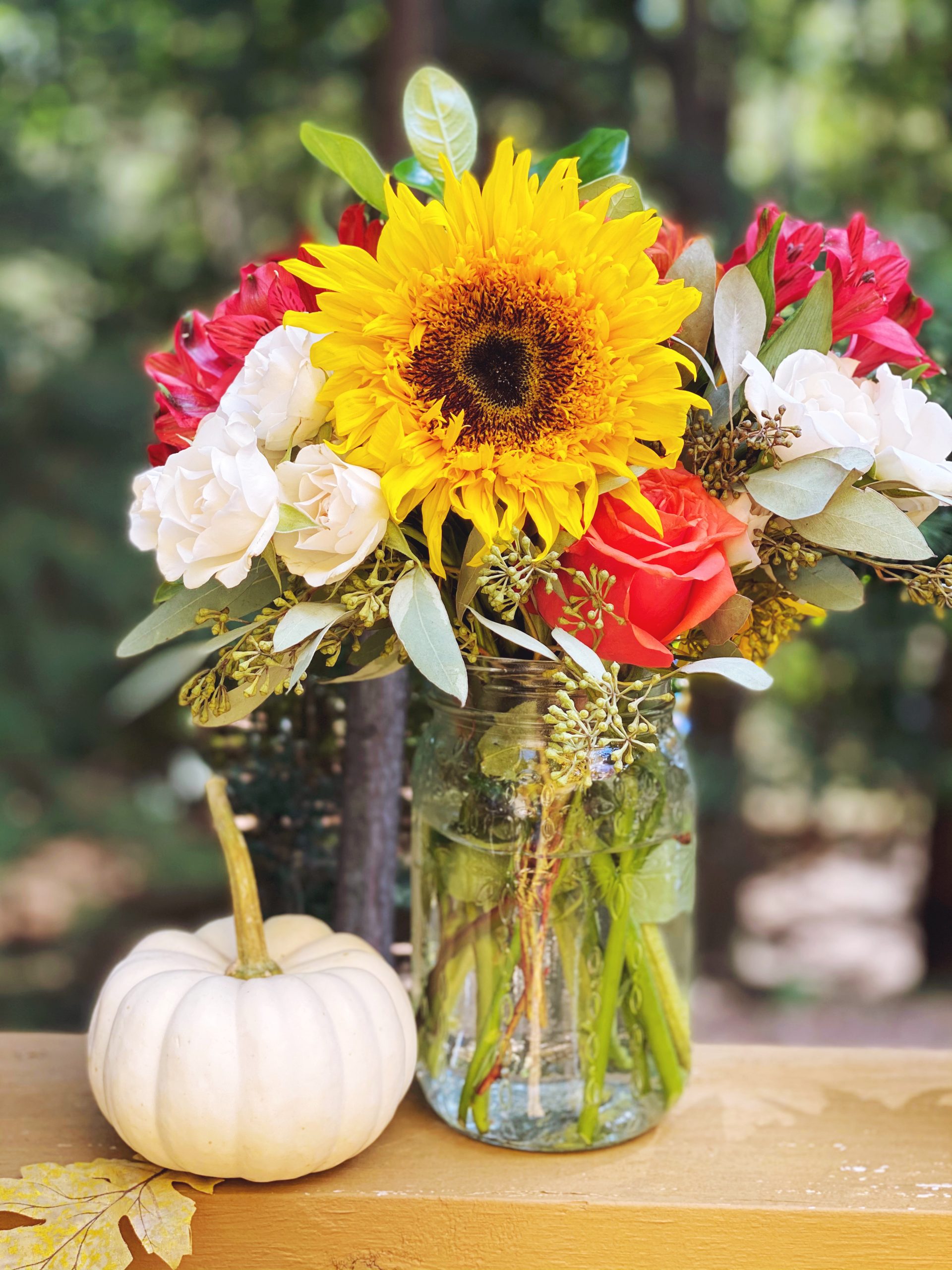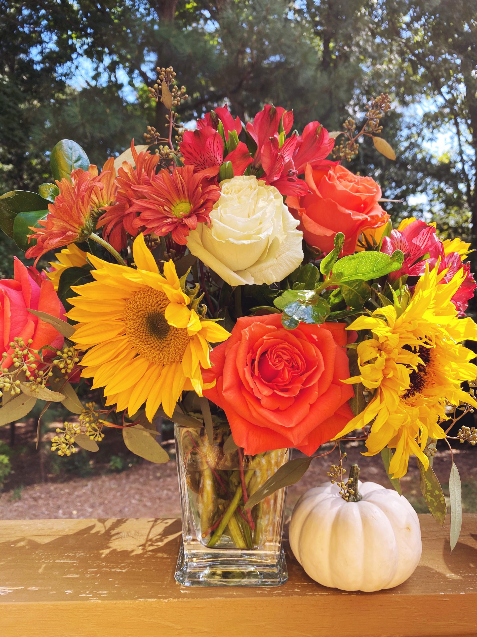 A variety of season flowers such as: alstroemeria, sunflowers, mums, chrysanthemum, roses, white hydrangeas