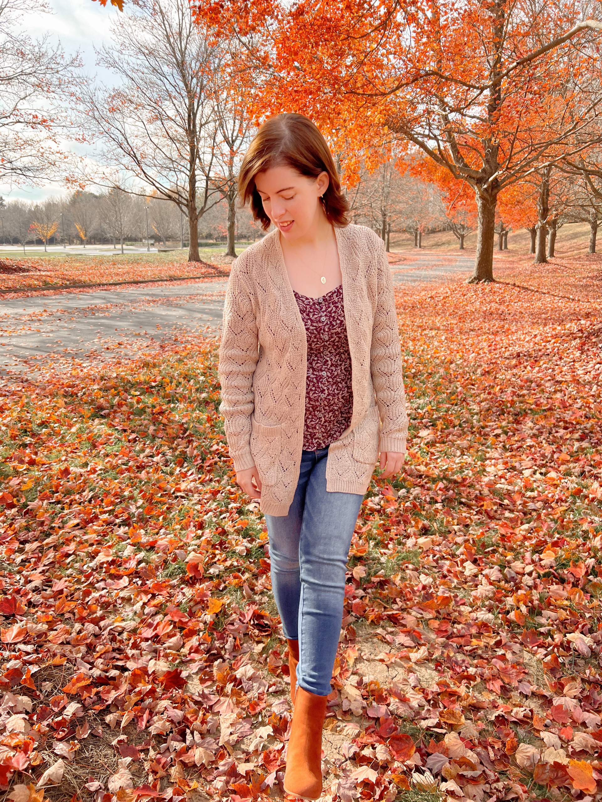 While I went with skinny jeans for this look and tucked them into my booties, you can also wear dark wash boot-cut jeans. My pointelle sweater is a Stitchfix find, which is still available in quite a few sizes. I went with my usual size, XS, and as you can see the sweater has an oversized fit.