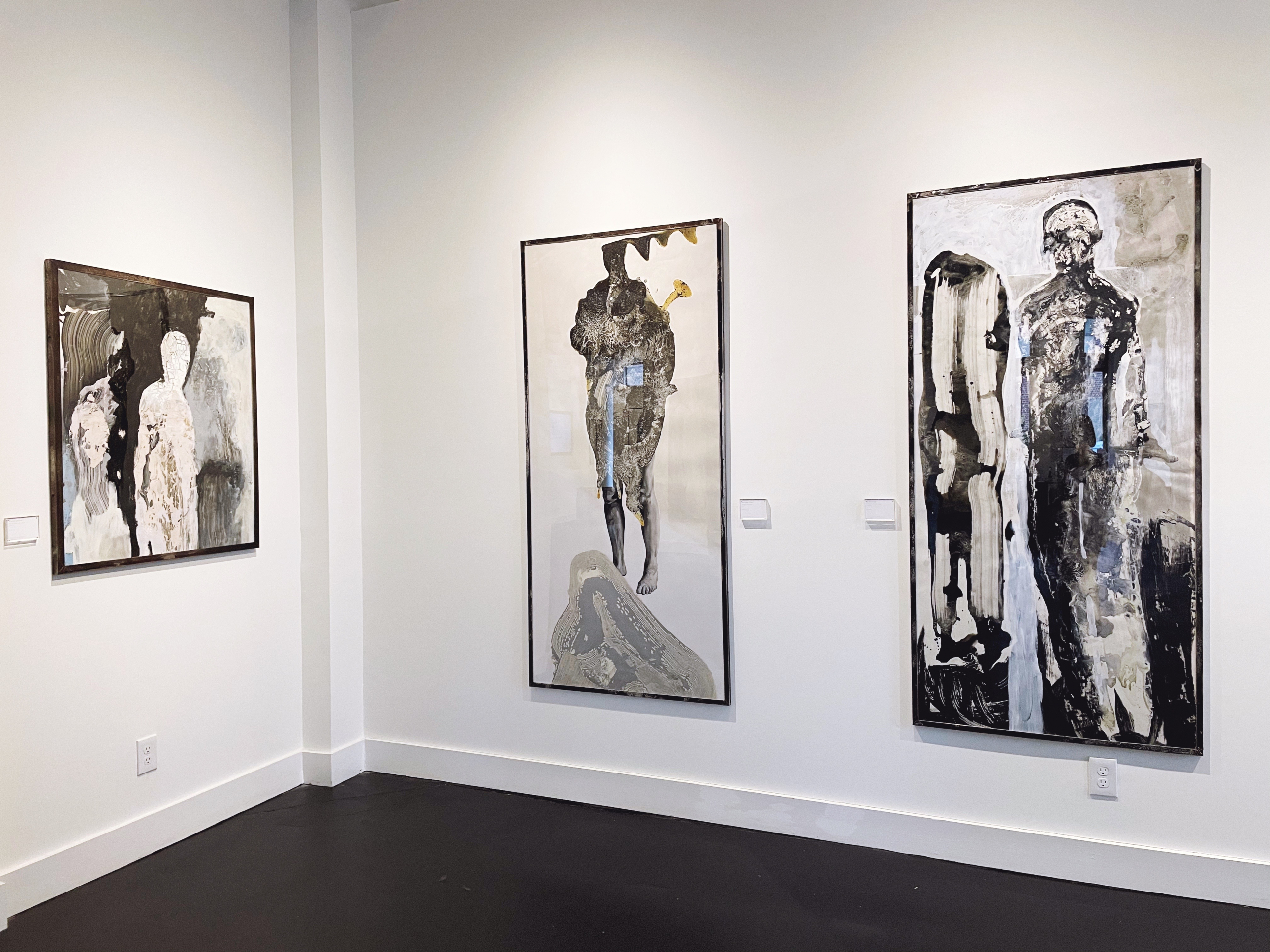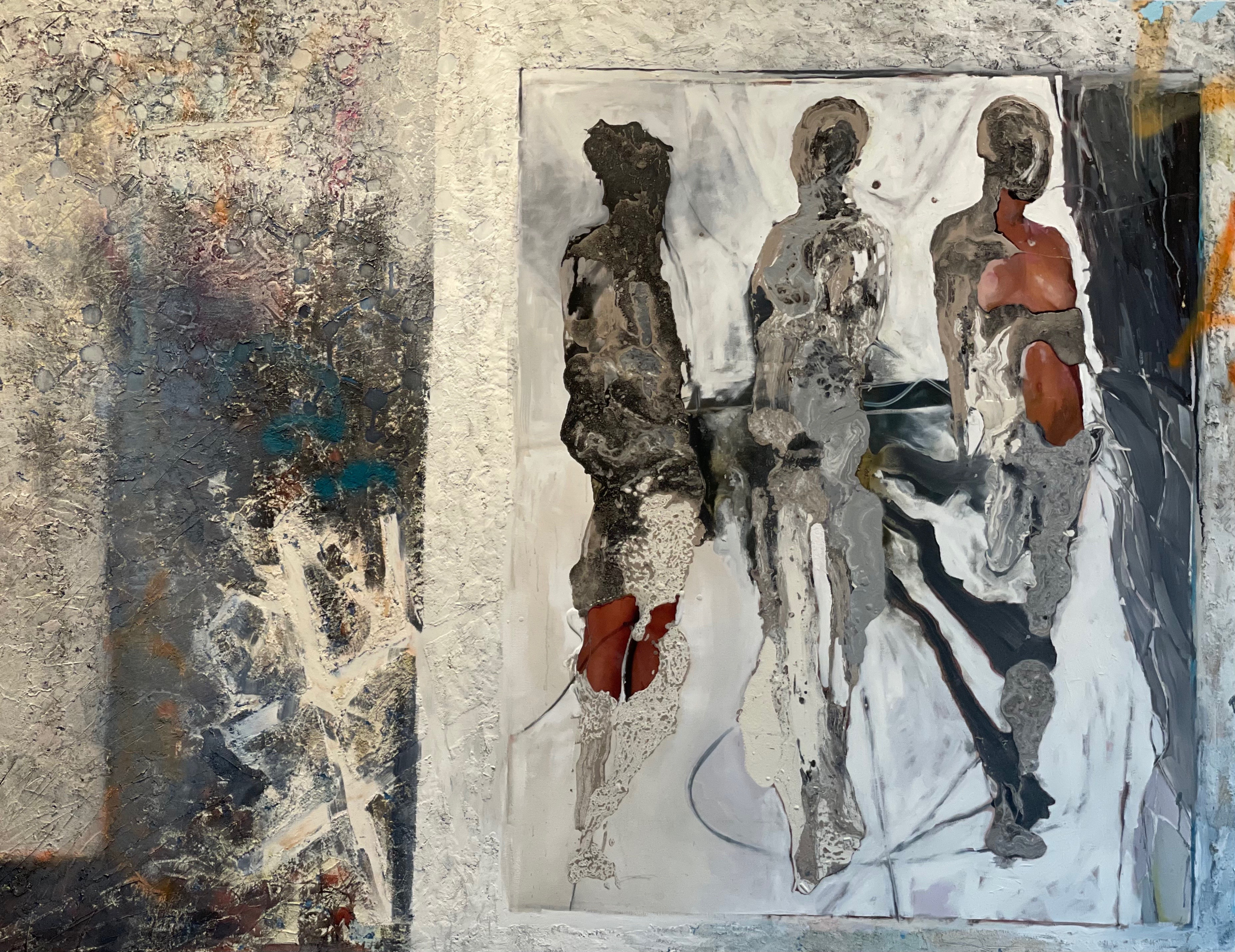 “Through emotional depiction, I create work that shares our global human likenesses. It was the passing of my father, which led me to integrate the topic of self relations and connectivity on account of profound anguish into my work. This series of figurative abstractions would be called “Feet in the Garden,” which references something unattainable – a never-ending vexatious search for deceased loved ones. The work abstracts images of faith. In doing so, I can engage with my audience’s experience in the struggles that come from deaths trials and tribulations. The pieces’ limited presentation of color suspends moments of familiarity in helplessness. In that which is left behind, in spaces vacated indefinitely, is a tumultuous yearn for direction. Astray in spiritual territories, these figures wander, reflecting our personal affair in the rivers current of trauma. Â