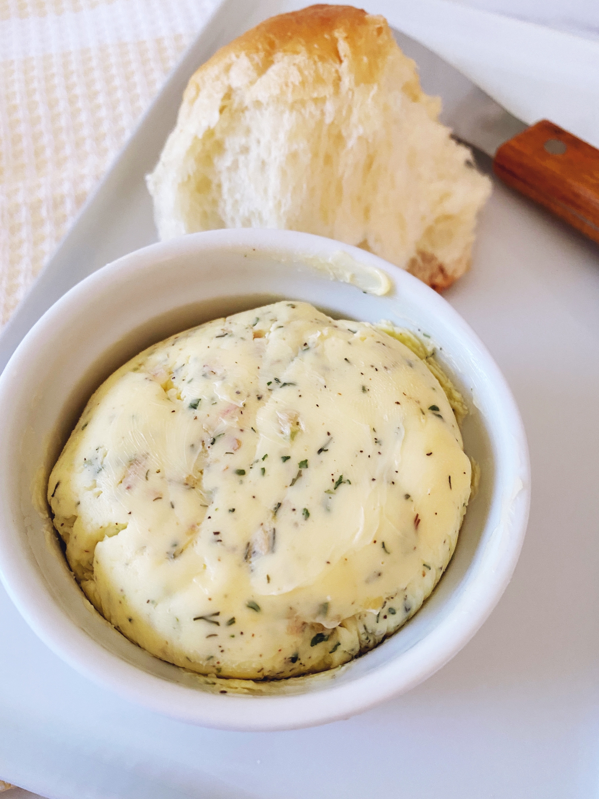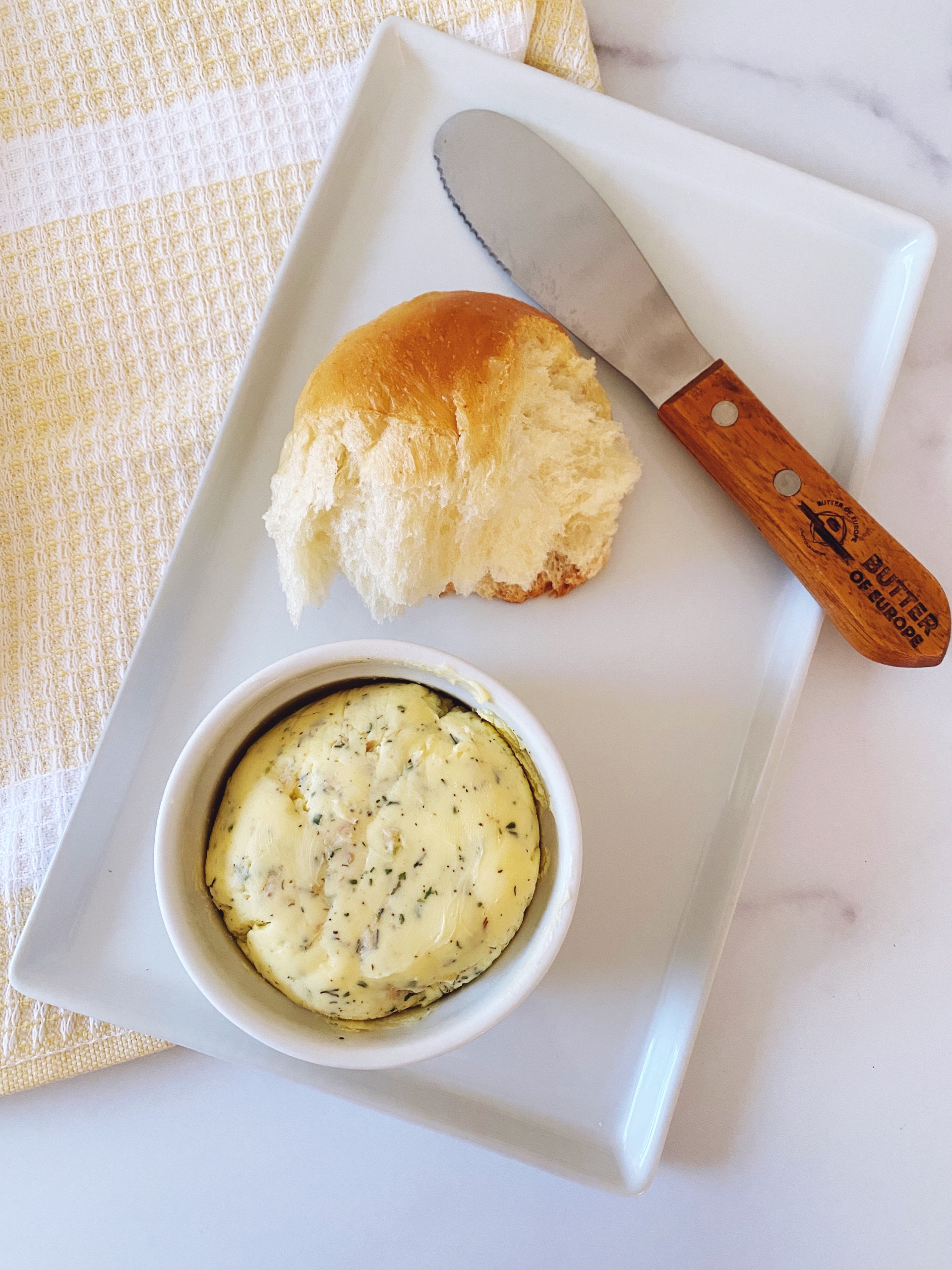 If you’d prefer to make your own herb blend, you can wash and mince 1 tsp your herb of choice (basil, dill, oregano, parsley, thyme) and 1/2 tsp of finely minced shallots or garlic. Follow the same instructions as above for mixing your herbed butter.