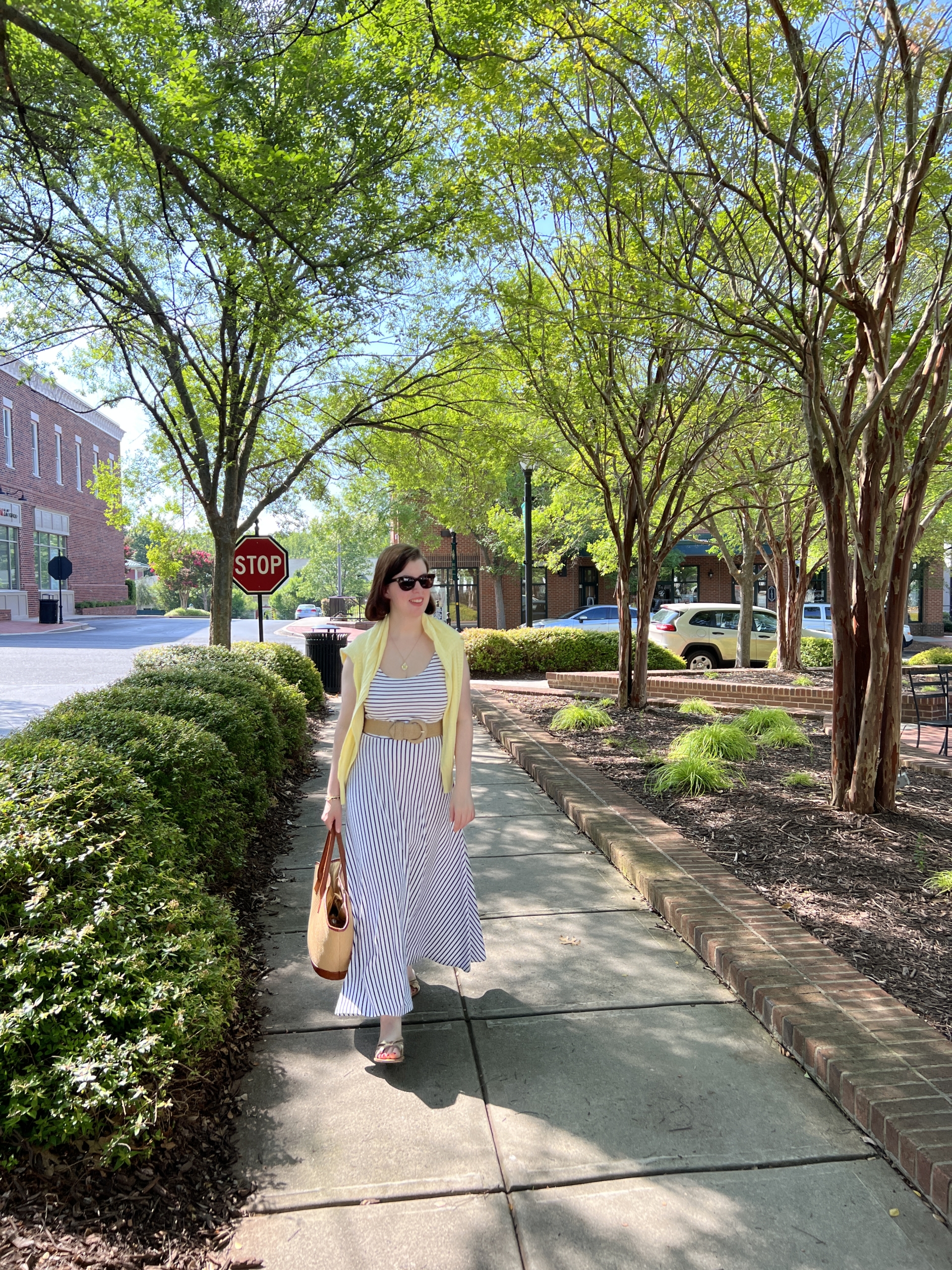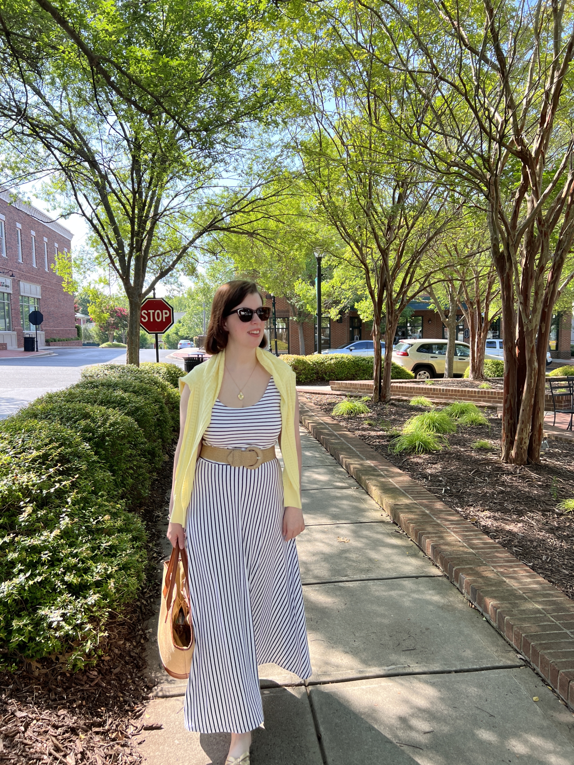 The summertime is the season of stripes for me, and in my opinion, there’s no such thing as too many striped dresses or too much navy. One thing I’ve been doing lately is styling some of last year’s outfits in different ways by adding new pieces to change up the look. This dress is one of my newest pieces that I added to my wardrobe a few months back to replace a well-loved piece. Replacing well-loved pieces is essential to keep your wardrobe fresh. While I tend to replace my dresses with a new piece with a similar silhouette, I love the fitted bodice of the dress and the long flowing (almost maxi length) shirt on this dress.