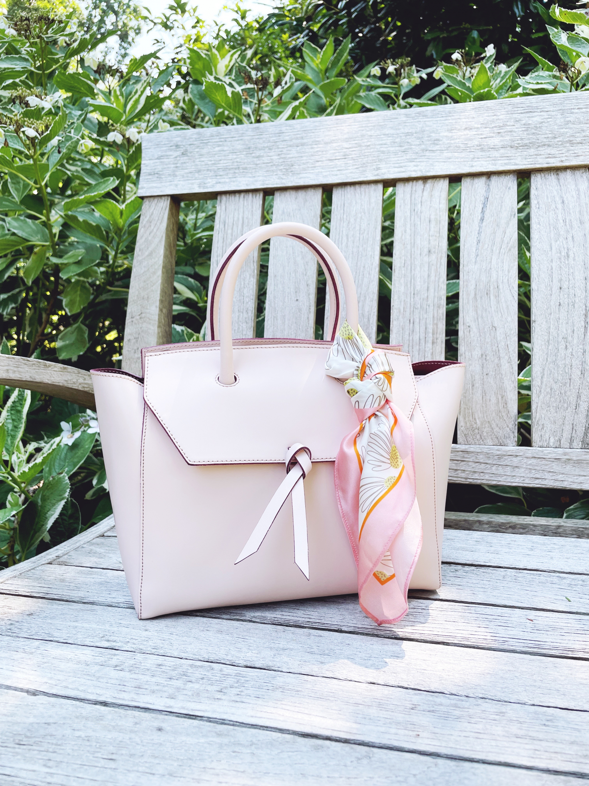 The Midi Loren Tote (also available in a larger size as well) comes in a variety of beautiful color options, but given my affinity for all things pink, I knew that the blush option was going to be a go-to option for me. Plus the color is exactly as appears in the photos on the Alexandra de Curtis website, the perfect shade of blush and I was so happy that it matched my dress for the day perfectly. I also styled it with a scarf that features both pink, orange, yellow, and neutral tones which adds a little pop of color.