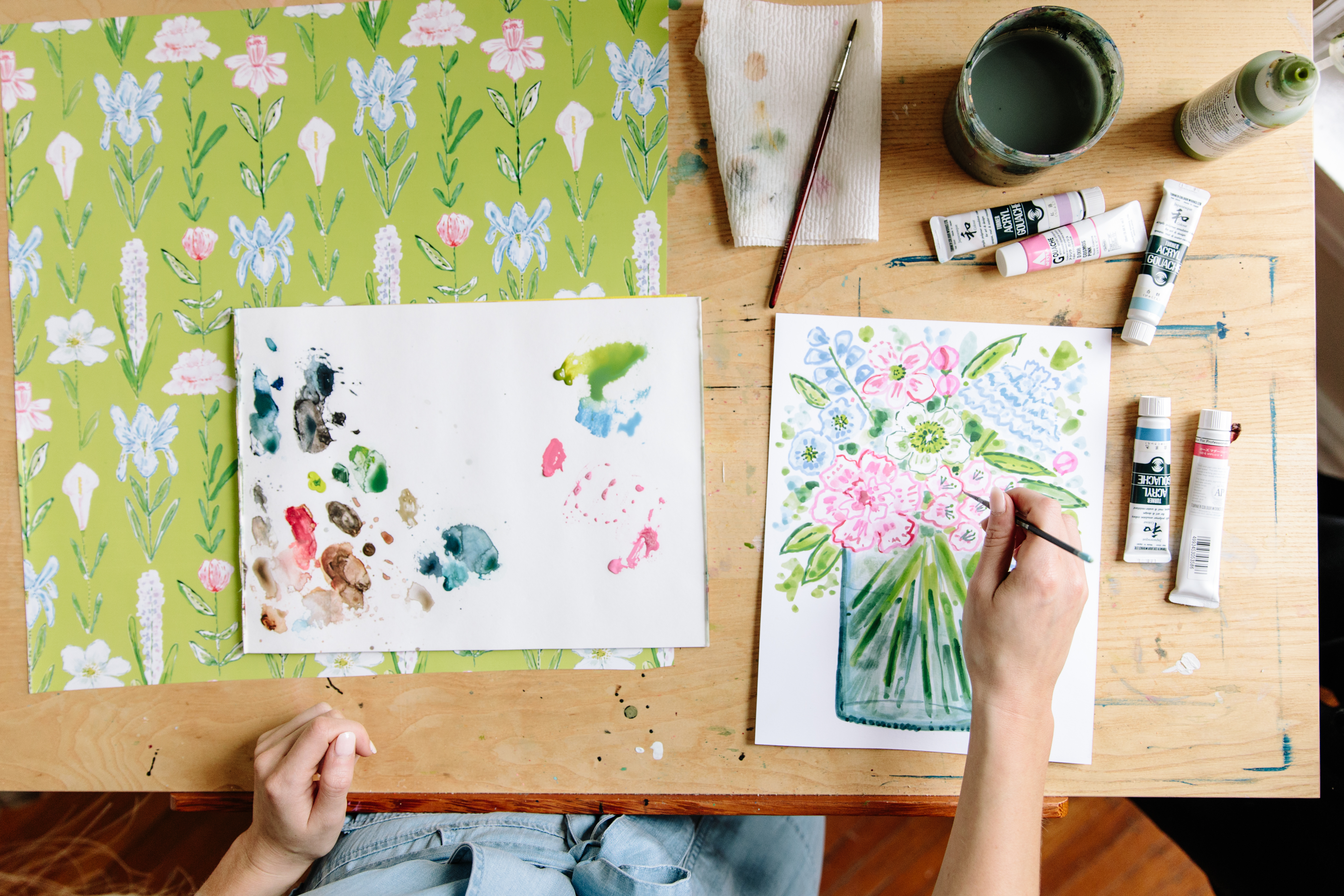 I’ve been obsessed with art for as long as I can remember. I used to write stories on my grandmother’s typewriter and then get markers to illustrate them. My mom was always finding weird and creative day camps to send me to like decoupage camp, pottery painting camp, and puppet making camp. And I loved doing every kind of craft project from popsicle stick houses to bracelet making. In middle school, I started designing patterns on Microsoft Paint and would print out my designs to use as binder covers, birthday cards, or whatever else I could think of. I was also always fascinated by museums and later majored in art history. So I have always loved art, but I didn’t start actually painting until I was about 21 and graduating from college. Pinterest had just become a big thing and I had been searching for cute quotes there and painting them on little canvases. Noticing that I would occasionally do this, two friends gave me a box of craft paints as they moved out during the summer. My paint collection then went from about 5 colors to 50 and so I decided to challenge myself to flowers for Mother’s Day. I haven’t put down the paintbrush since!