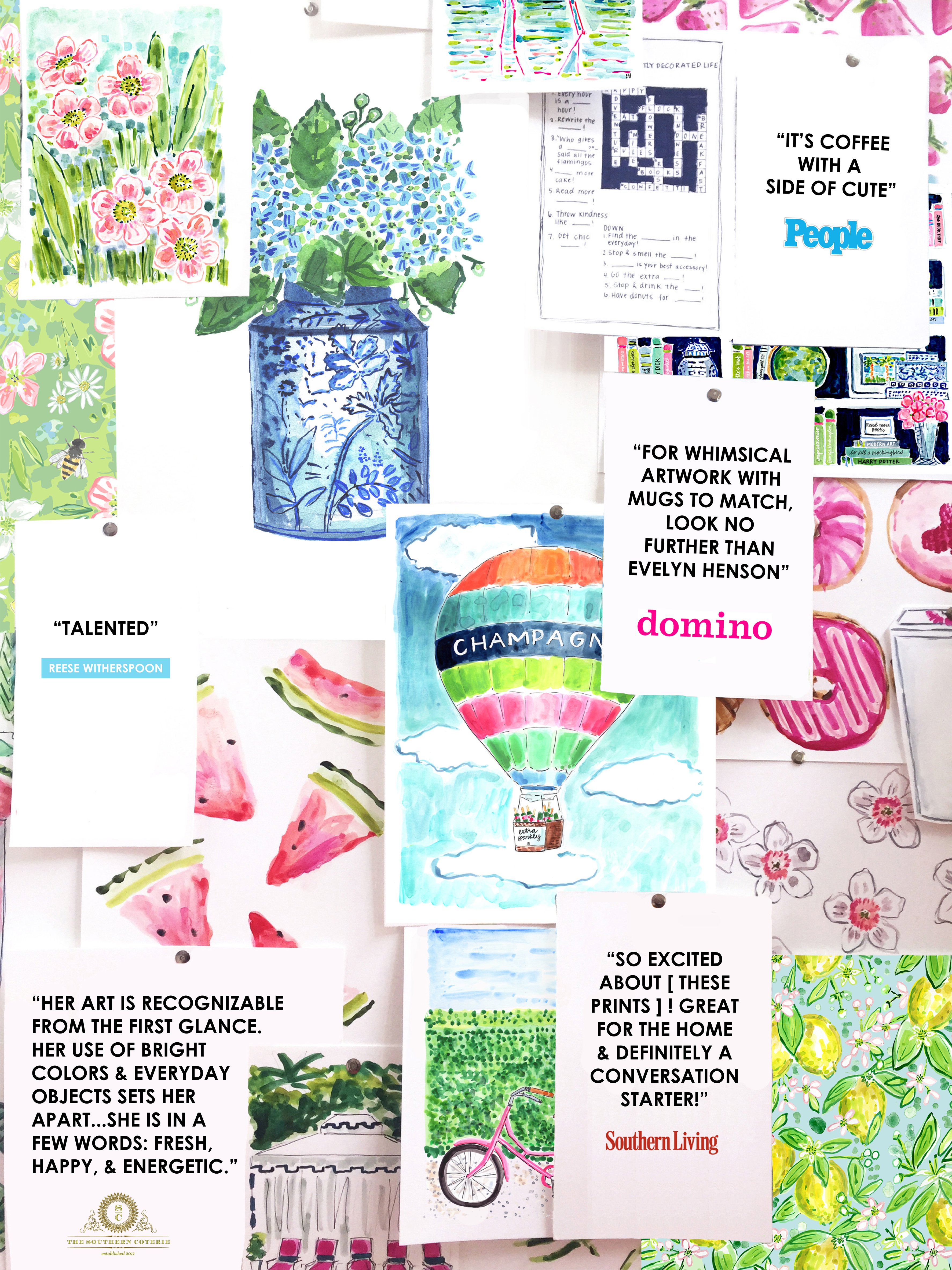 If there was an artist whose work makes your day feel instantly brighter, that would be Charlotte-based artist, Evelyn Henson. Evelyn first started selling her artwork after graduating college in 2013, and since then her work has been seen in magazines such as Domino, Glamour, and People just to name a few. Evelyn also recently started a new initiative Evelyn Henson Giving, where 100% of the proceeds go to causes such as The Cystic Fibrosis Foundation and Make a Wish CWNC.