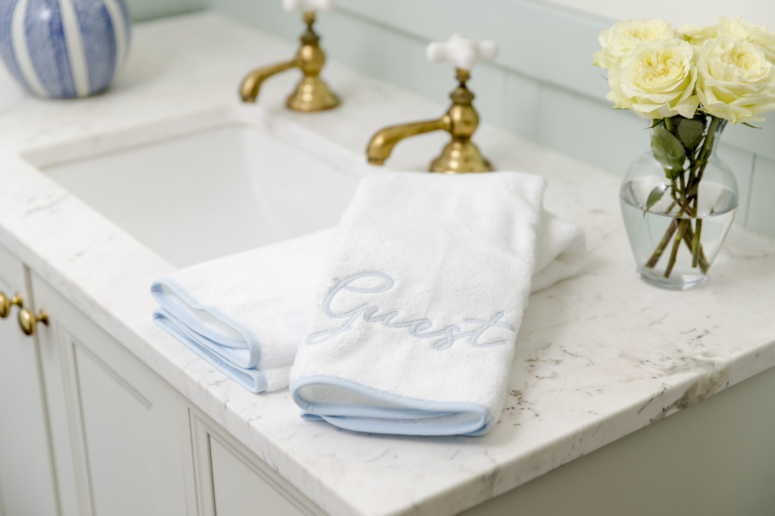 Liz — River is one of our most popular embroidery styles, and it’s the one I selected for my own powder room! I have the words “dry off” embroidered in light blue on light blue piped edge towels. I’ve also been living in my navy piped long robe this winter, embroidered with my initials in Prince.