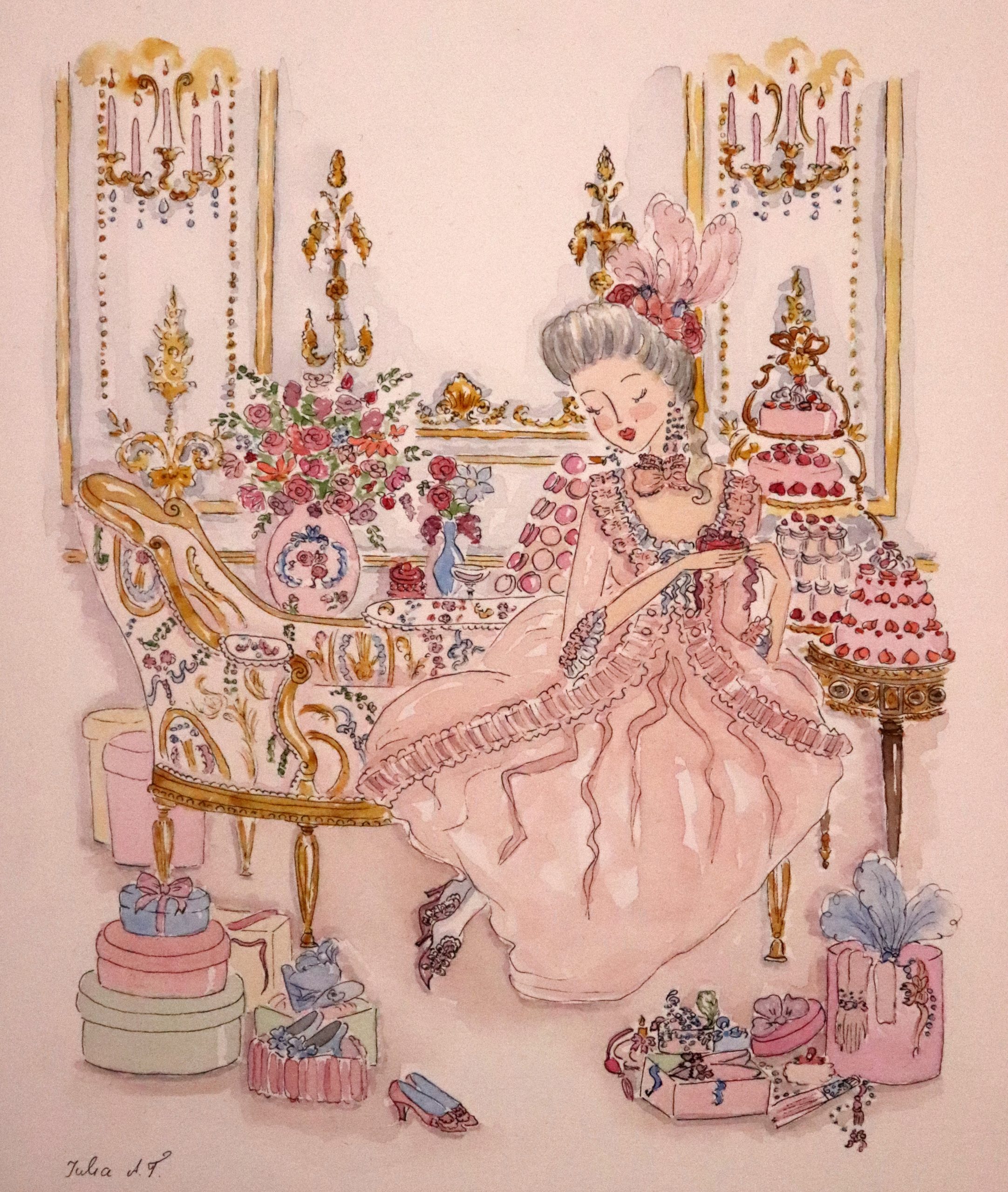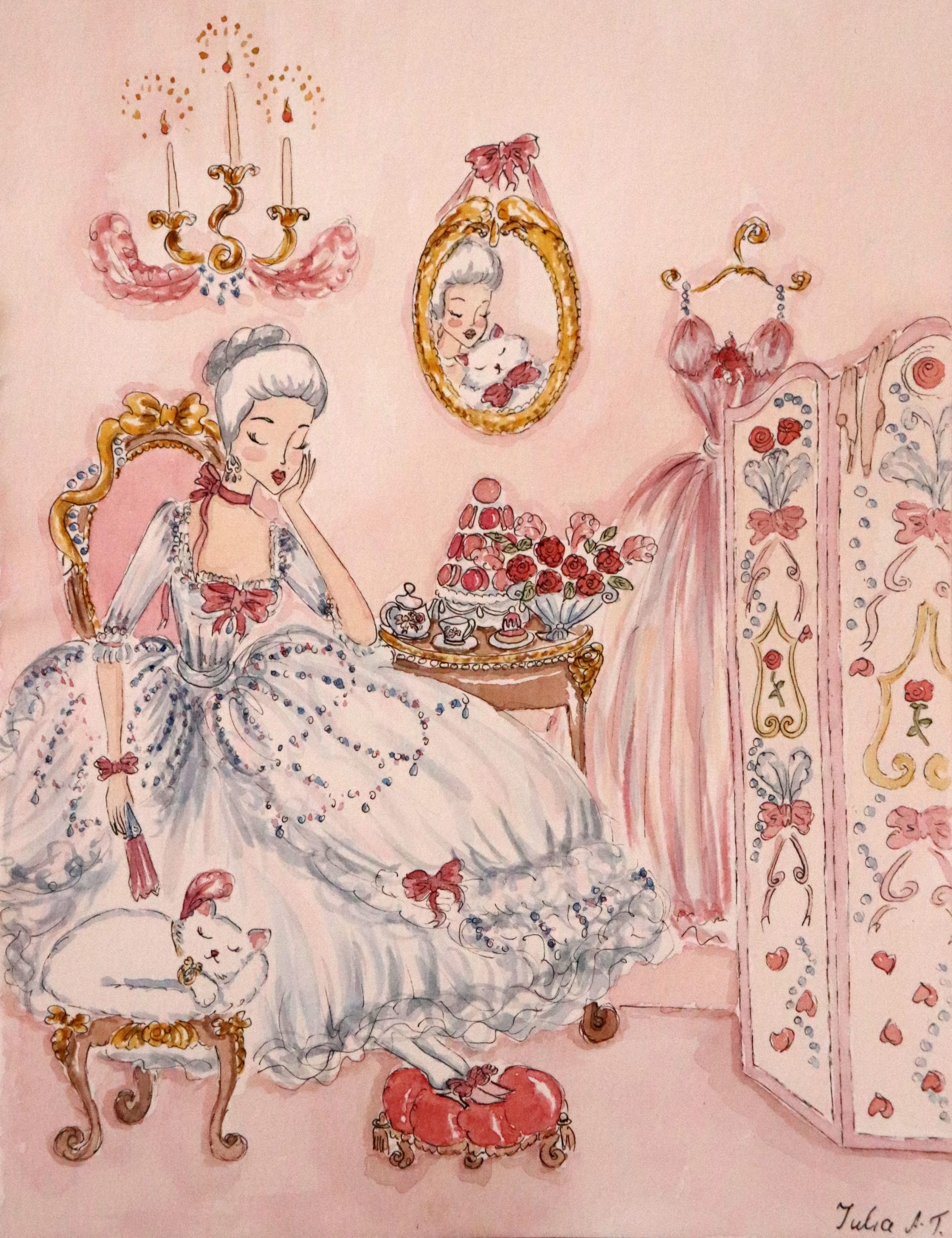 Your illustrations feature Marie Antoinette-Esque women and women in vintage Parisian settings… What drew you to Marie Antoinette and creating vintage illustrations in particular?