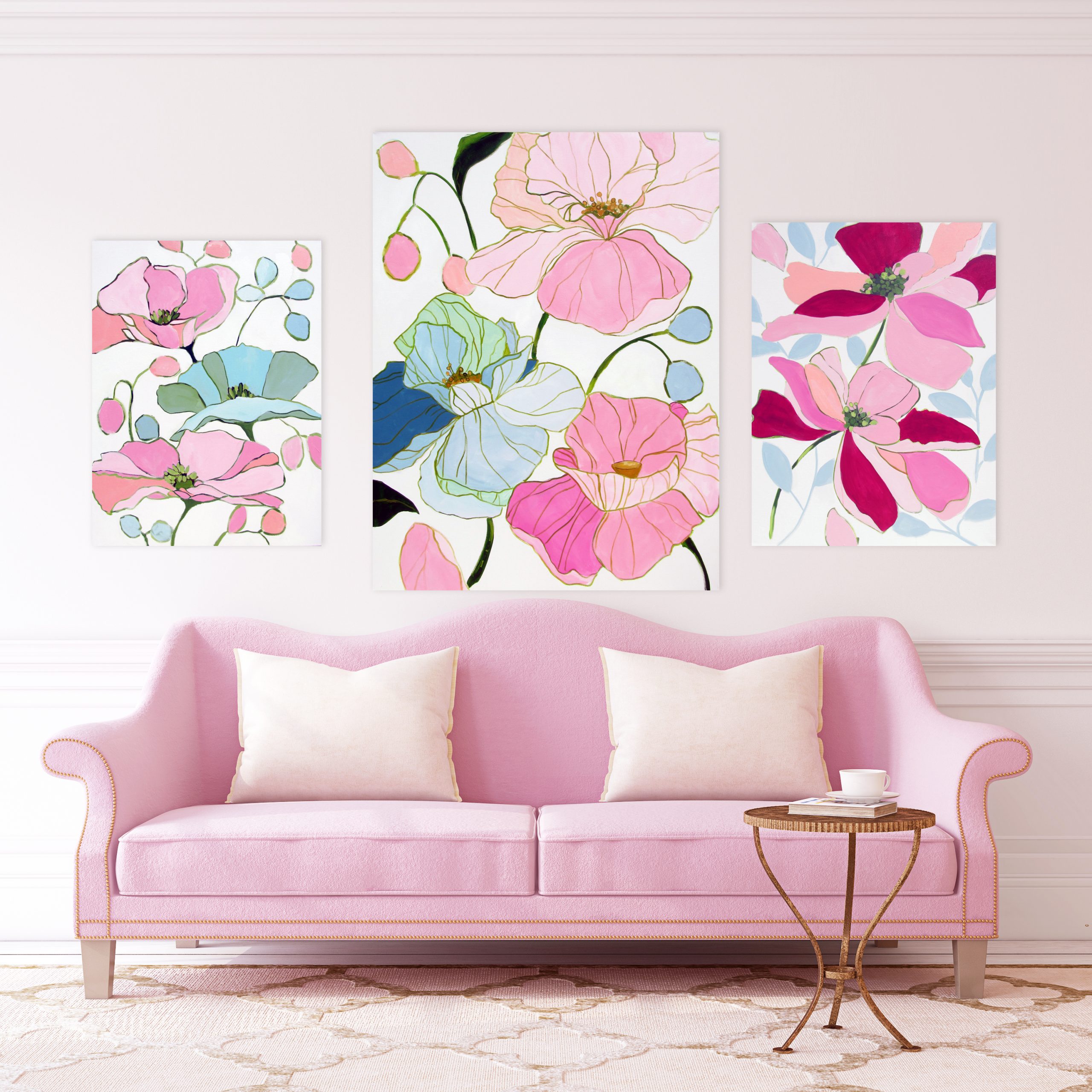 Pink, pink, pink – my absolute favorite! I try once in a while to complete a painting with no pink at all. I step back, look at it and think, “You know what would make that look better? Pink”. Now, if a client gives me a certain color palette to work with, I definitely stick with that. If I can’t get pink into the composition, then a Tiffany Blue is essential.
