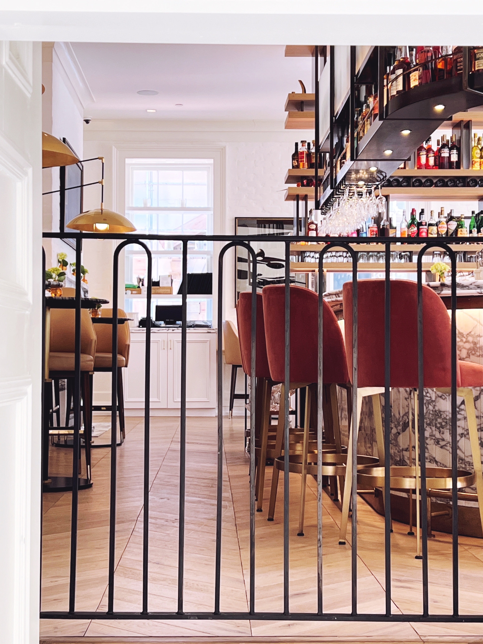 Views of the lobby, bar, and stairway leading to the main restaurant, Sorelle.