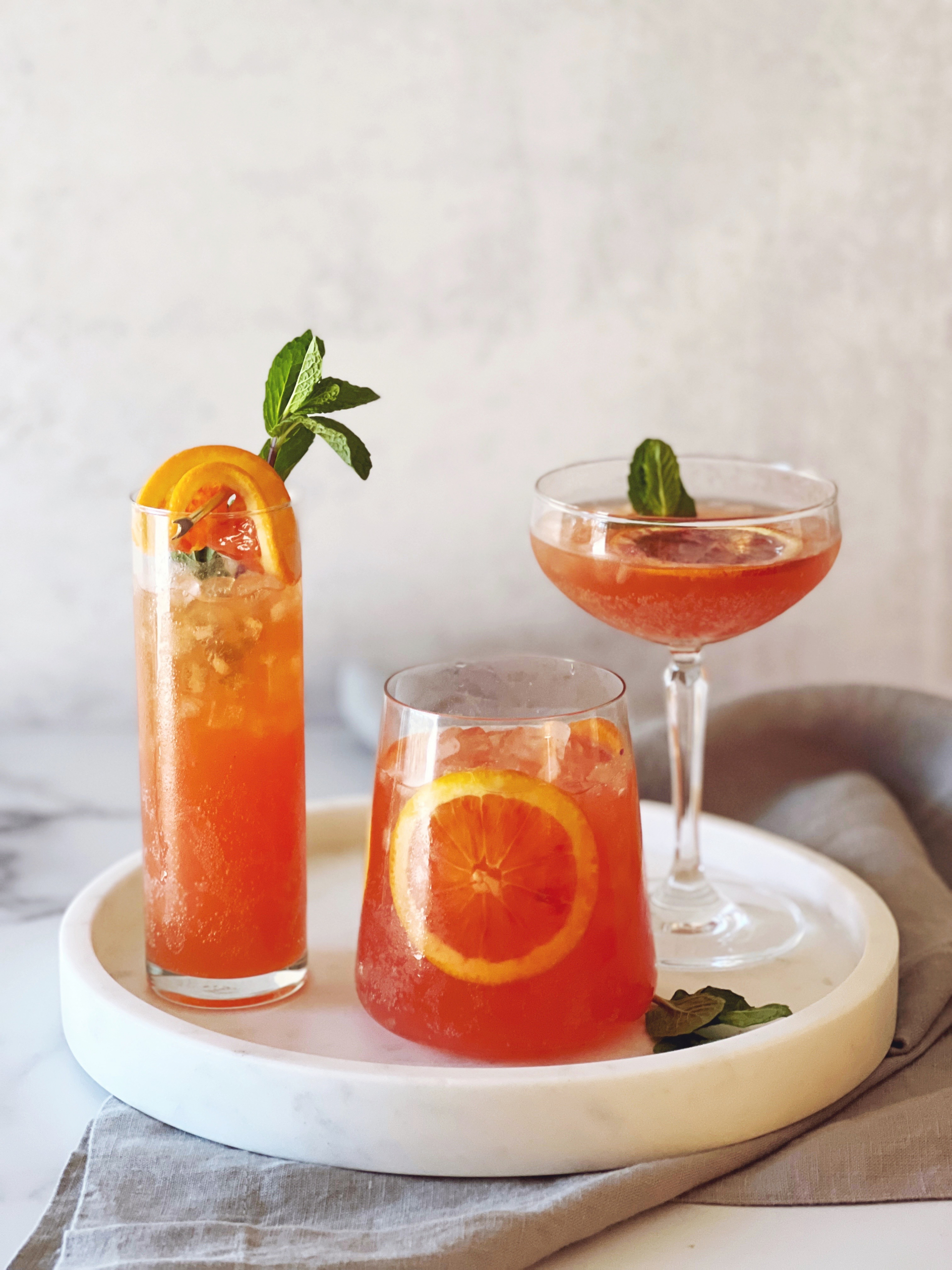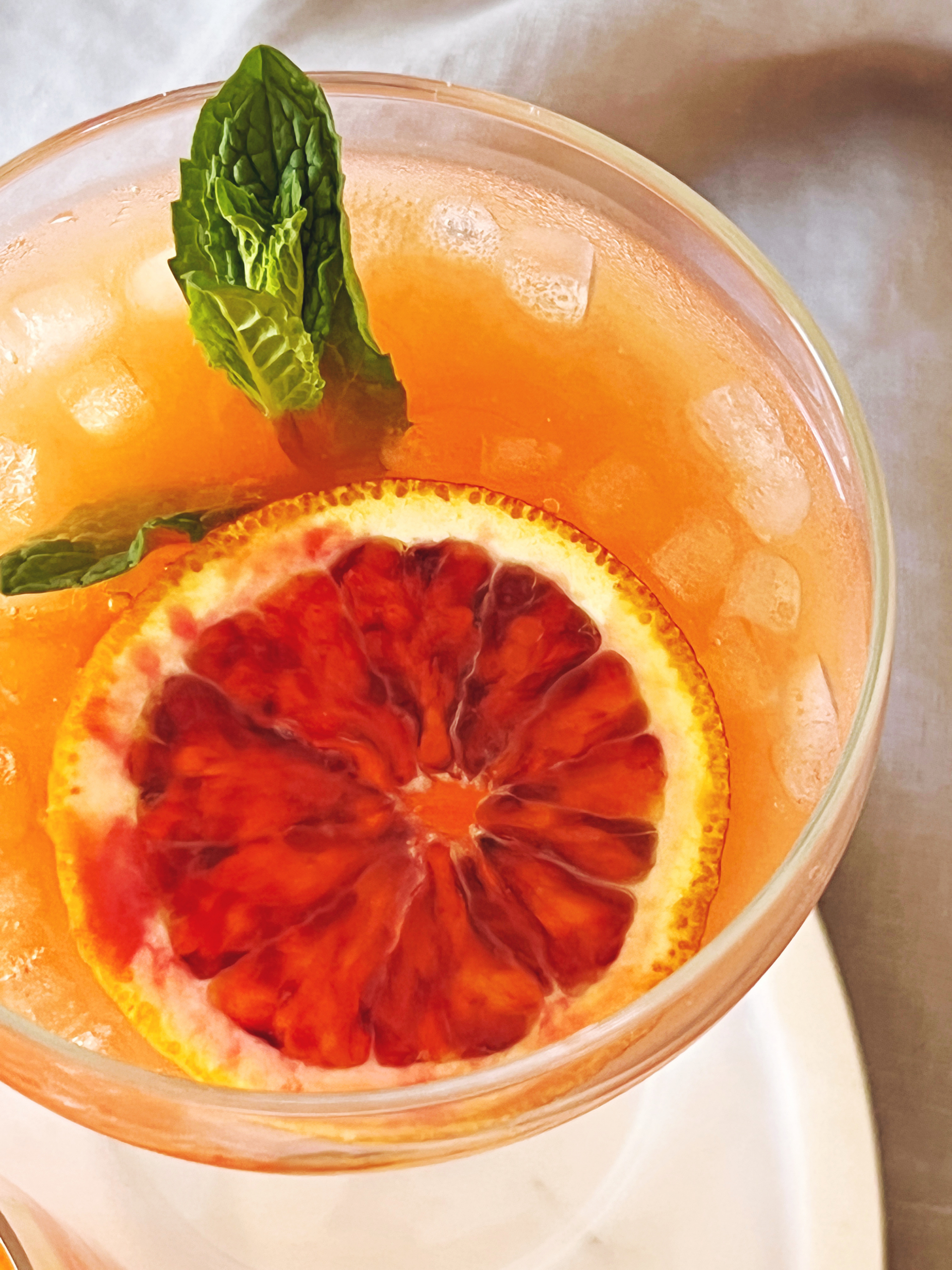While you can pair this beverage with a sprig or two of rosemary for a more savory flavor, we went with slices of blood orange (available at your grocery store) and sprigs of fresh mint which really added to the flavor profile without overpowering it.