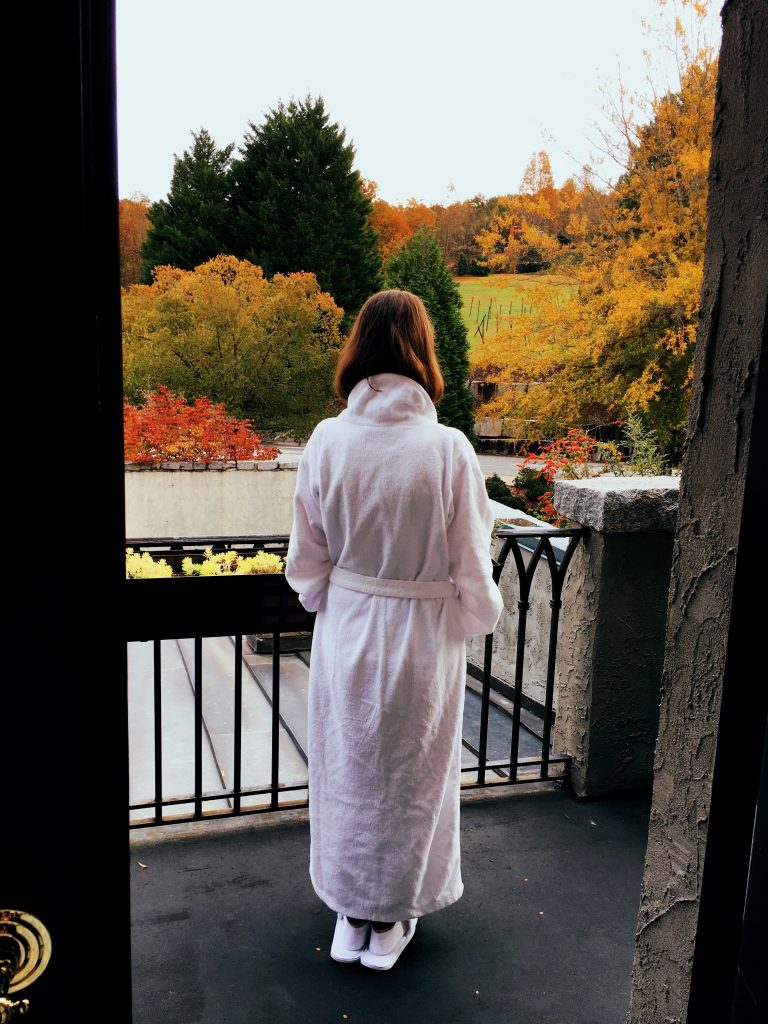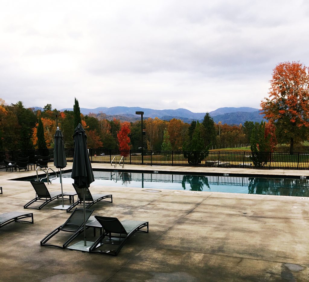 While we waited for our breakfast to arrive, I popped outside to the pool area to capture some of the fall foliage during the brief moments when the sun was attempting to shine through the clouds.