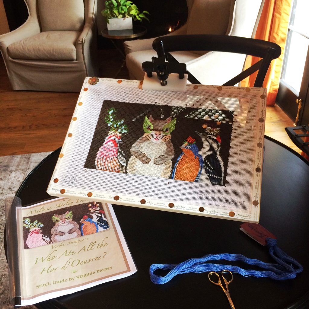 Throughout our stay, mom took the opportunity to stitch on the Melissa Shirley canvas of Vicki Sawyers ‘Who Ate the Hor d’oeuvres. The stitch guide is by Virginia Barney and both the canvas and the stitch guide are available from Needlepoint.com