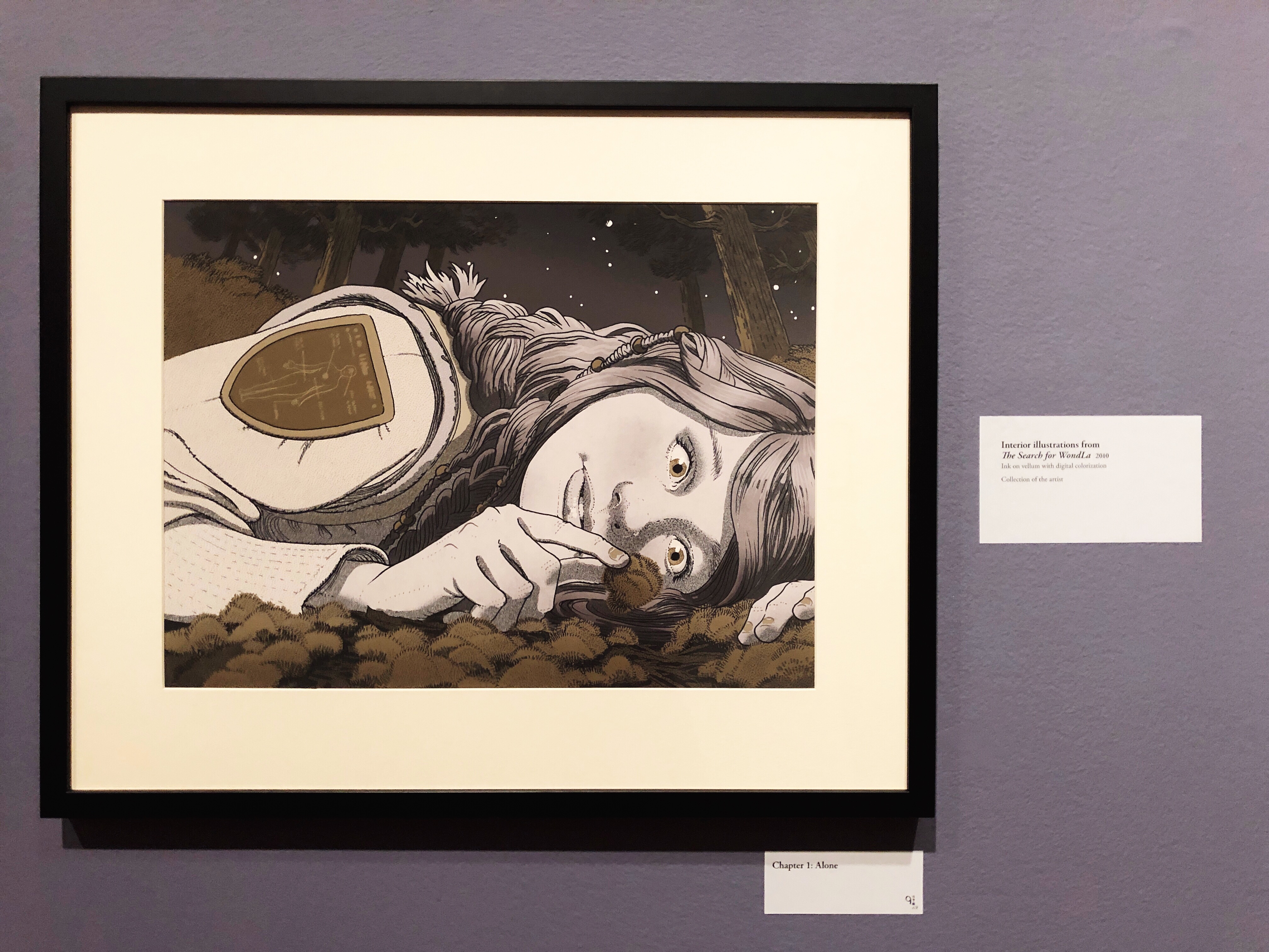 Want to learn more about the drawing process, there are interactive screens that show you Tony’s process step by step. This Interior Illustration from The Search for WondLa (2010) is one of the pieces you can view step by step. The piece is an ink on vellum that has been digitally colorized.