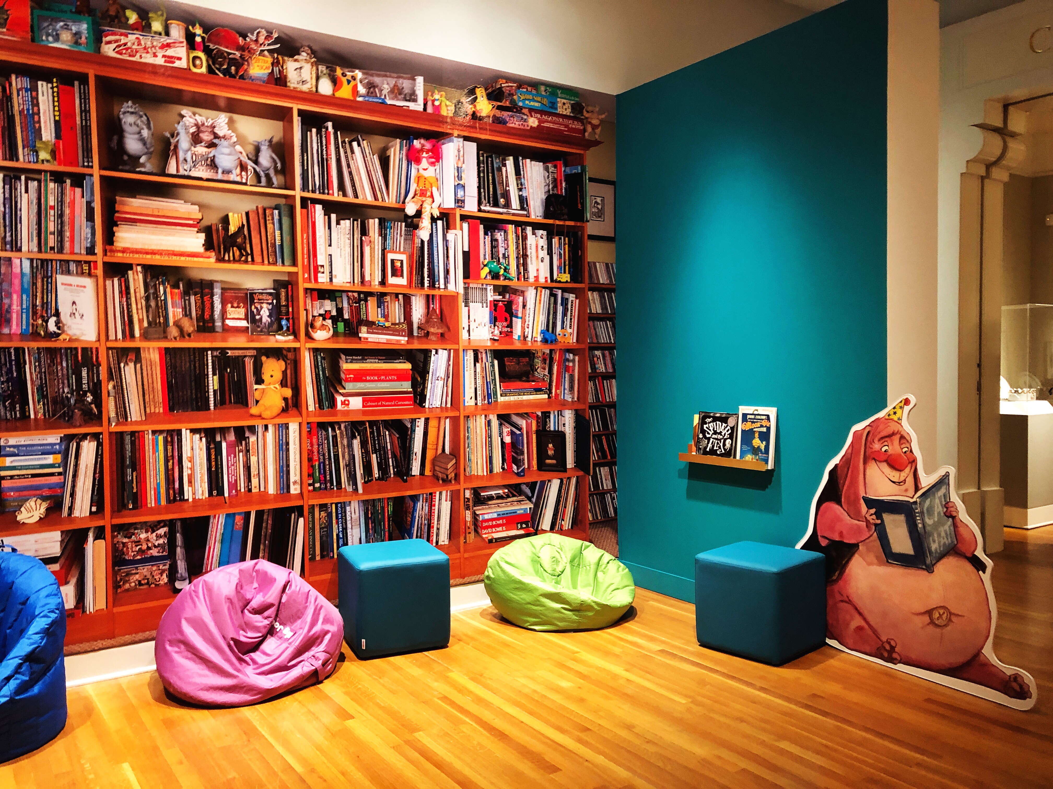 When you first enter the exhibition there is a reading table where you can flip through the books Tony has written or illustrate. Or if you want to stay awhile, there’s a ‘faux’ bookcase with bean bag chairs to give young readers a more comfortable spot to read away a Saturday afternoon.