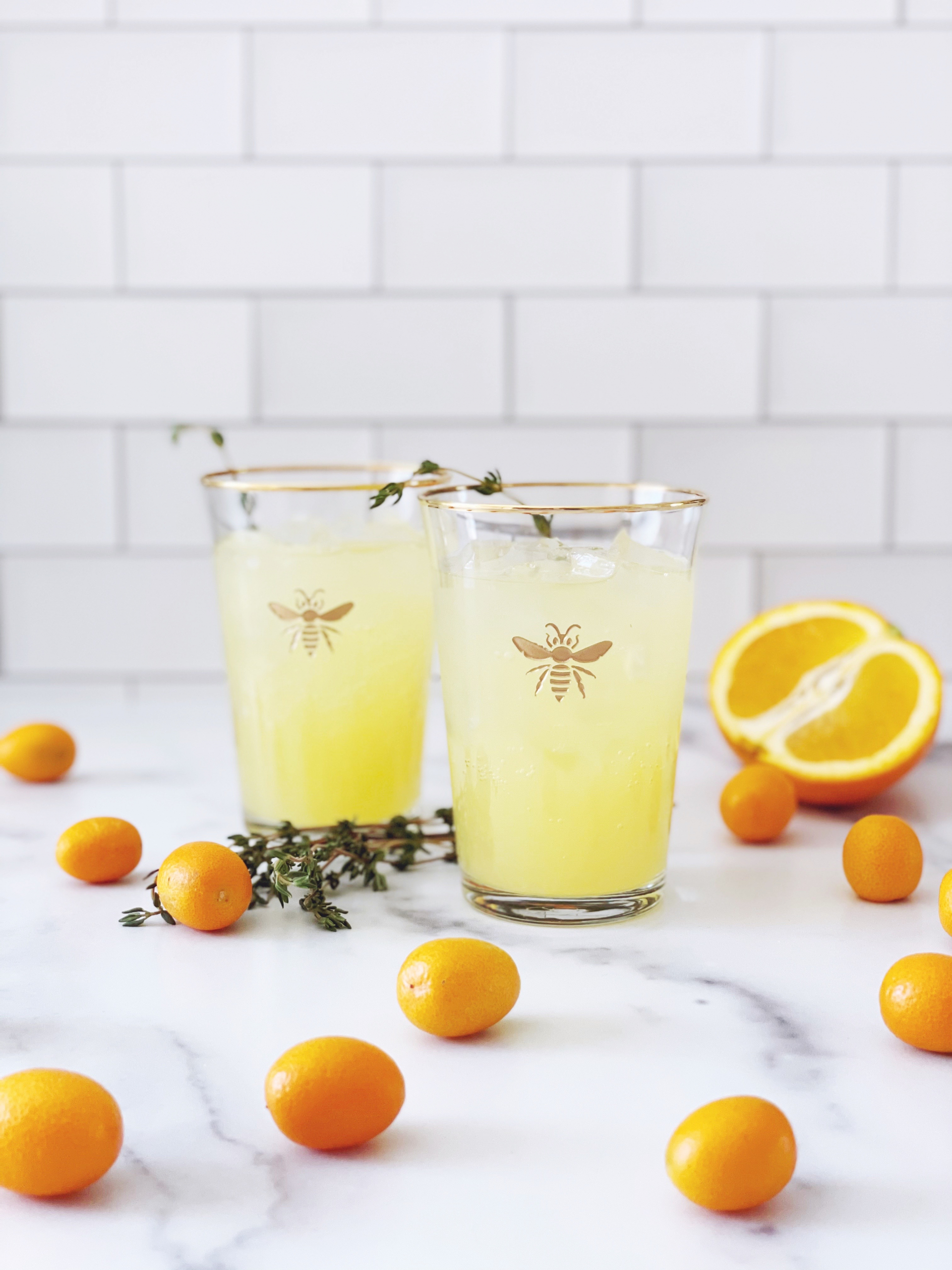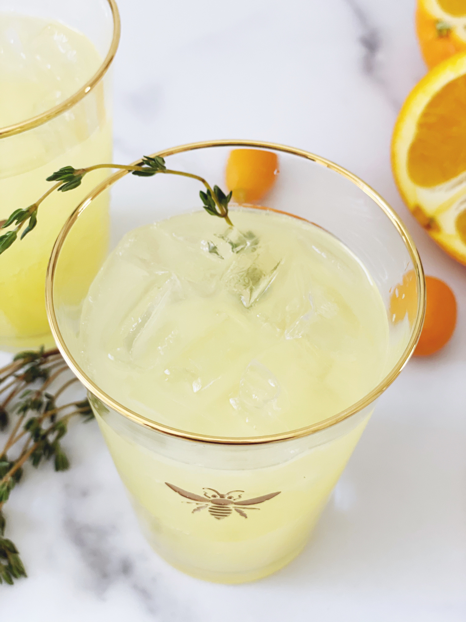 Making these drinks was the perfect way to use the Gold Bee Tumbler Glasses that I picked up from William-Sonoma last month. My mom and I both have an obsession with all things bee, and I thought why not start picking up sets of glasses to feature in the drink series? You can order them (or pick up in store) as single glasses or as a set of four depending on whether you’re just planning on making drinks for two, or you want to use them for a luncheon or dinner party, socially distant of course!