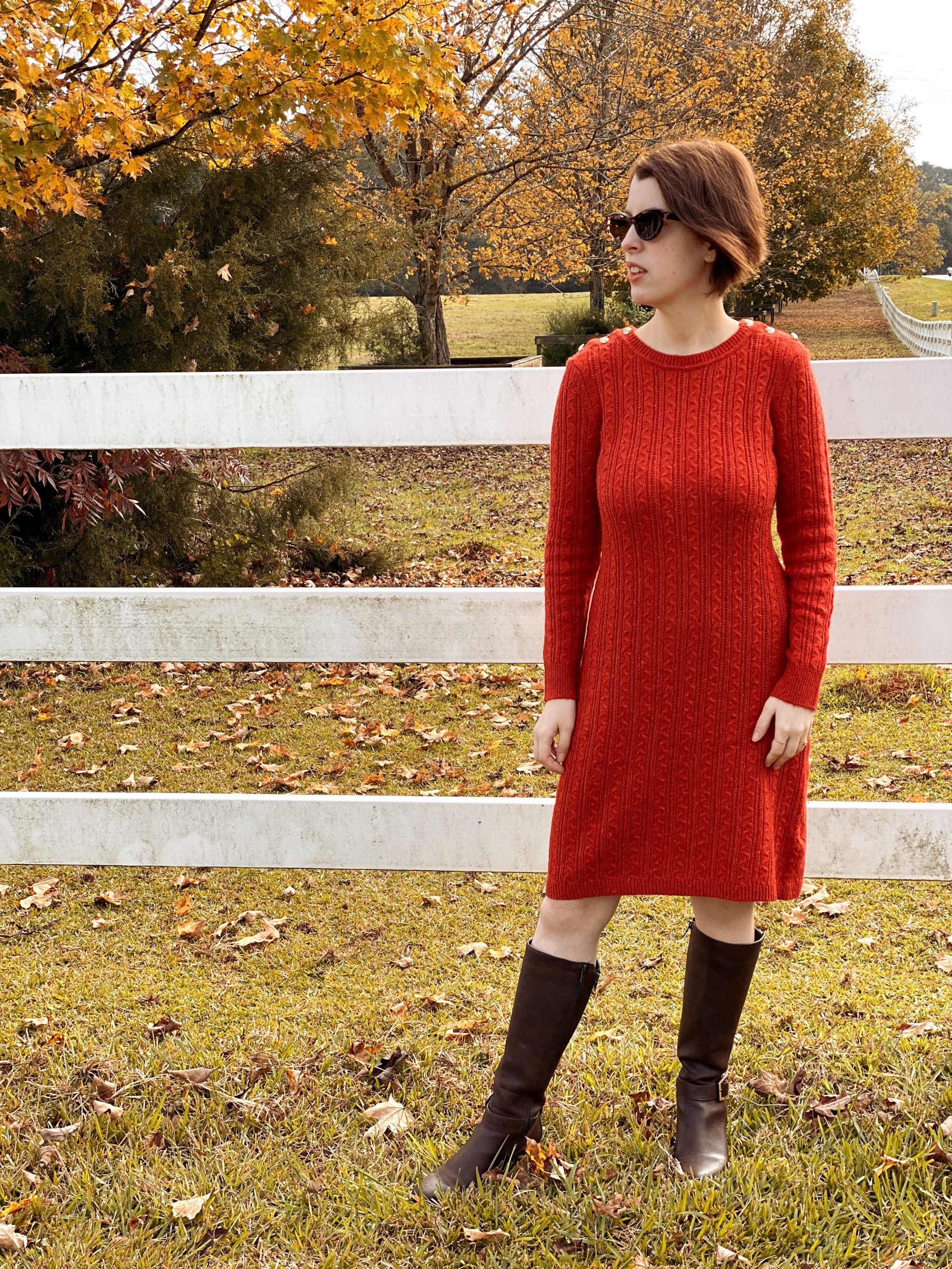 Cableknit Button Shoulder Sweater Dress (Talbots) // Autumn Plaid Wrap (old, similar here) // Boots (old, similar here) // Emilia Tote (Kate Spade, similar here)