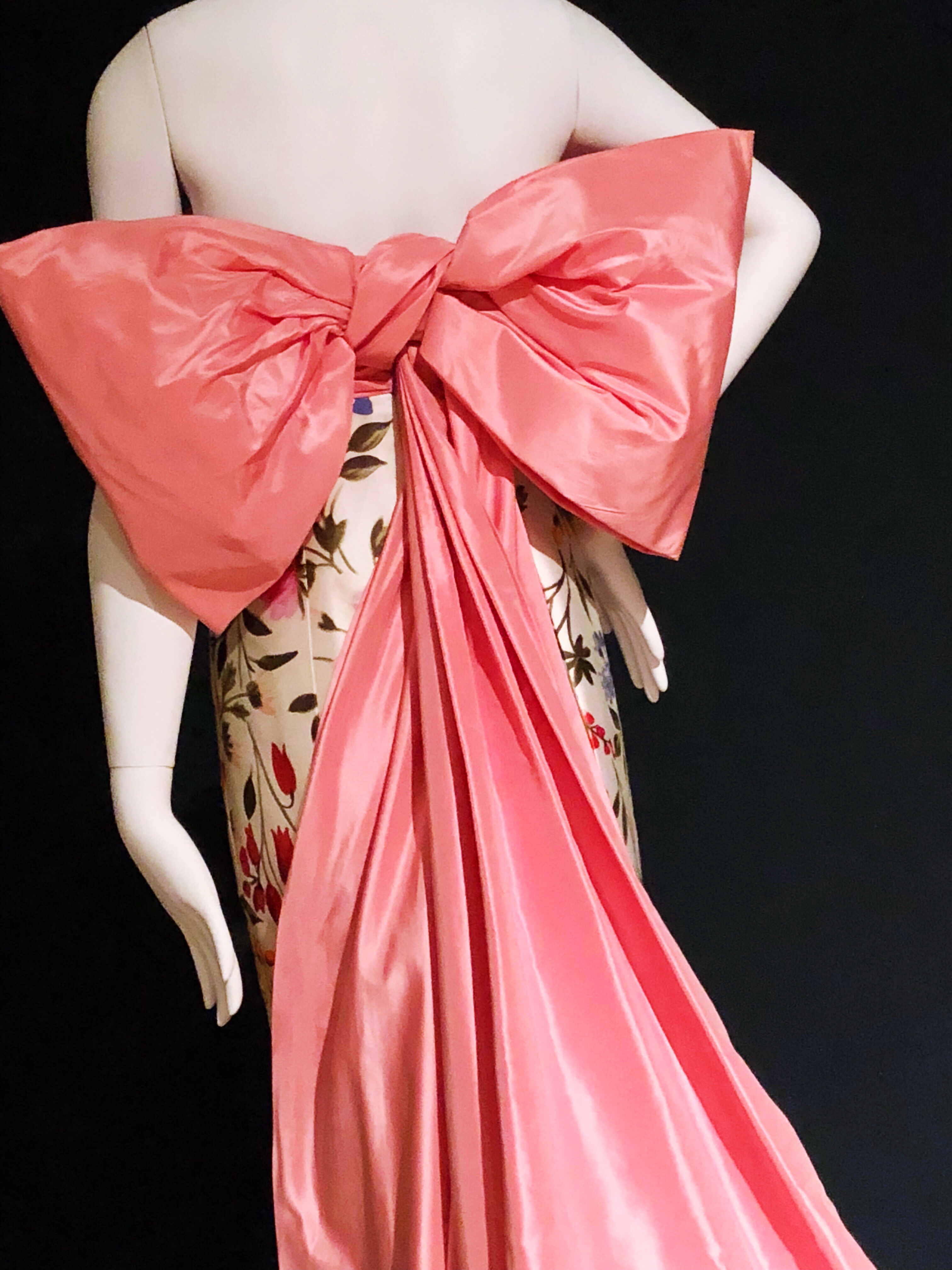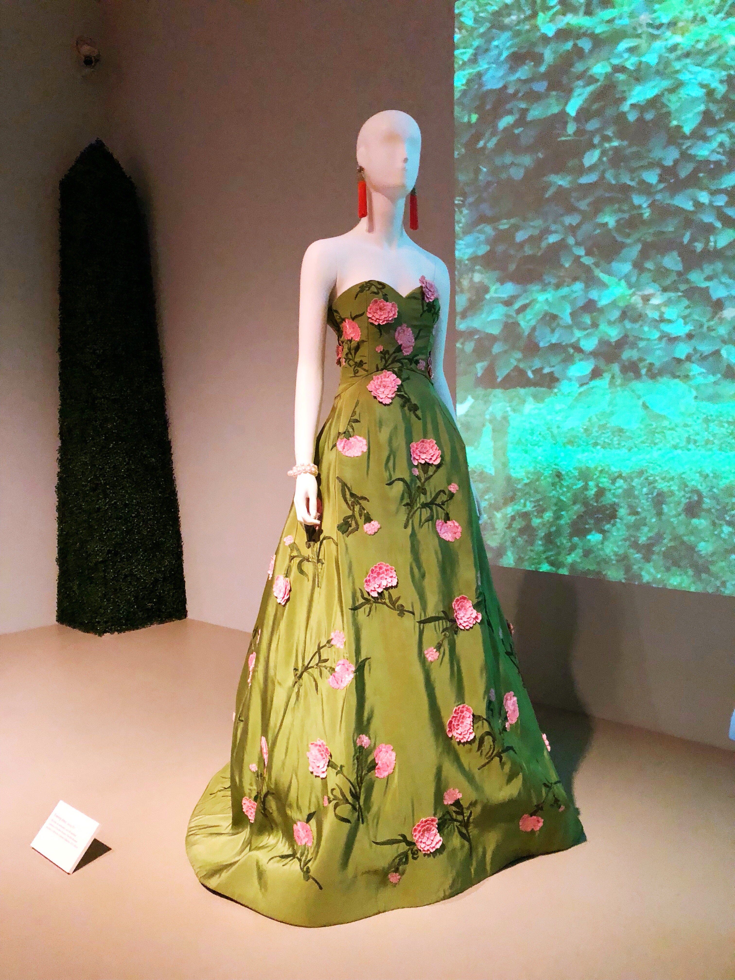 The garden collection was one of my favorites from the exhibition, and featured dresses with floral embroidery and prints with delicate embellishments. In this collection and other’s created by De la Renta, you can see the influences of his love for the 18th century French style of Marie Antoinette and the patterns that were inspired by period French textiles.