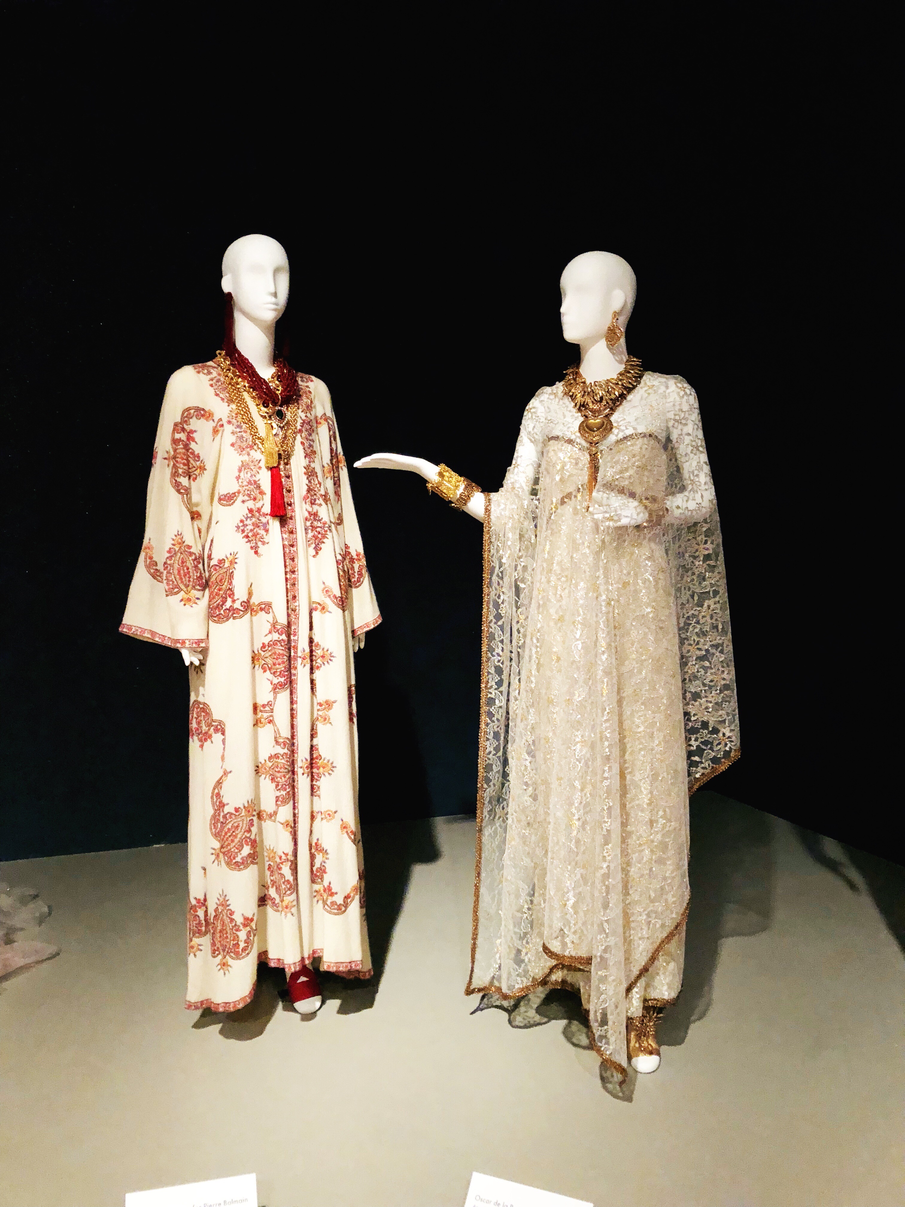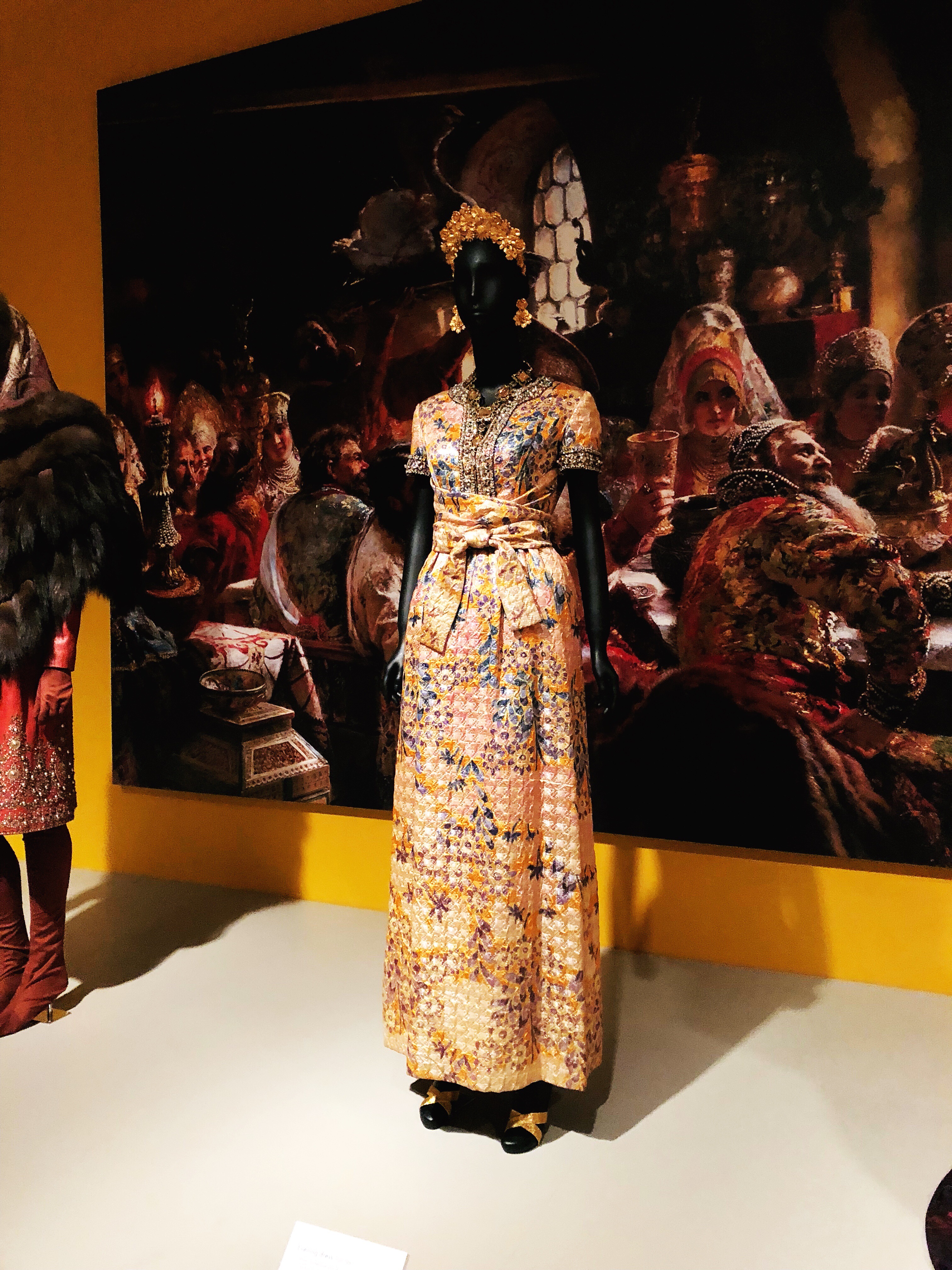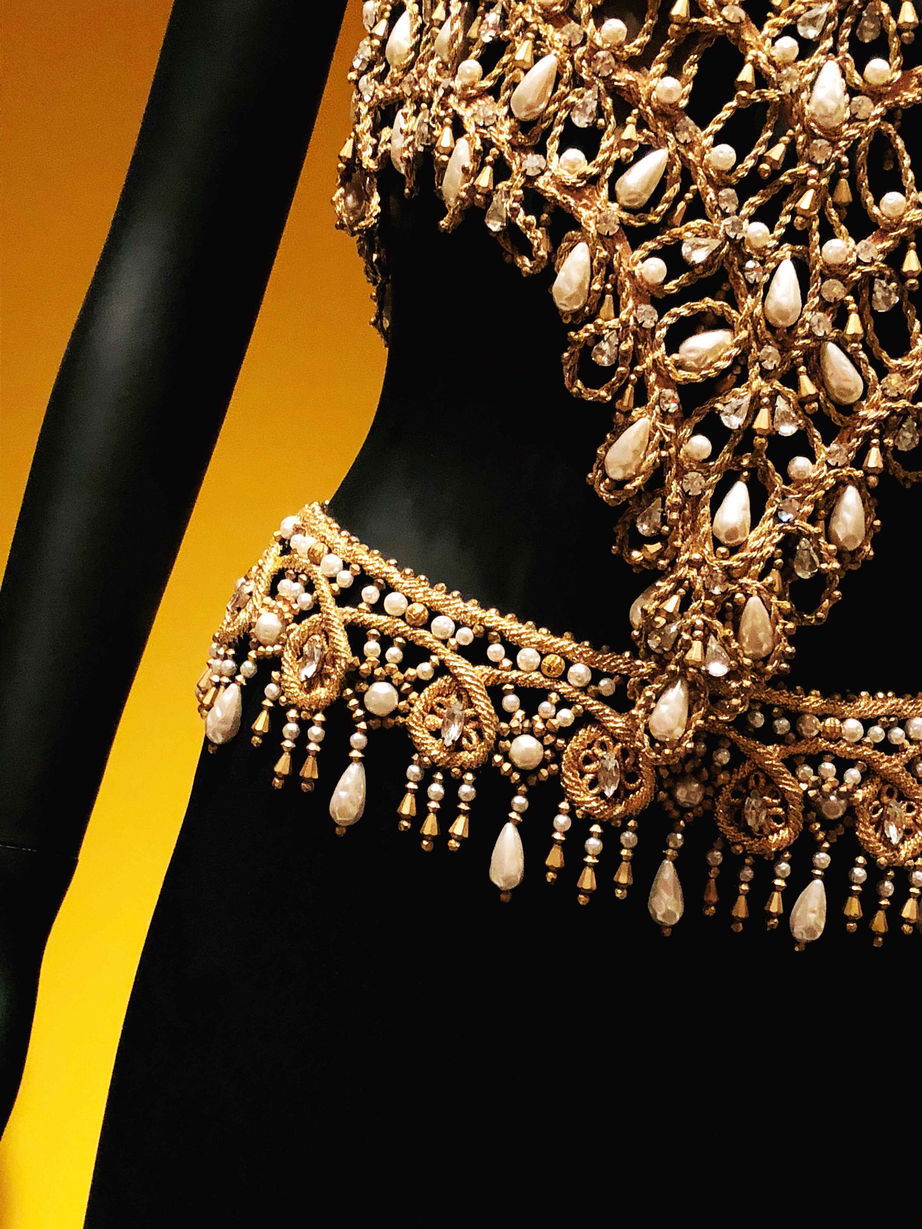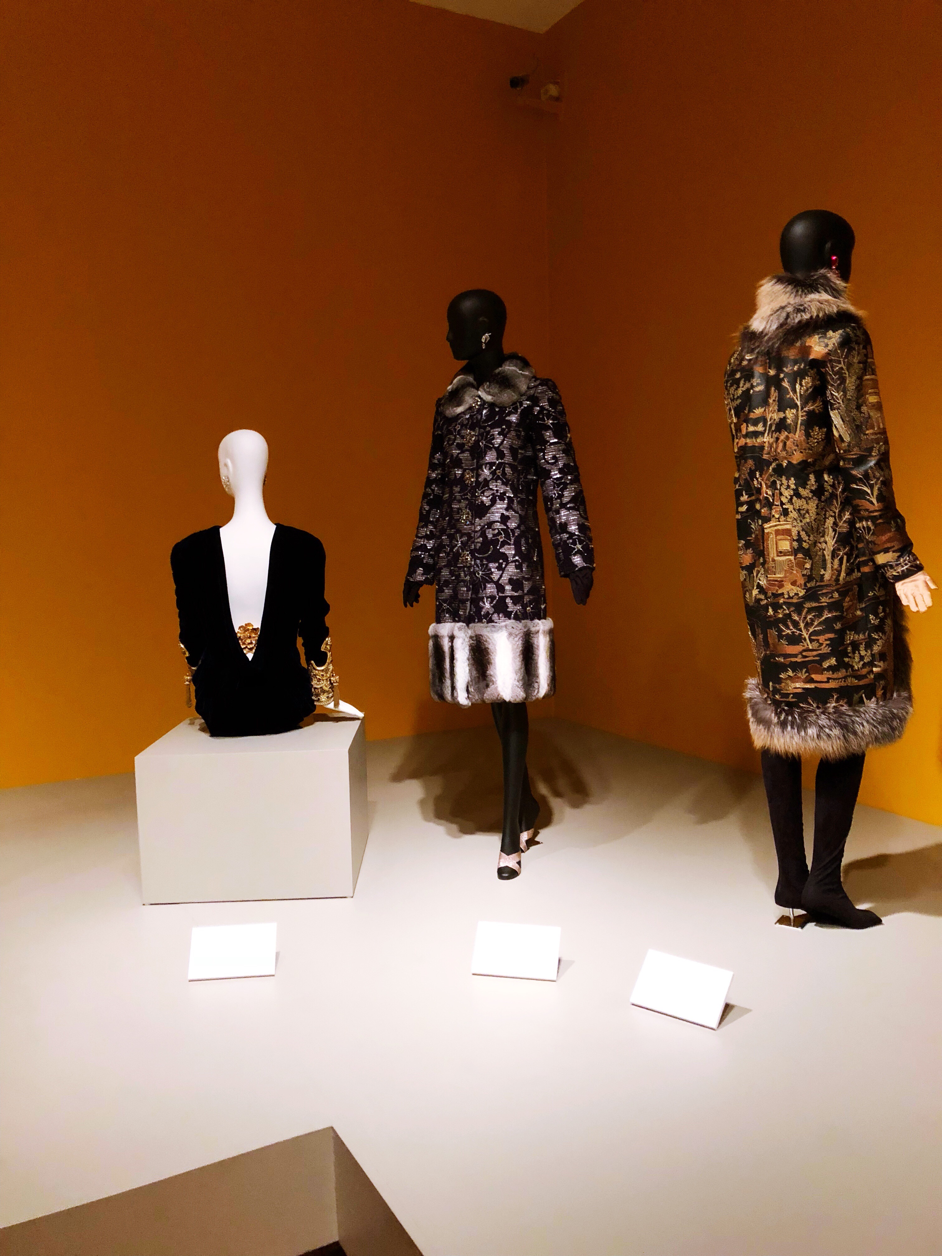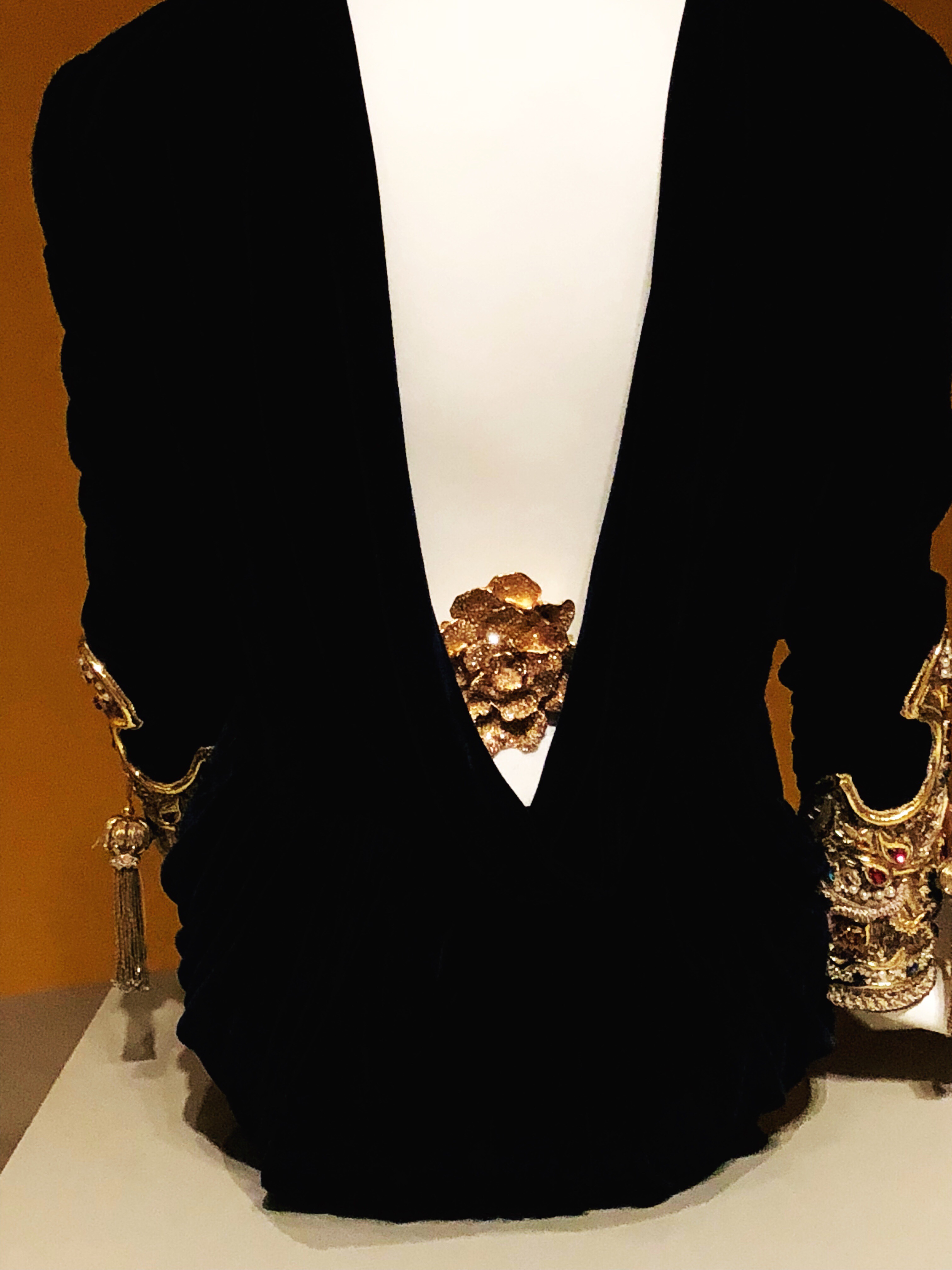 This collection features furs, ornate textiles, and shows off De la Renta’s love for jeweled appliqué and embroidered trims. De la Renta was known to look to cultures from around the world for inspiration in his couture and ready-to-wear pieces, both of which are featured in this part of the exhibition.