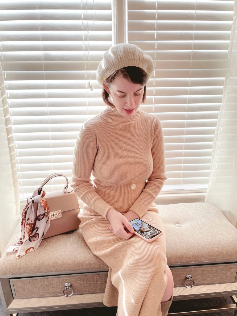 Ribbed Midi Sweater Dress (LOFT, sold out. Similar look here, here & here) // Boots (Sole Society old, similar here) // Small French Twist Huggie (STUDS) // Knit Beret (old, similar here) // Amalfi Bloom Bag (Deux Peches via Crossings on Main, sold out, in Cognac here) // Mona Ring (Linjer)