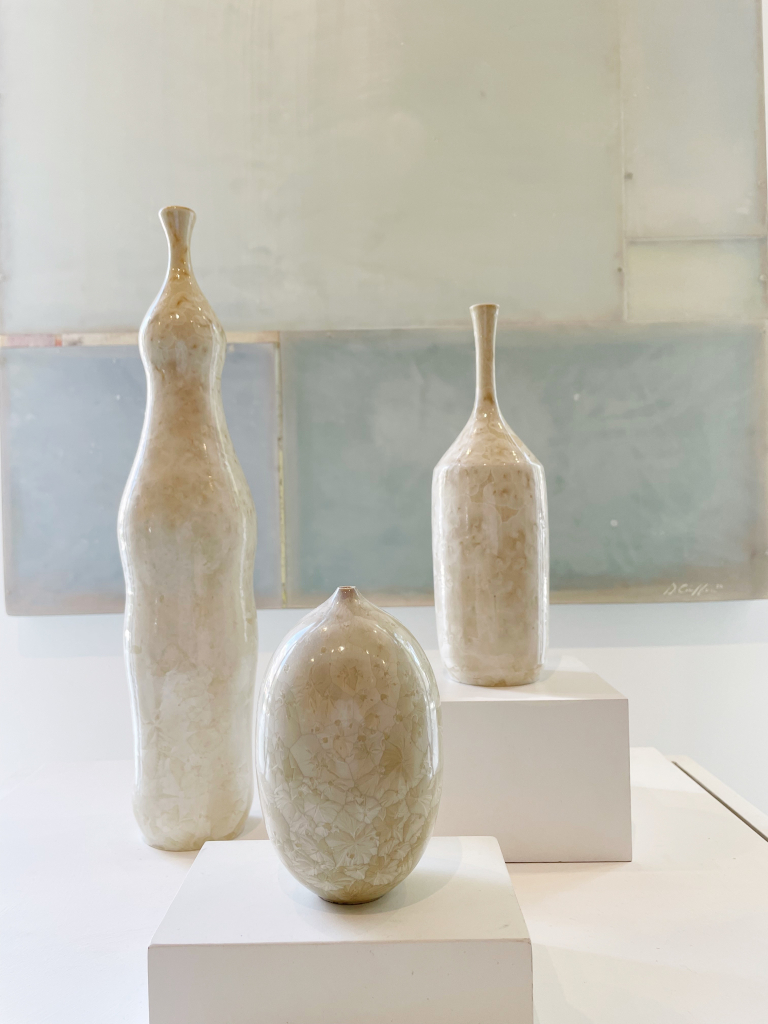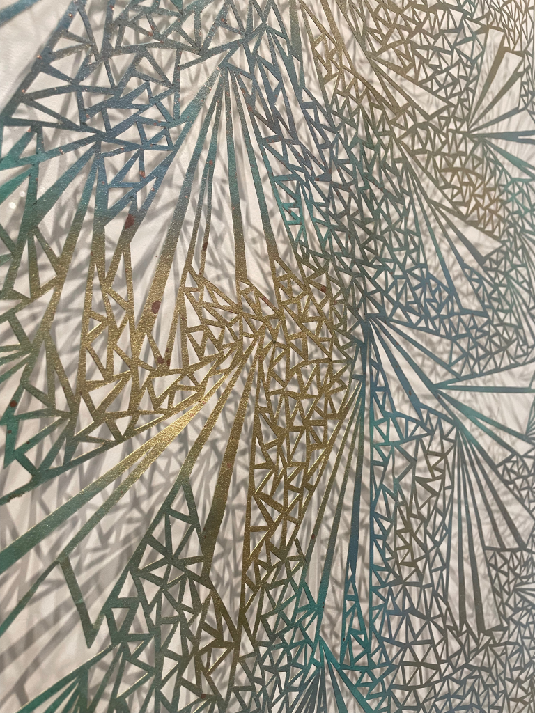 MICROCOSM is the newest exhibition to open at the ANFA Gallery and features work by Stuart Coleman Budd and Meredith Connelly. The exhibition explores the intersections between art and nature, and it’s one of our favorite exhibitions to date. We’ve always enjoyed Stuart Coleman Budd’s work and the sense of calm that it brings as you view it and I loved seeing Meredith Connelly’s work for the first time. Her work is made from layers of misted metallic and bright colored paint on brown paperthat are hand-cut into patterns of microcosms and biological forms and are then placed between two layers of glass. the infrastructure for cut patterns reflective of microcosms and biological forms.