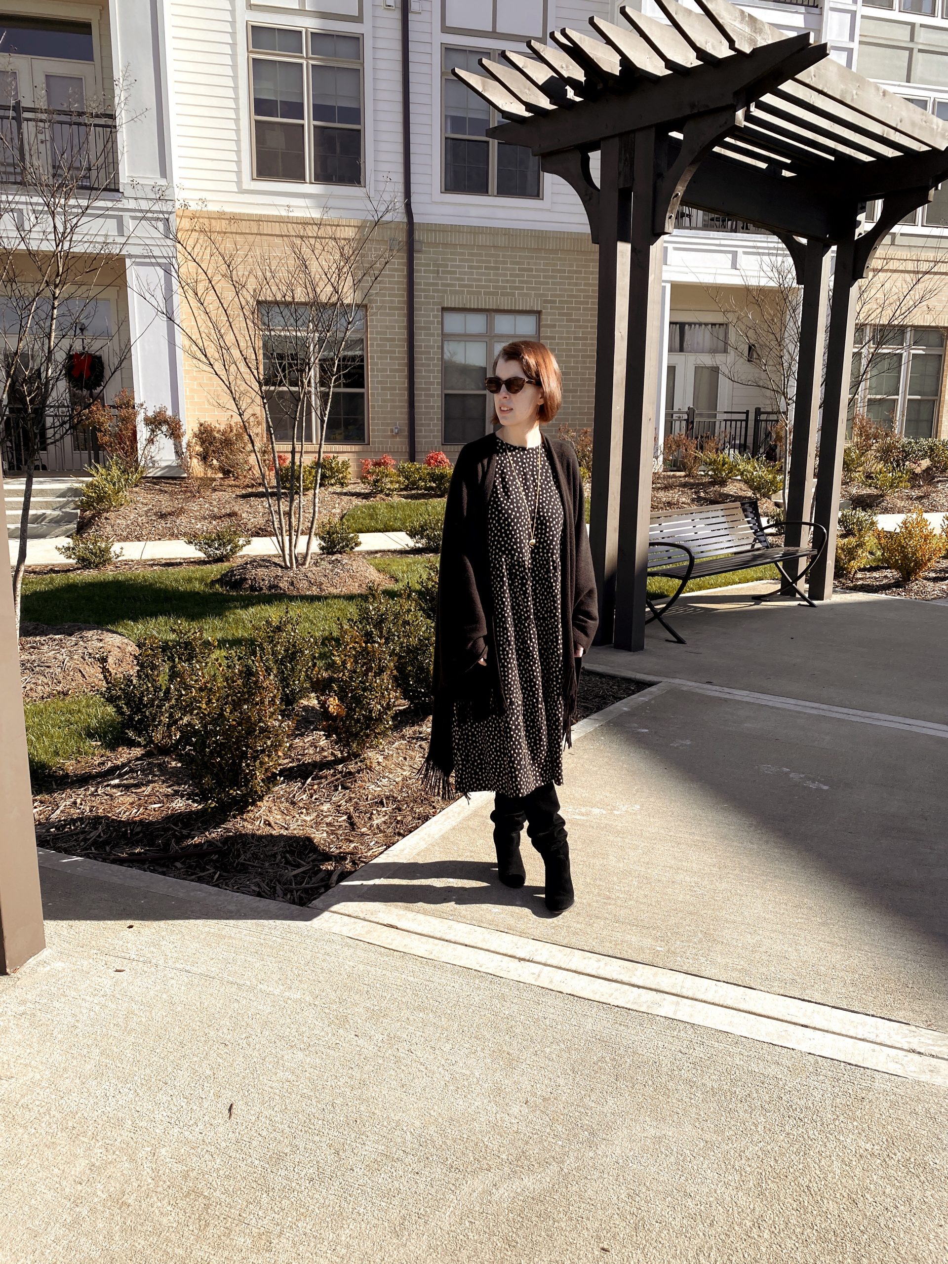 Since it was an especially cold day when I shot these pictures my shawl is hiding the 3/4 sleeves on this midi dress, but I enjoy a 3/4 sleeve option and there are quite a few shoe option to pair with this particular dress due to the silhouette and length. I paired it with a knee high boot in faux suede (similar here and here) but I would also pair it with booties and tights, and these sweet bow flats that I picked up from a little boutique near my house (similar from Amazon). The bow flats would make this dress the perfect option for an intimate family gathering around the holidays. I’ll be wearing it with my bow flats the day after Christmas when my sister and niece come to visit for a belated Christmas celebration.